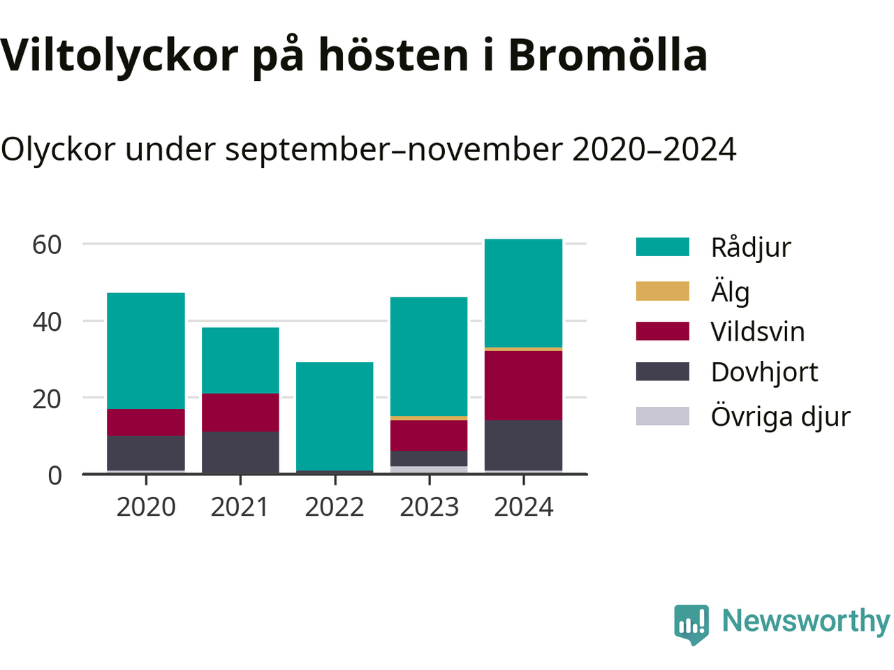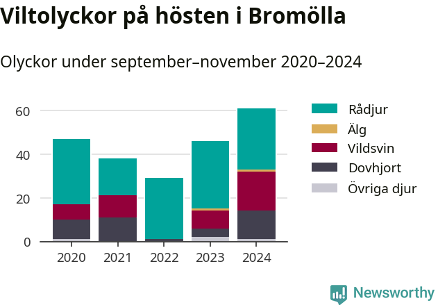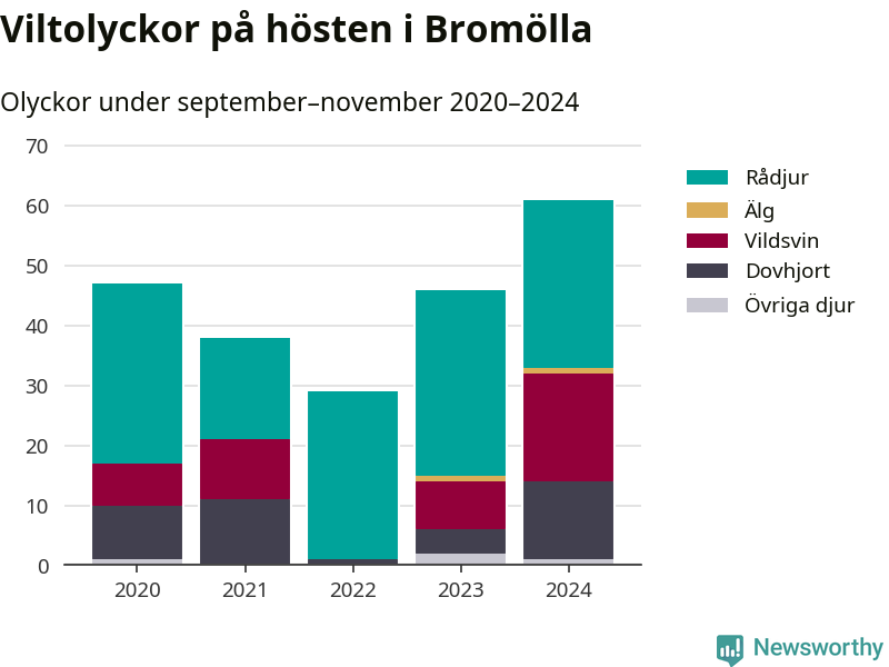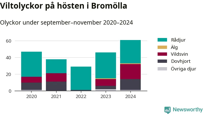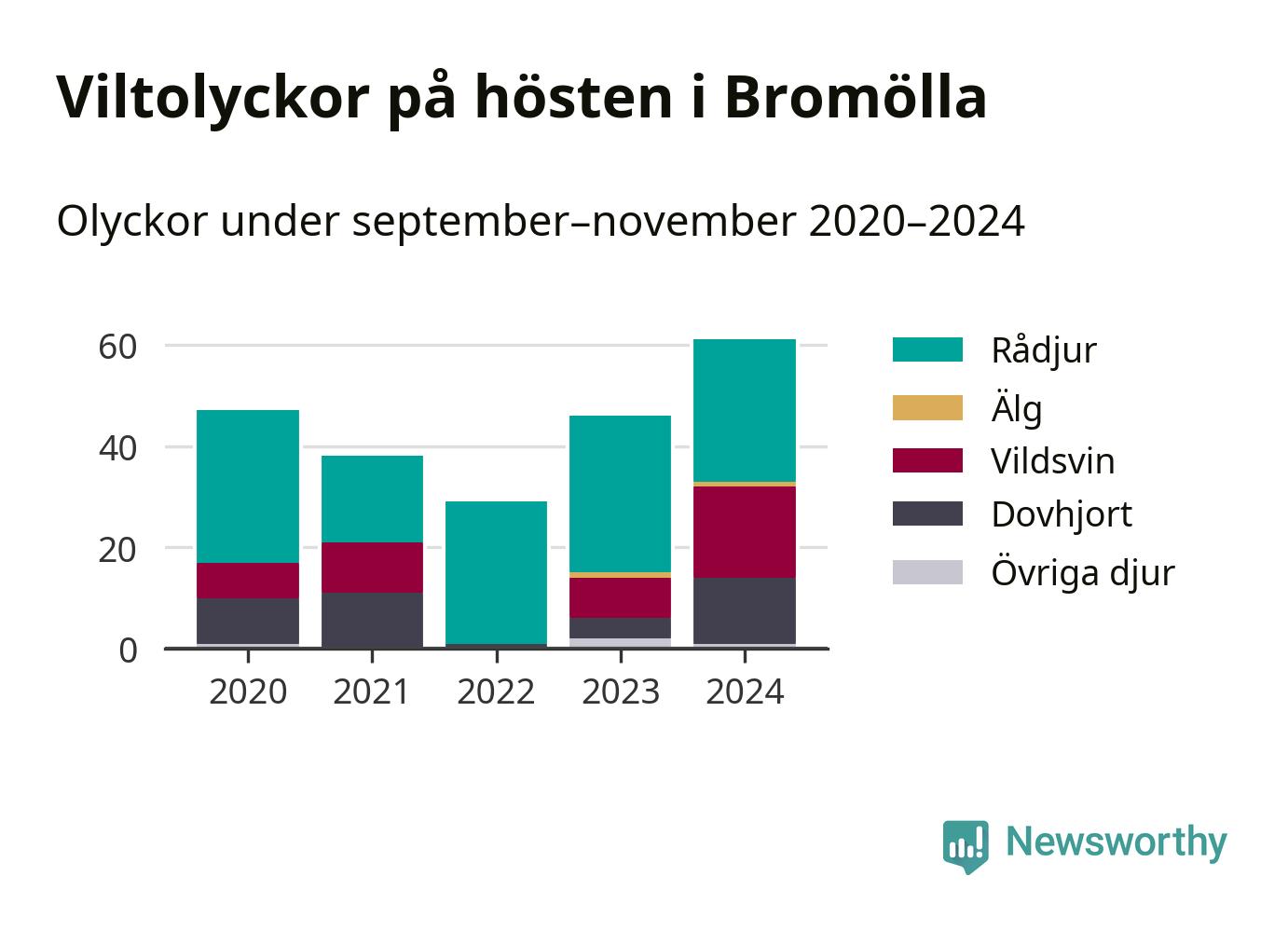 Under de senaste höstarna har antalet viltolyckor ökat i Sverige. I fjol höst noterades också flest viltolyckor i Bromölla hittills under 2020-talet, totalt 61 stycken.
