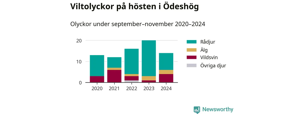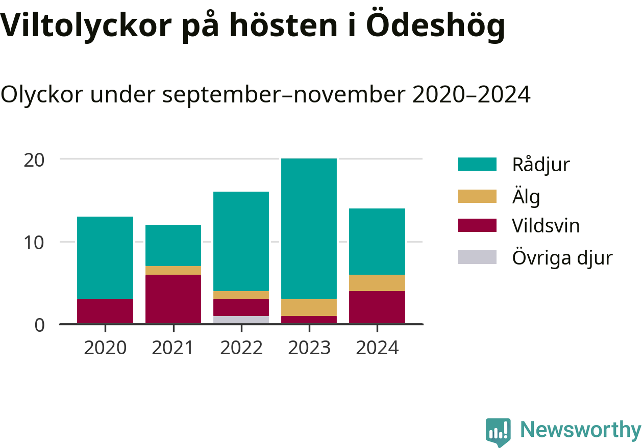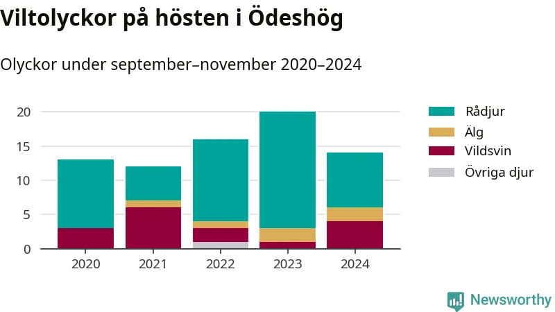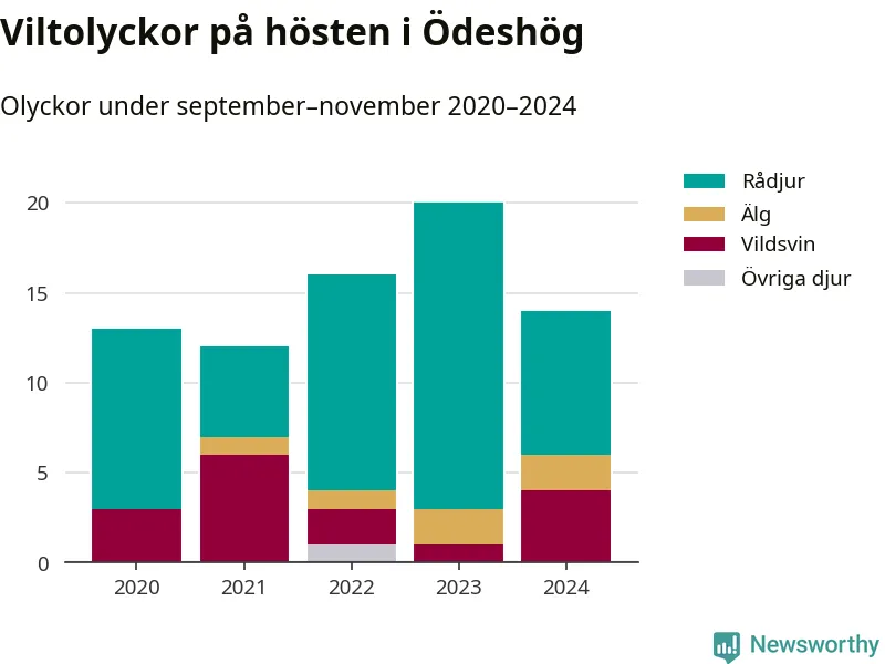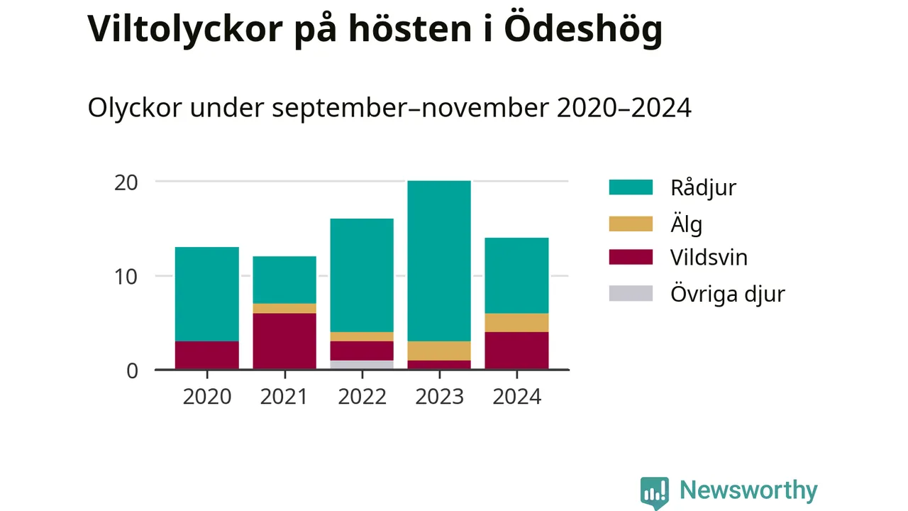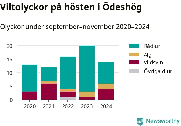 Under de senaste höstarna har antalet viltolyckor ökat i Sverige. Den höst med flest viltolyckor i Ödeshög hittills under 2020-talet var 2023, 20 olyckor. I fjol höst rapporterades totalt 14 olyckor.