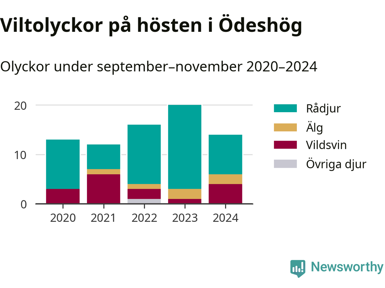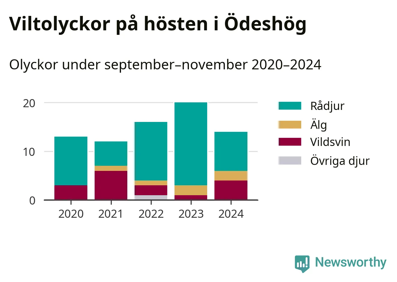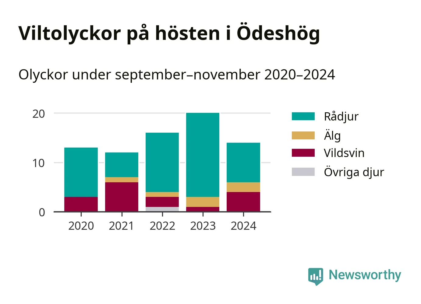 Under de senaste höstarna har antalet viltolyckor ökat i Sverige. Den höst med flest viltolyckor i Ödeshög hittills under 2020-talet var 2023, 20 olyckor. I fjol höst rapporterades totalt 14 olyckor.