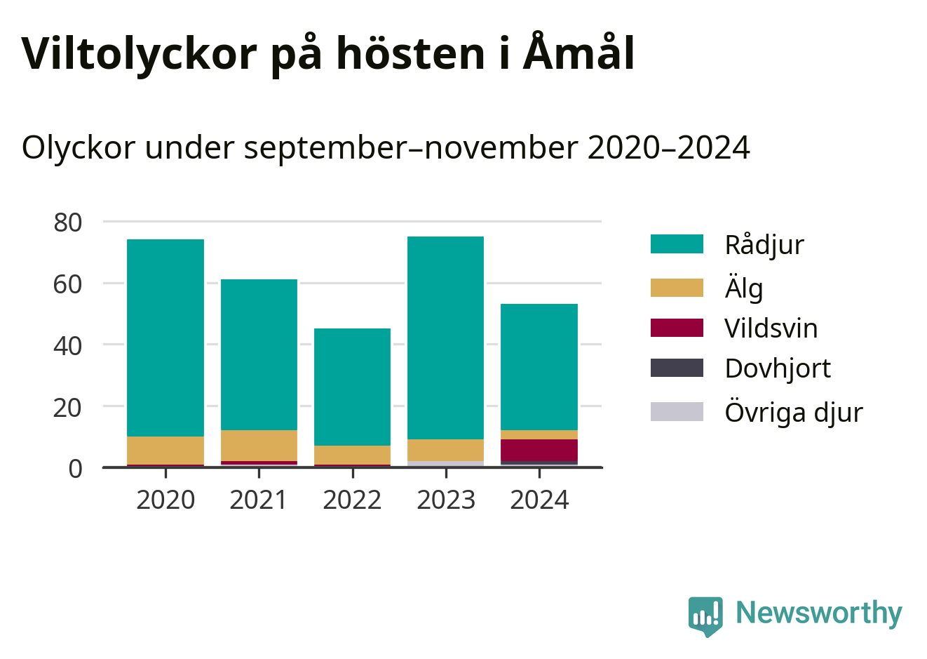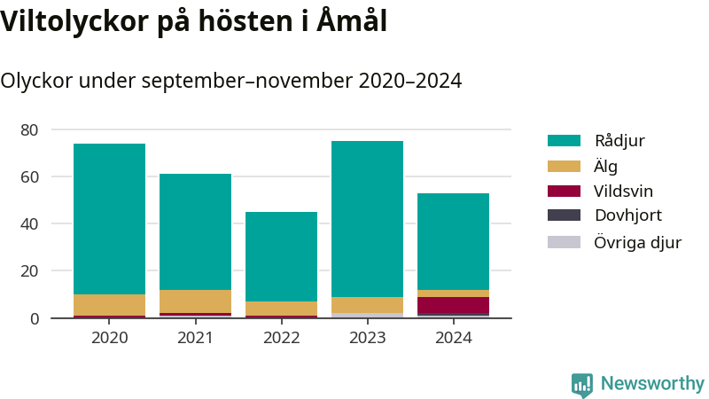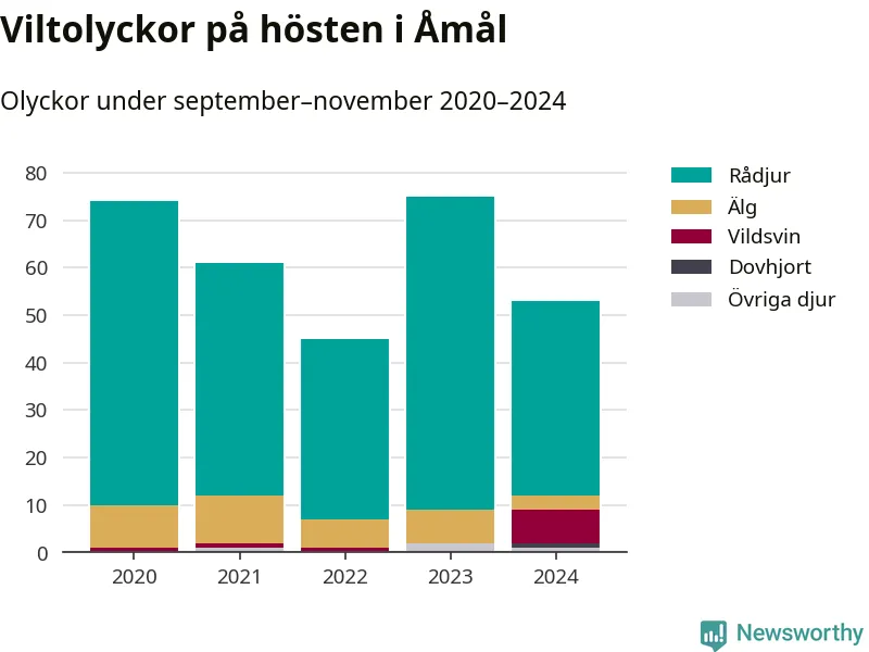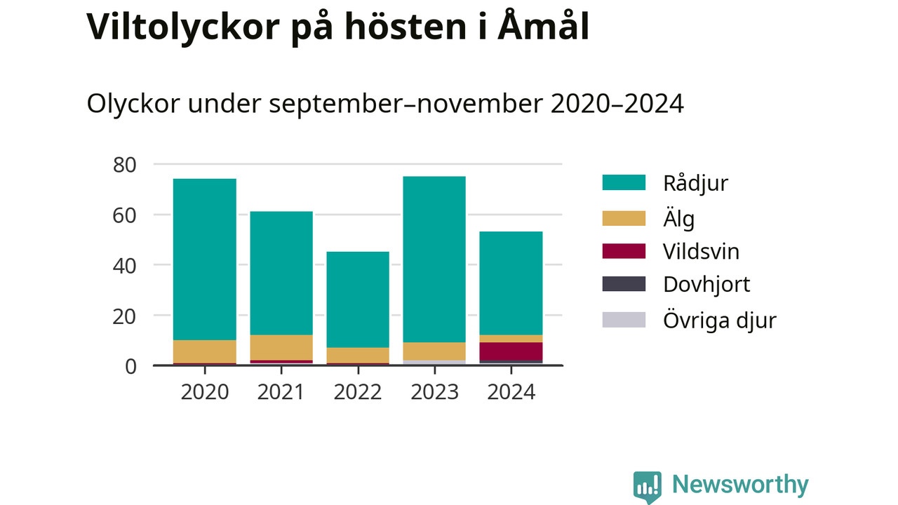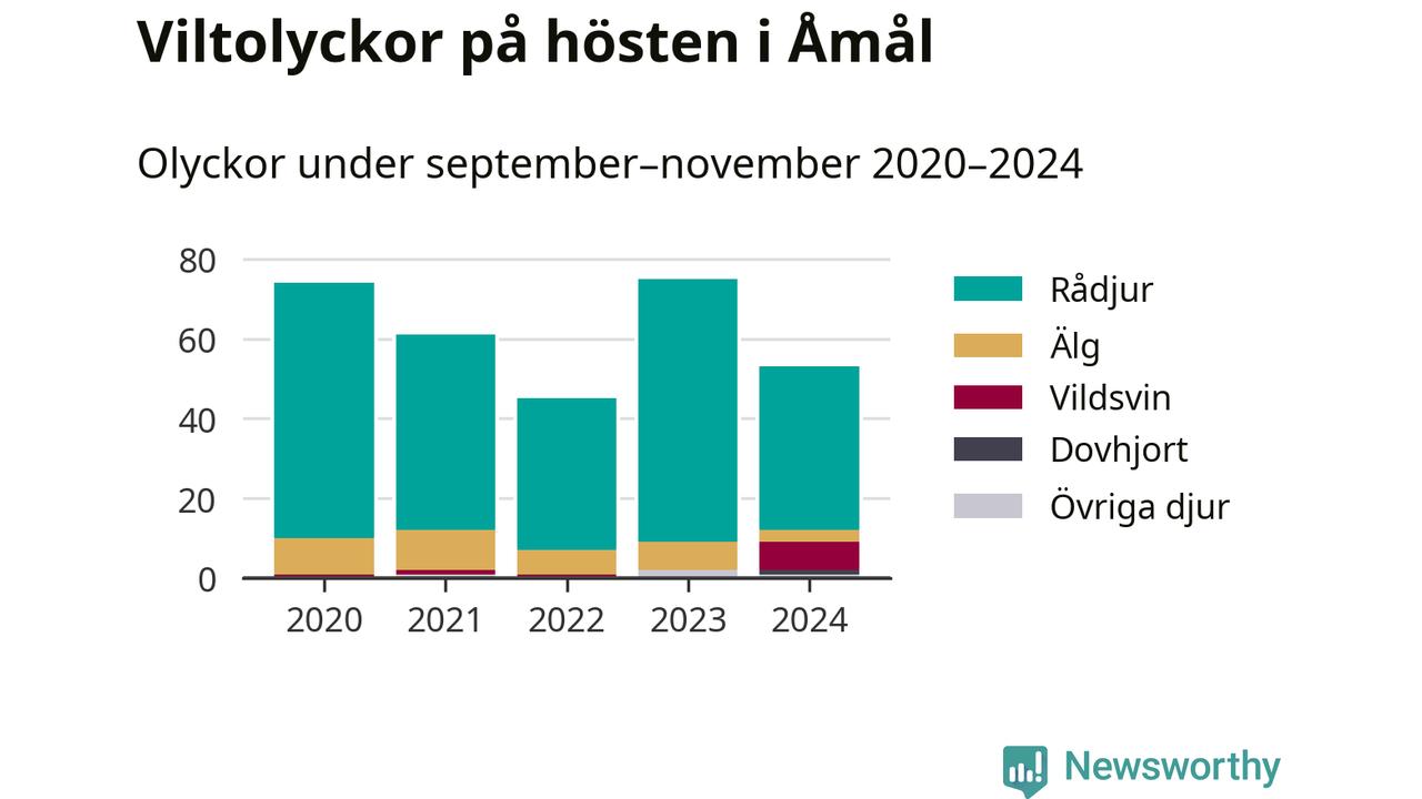 Under de senaste höstarna har antalet viltolyckor ökat i Sverige. Den höst med flest viltolyckor i Åmål hittills under 2020-talet var 2023, 75 olyckor. I fjol höst rapporterades totalt 53 olyckor.