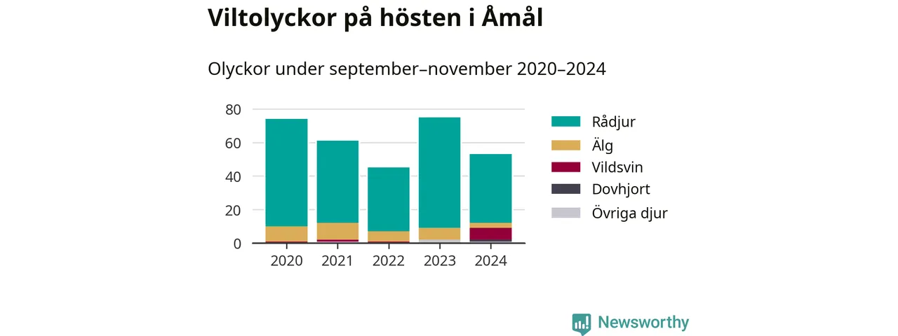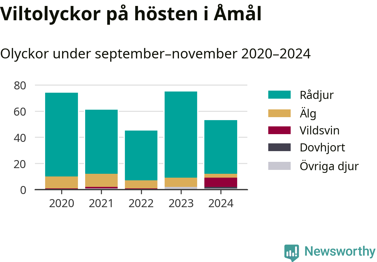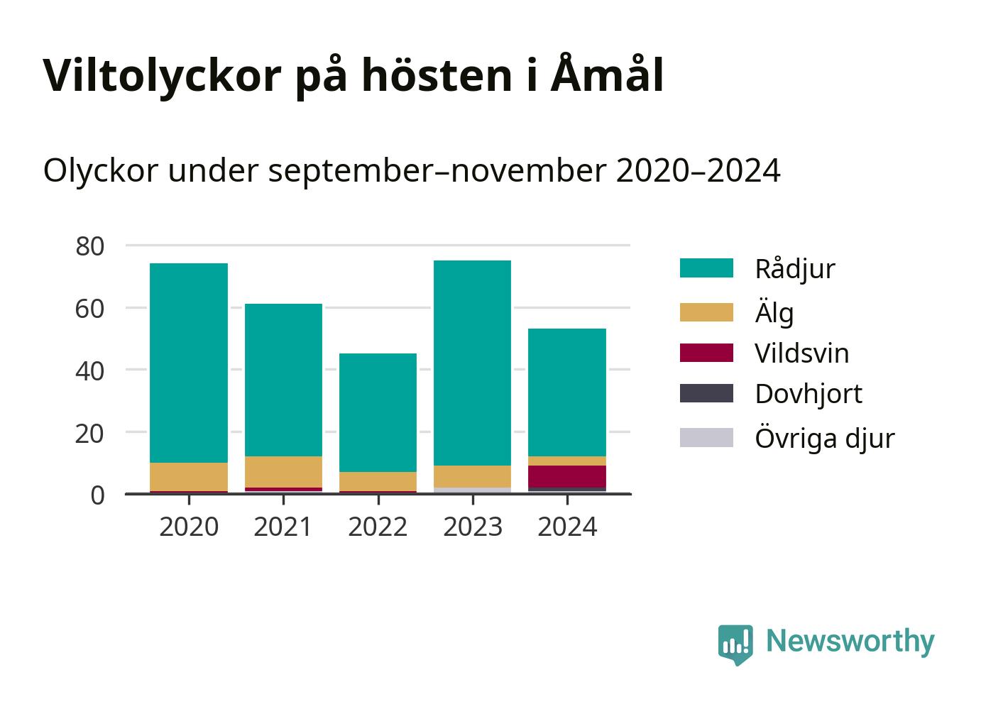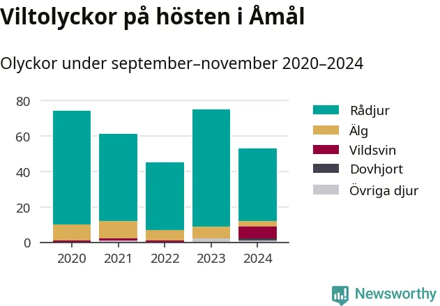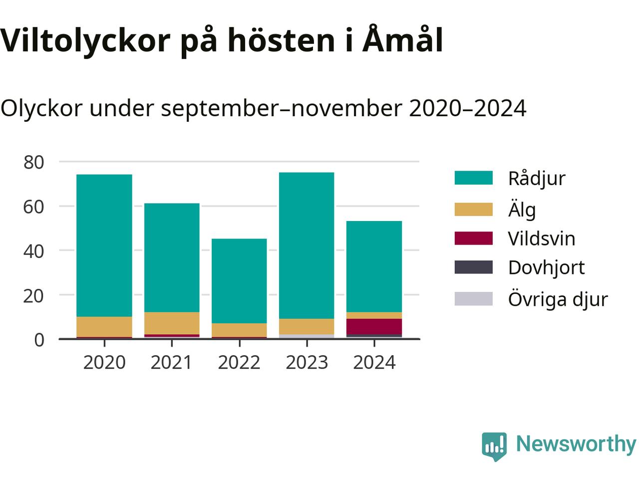 Under de senaste höstarna har antalet viltolyckor ökat i Sverige. Den höst med flest viltolyckor i Åmål hittills under 2020-talet var 2023, 75 olyckor. I fjol höst rapporterades totalt 53 olyckor.