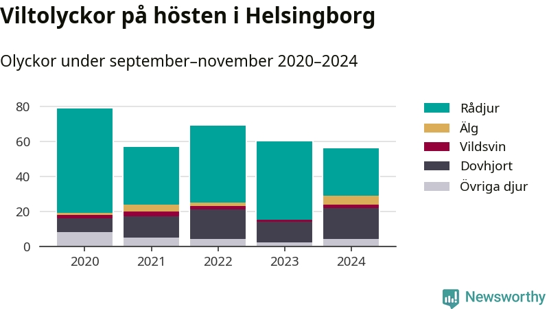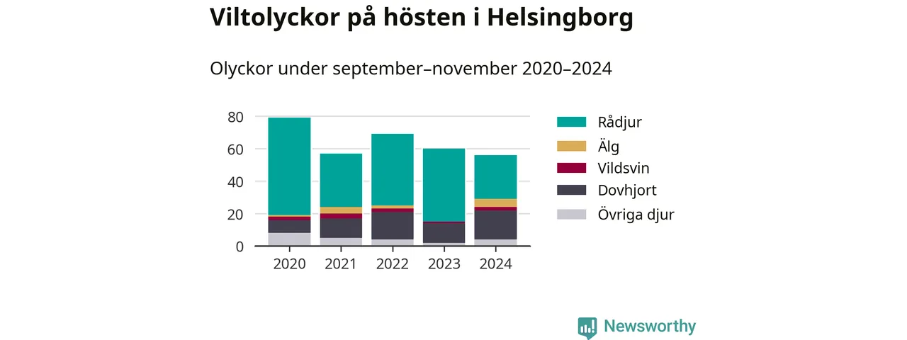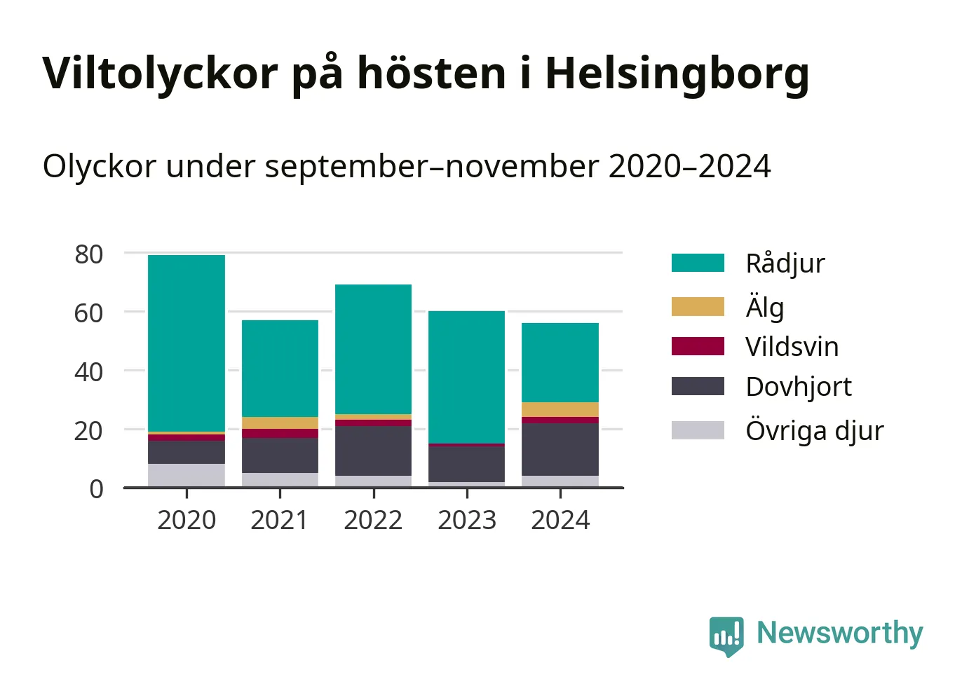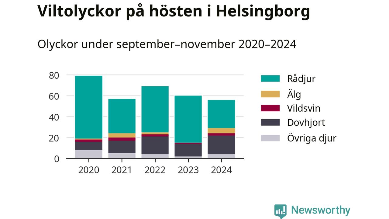 Under de senaste höstarna har antalet viltolyckor ökat i Sverige. I fjol höst noterades dock färst viltolyckor i Helsingborg hittills under 2020-talet, totalt 56 stycken.