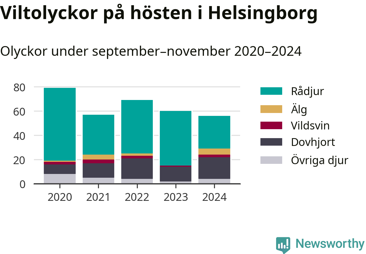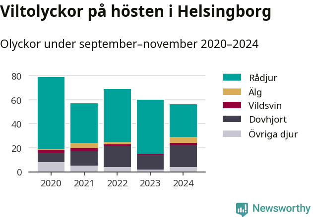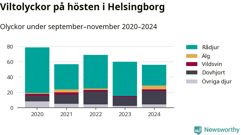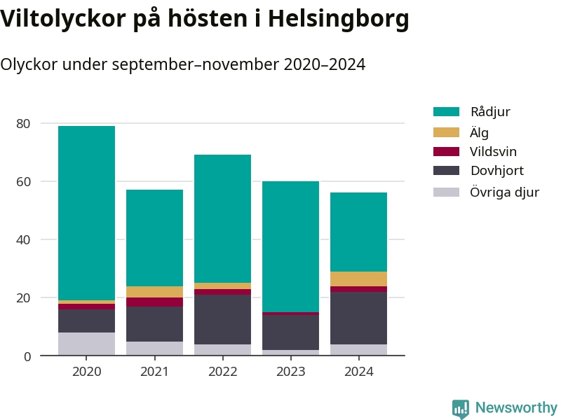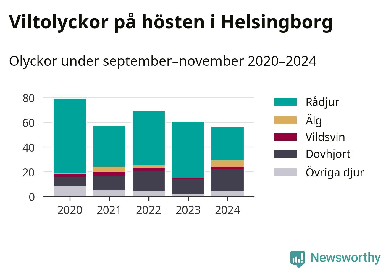 Under de senaste höstarna har antalet viltolyckor ökat i Sverige. I fjol höst noterades dock färst viltolyckor i Helsingborg hittills under 2020-talet, totalt 56 stycken.