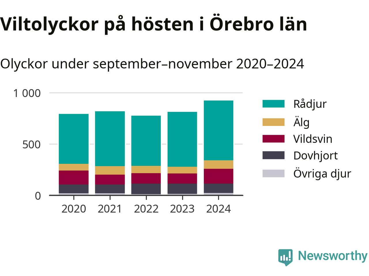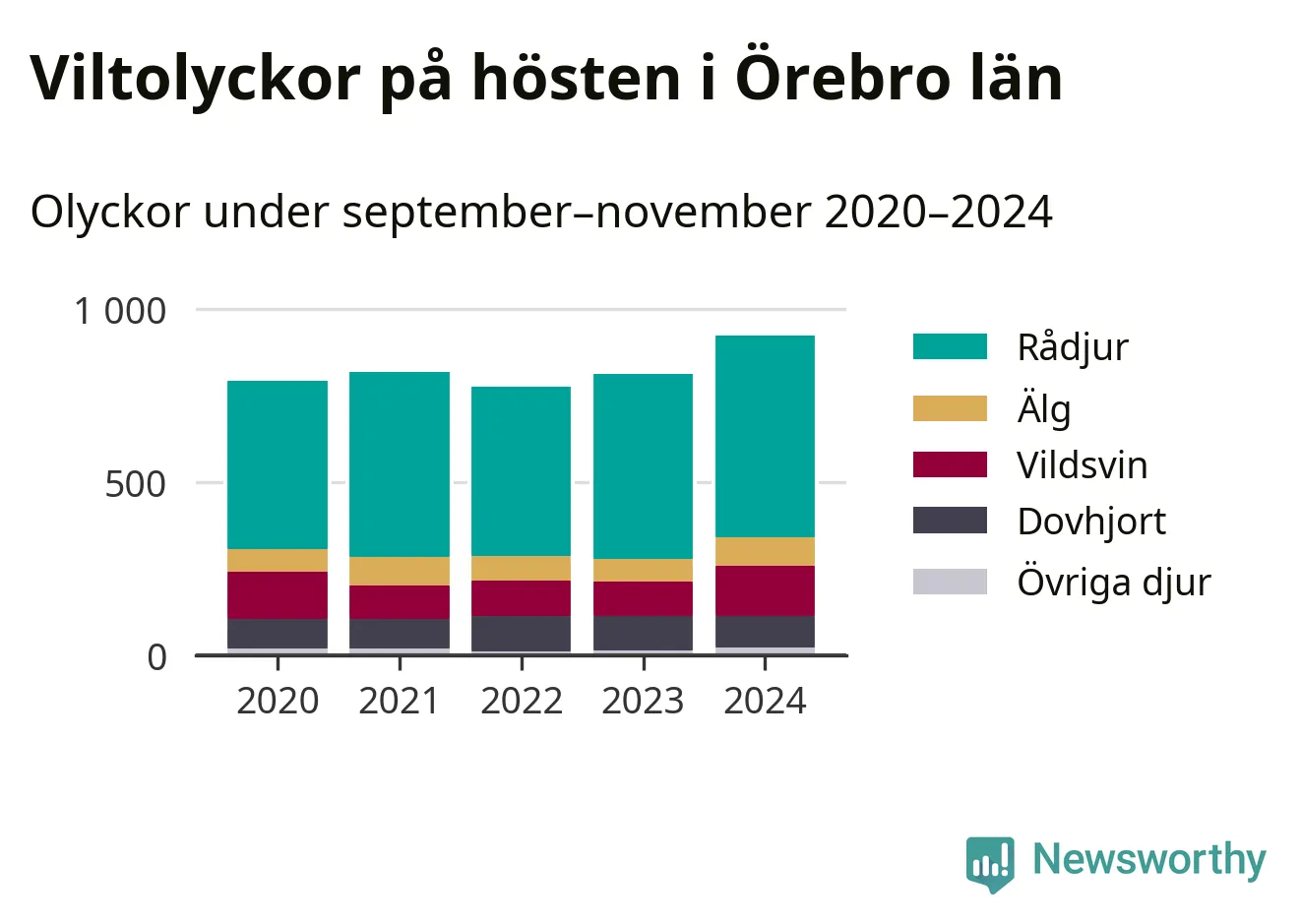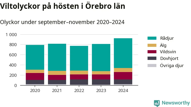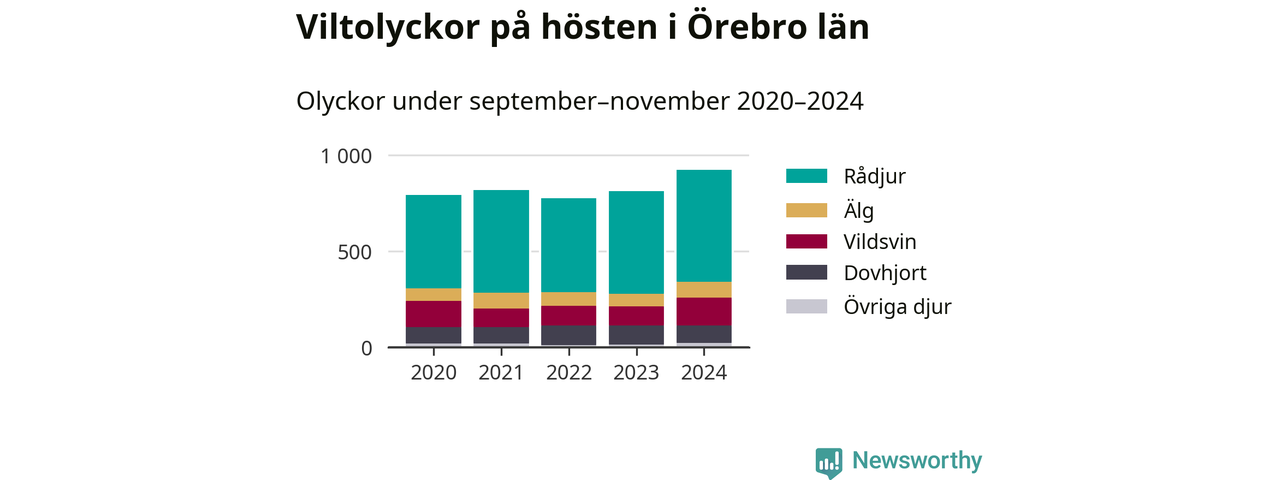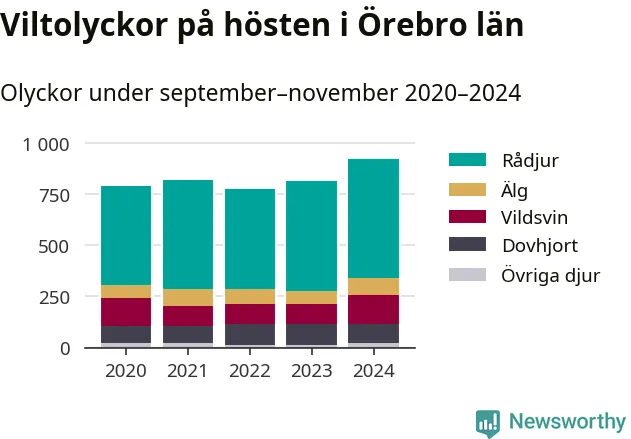 Viltolyckor i Örebro län 2020–2024 uppdelat på viltslag