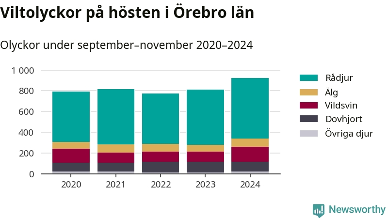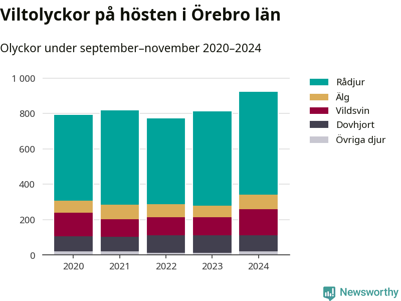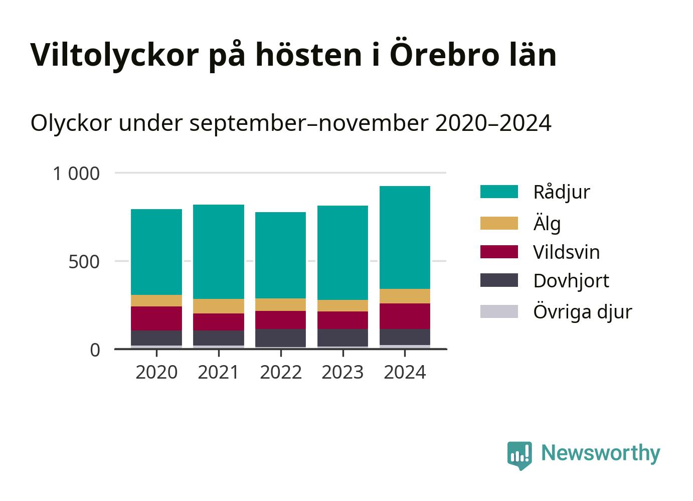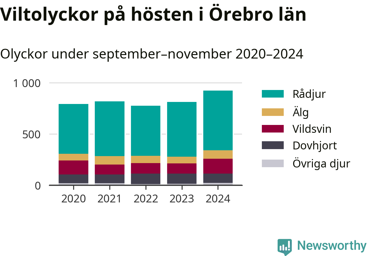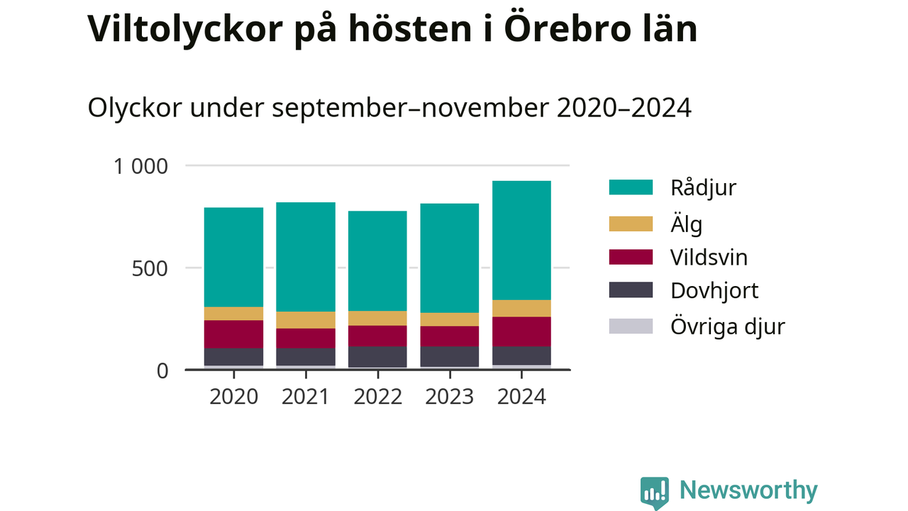Viltolyckor i Örebro län 2020–2024 uppdelat på viltslag