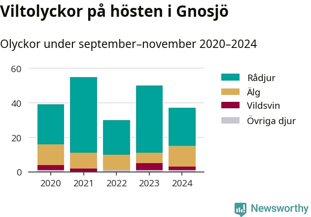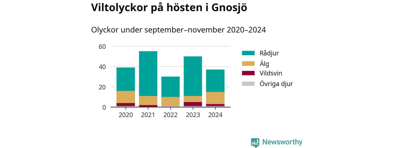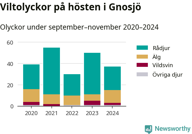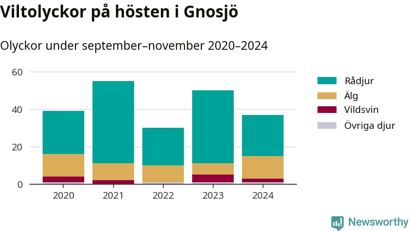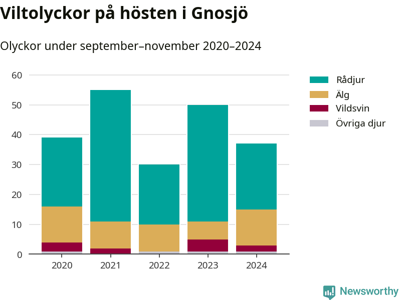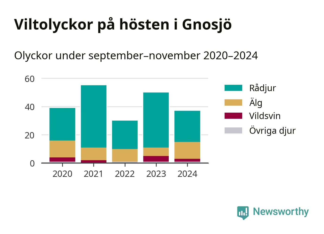 Under de senaste höstarna har antalet viltolyckor ökat i Sverige. Den höst med flest viltolyckor i Gnosjö hittills under 2020-talet var 2021, 55 olyckor. I fjol höst rapporterades totalt 37 olyckor.