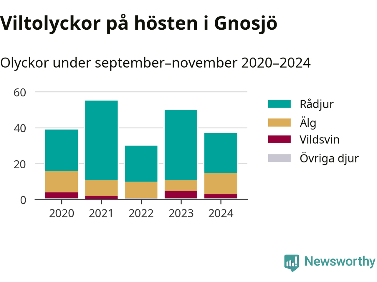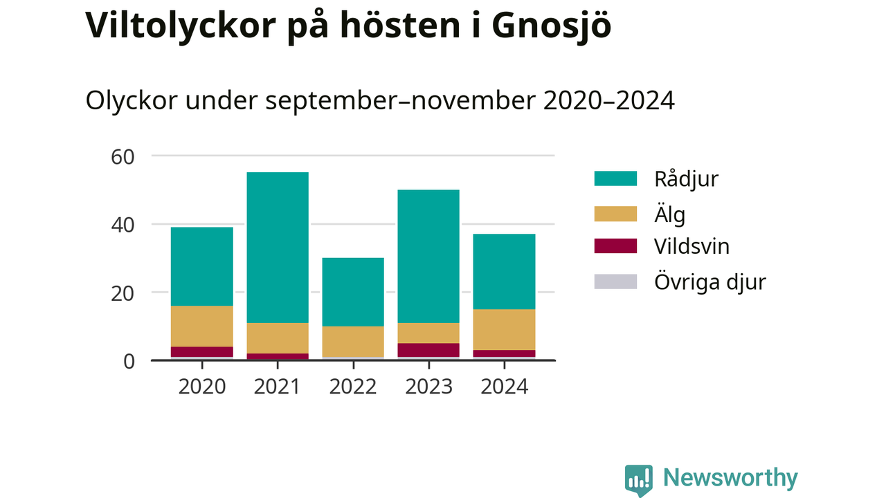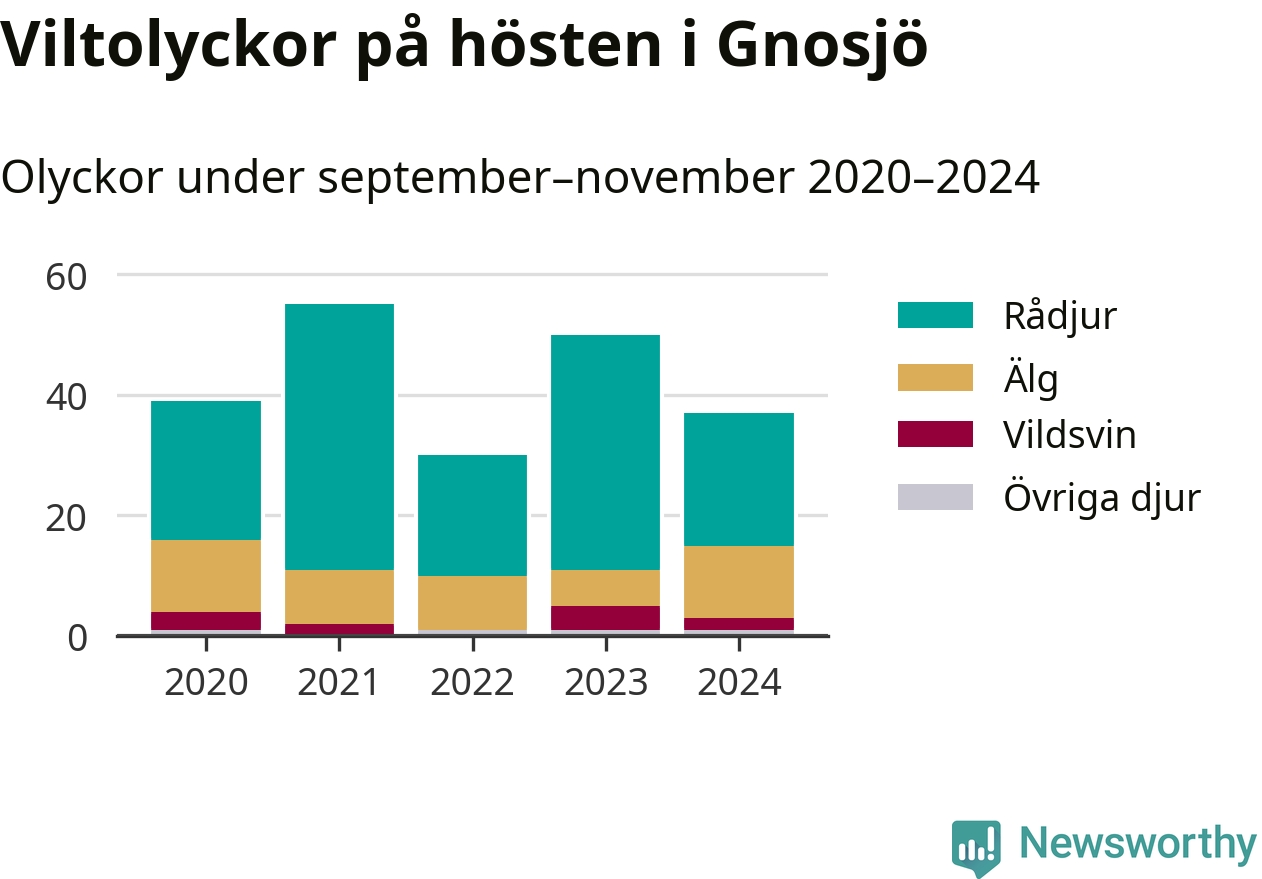 Under de senaste höstarna har antalet viltolyckor ökat i Sverige. Den höst med flest viltolyckor i Gnosjö hittills under 2020-talet var 2021, 55 olyckor. I fjol höst rapporterades totalt 37 olyckor.