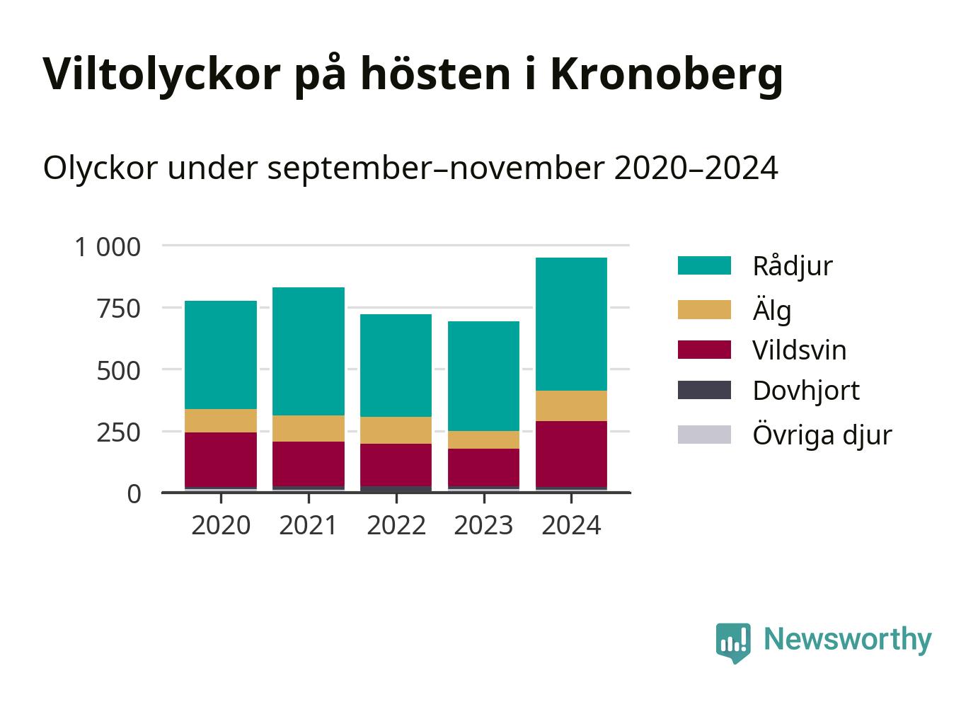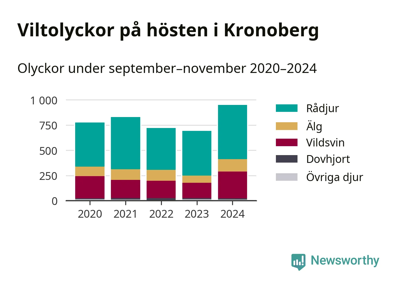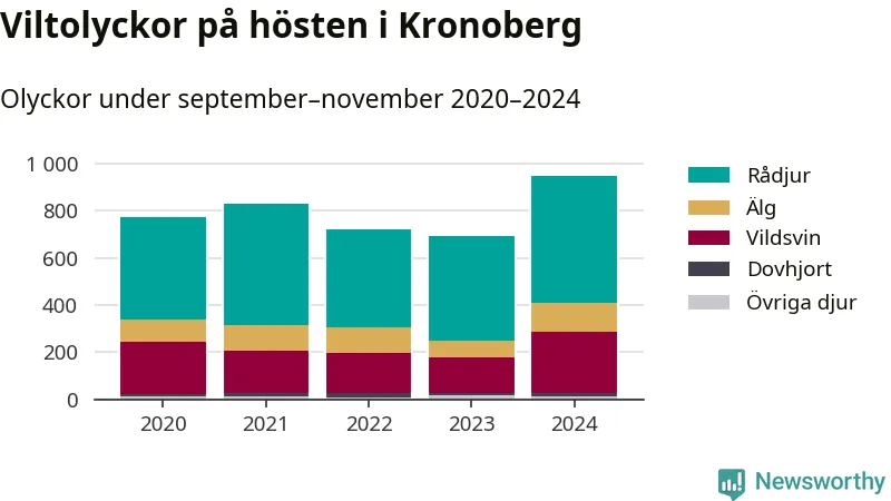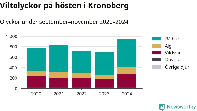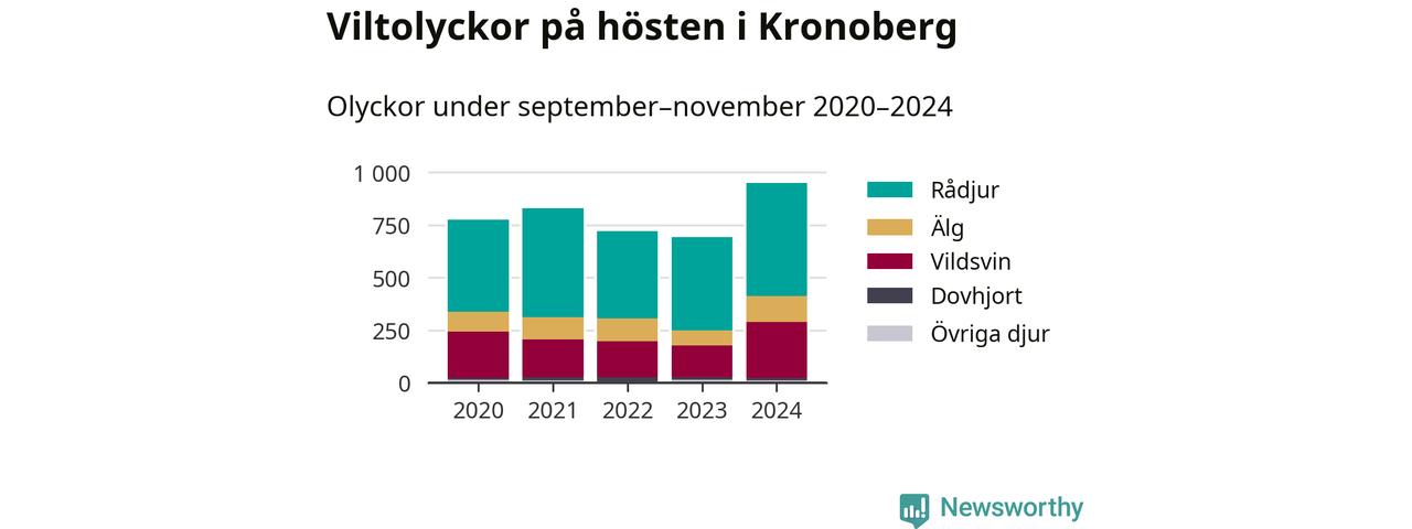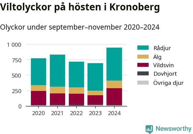 Viltolyckor i Kronoberg 2020–2024 uppdelat på viltslag