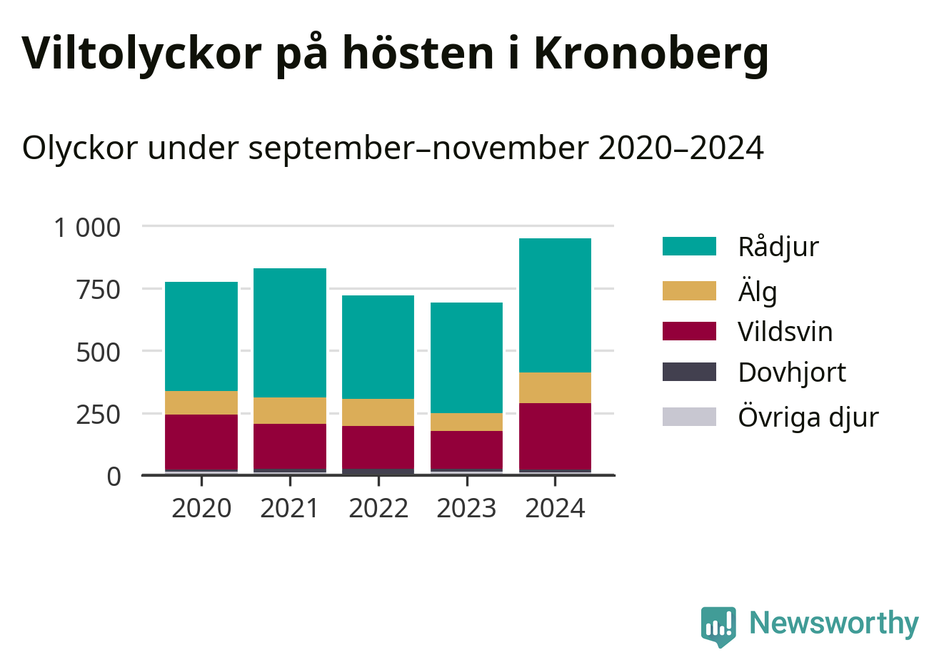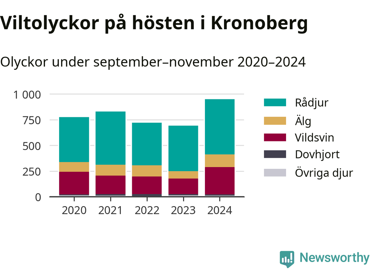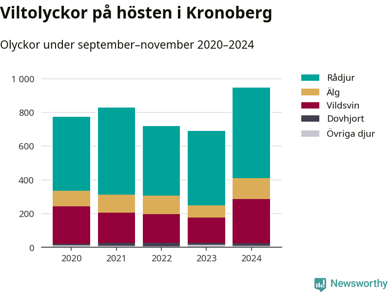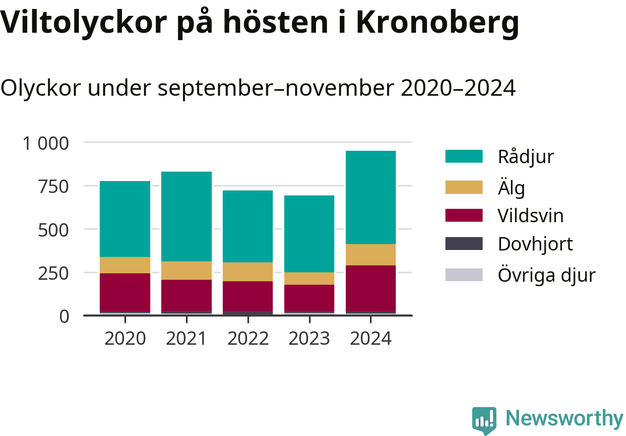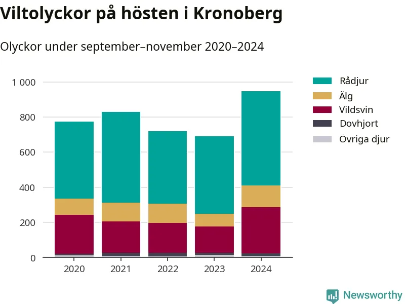 Viltolyckor i Kronoberg 2020–2024 uppdelat på viltslag