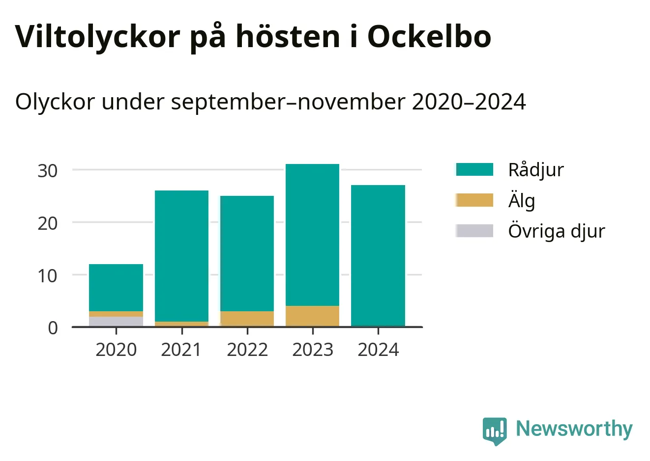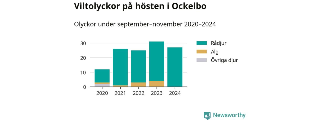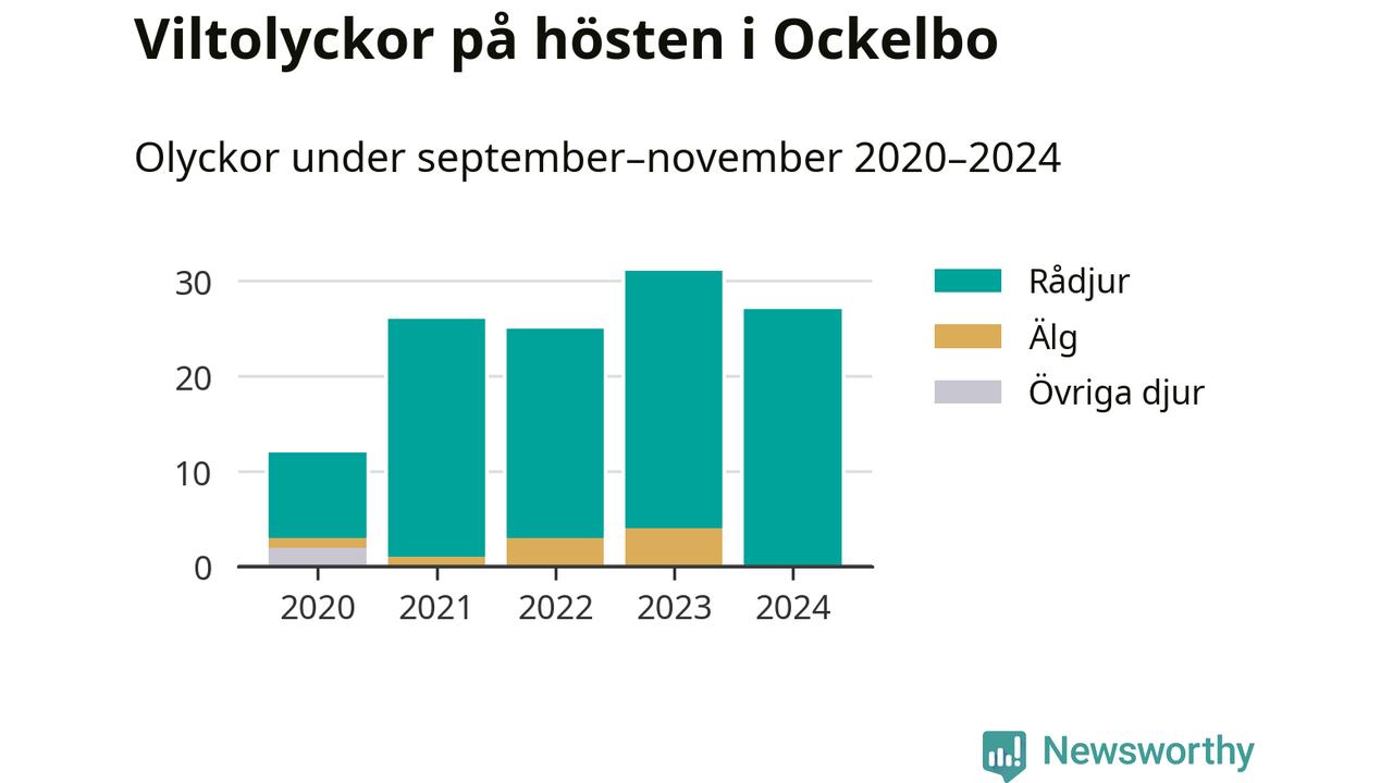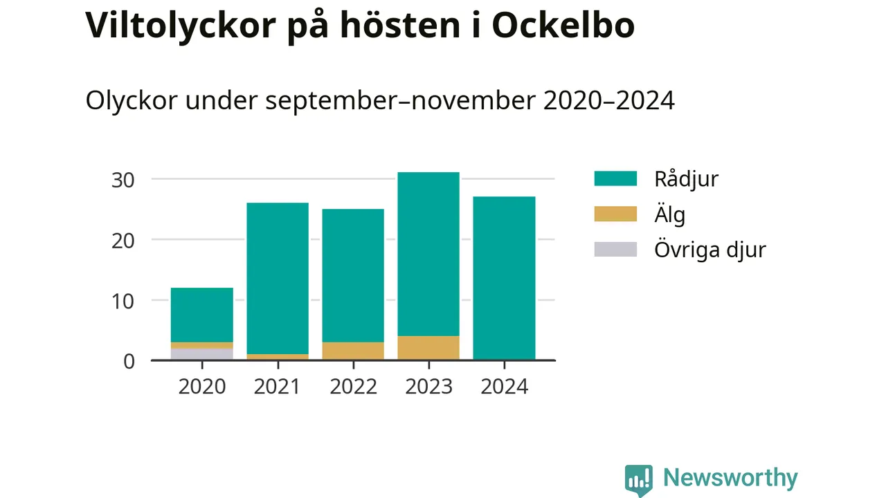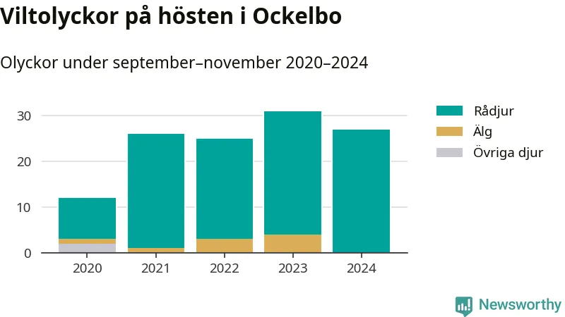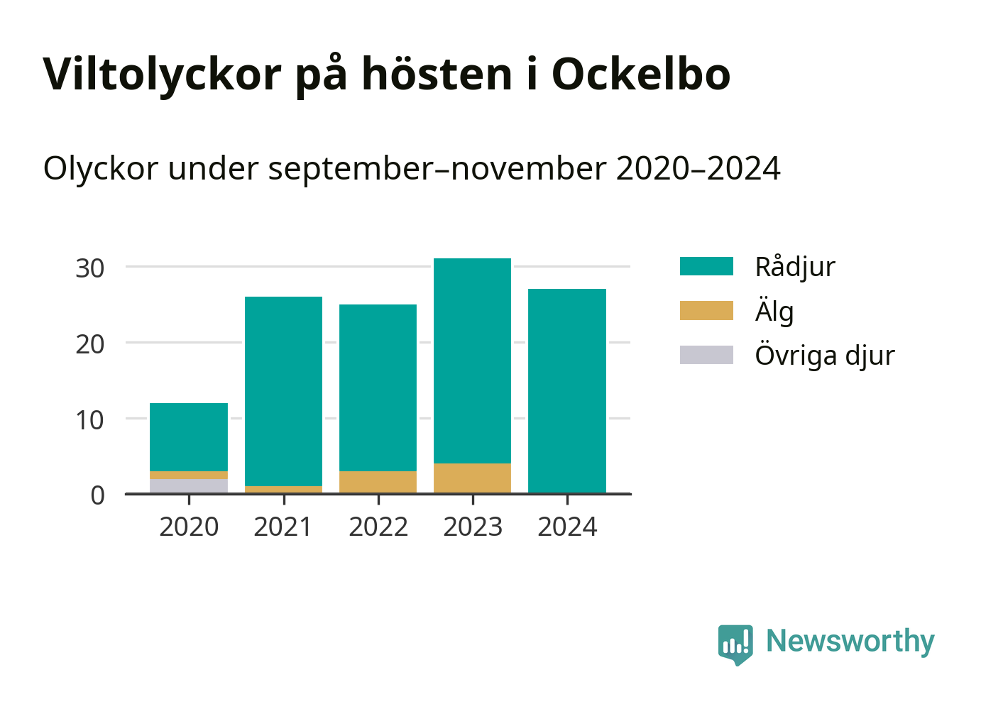 Under de senaste höstarna har antalet viltolyckor ökat i Sverige. Den höst med flest viltolyckor i Ockelbo hittills under 2020-talet var 2023, 31 olyckor. I fjol höst rapporterades totalt 27 olyckor.