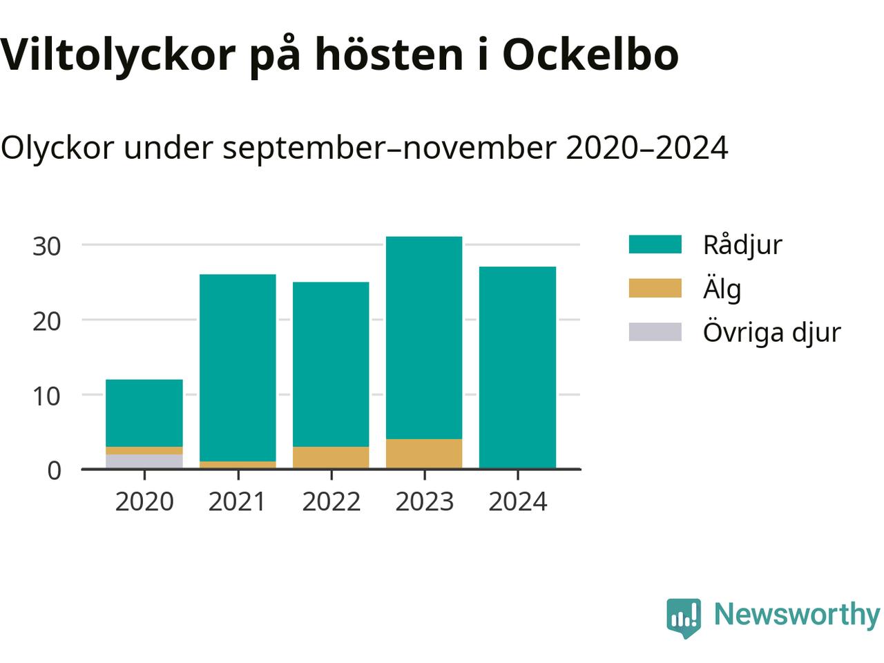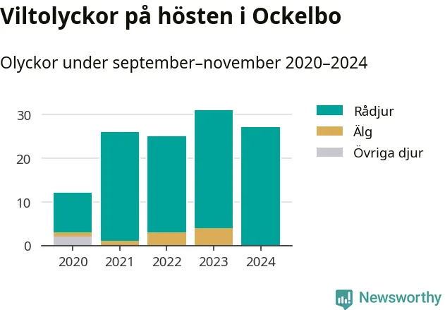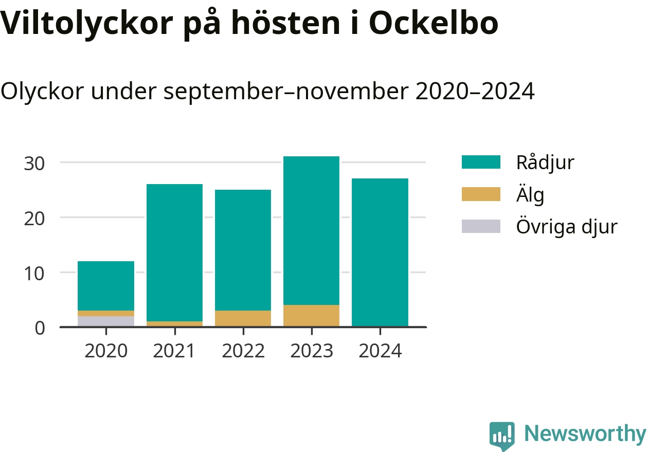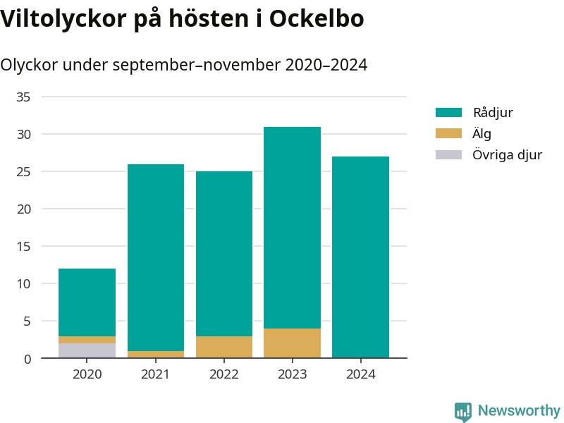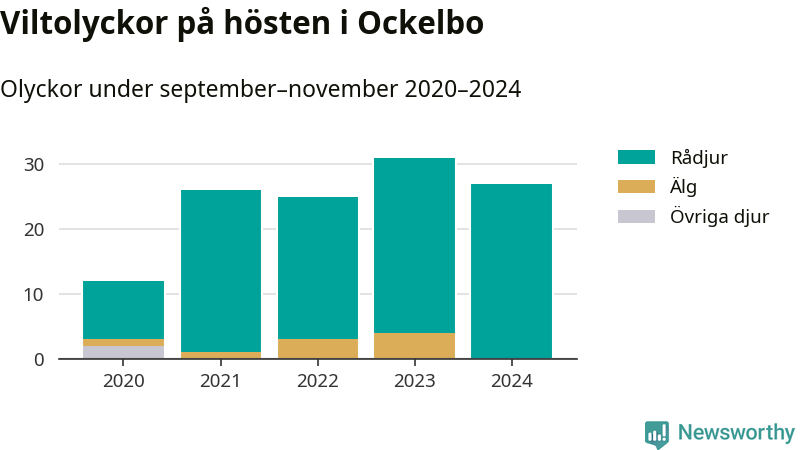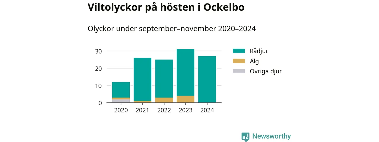 Under de senaste höstarna har antalet viltolyckor ökat i Sverige. Den höst med flest viltolyckor i Ockelbo hittills under 2020-talet var 2023, 31 olyckor. I fjol höst rapporterades totalt 27 olyckor.