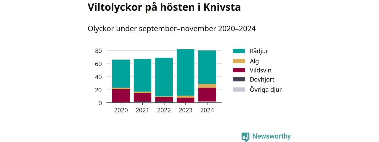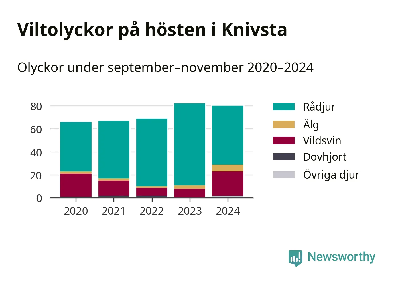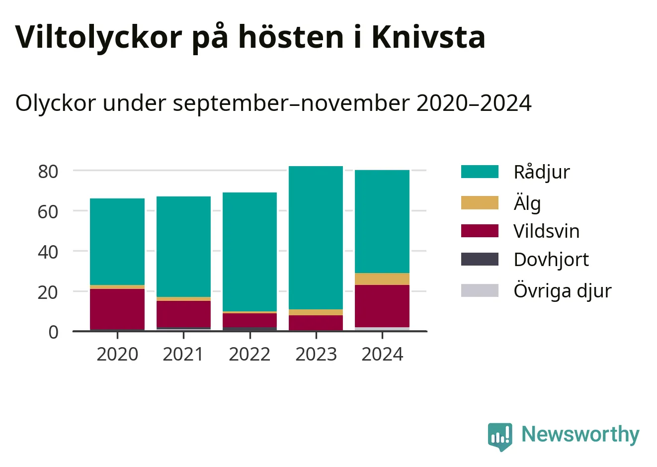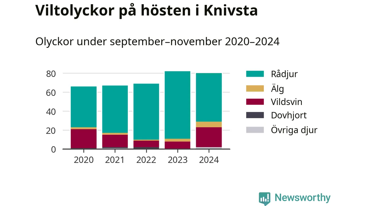 Under de senaste höstarna har antalet viltolyckor ökat i Sverige. Den höst med flest viltolyckor i Knivsta hittills under 2020-talet var 2023, 82 olyckor. I fjol höst rapporterades totalt 80 olyckor.
