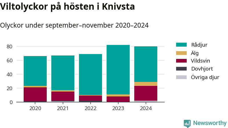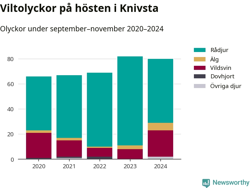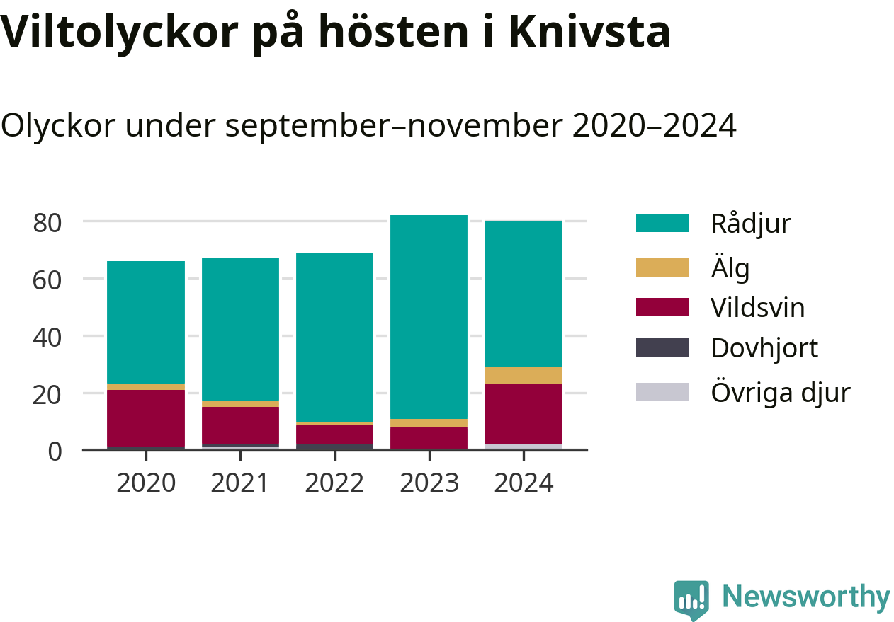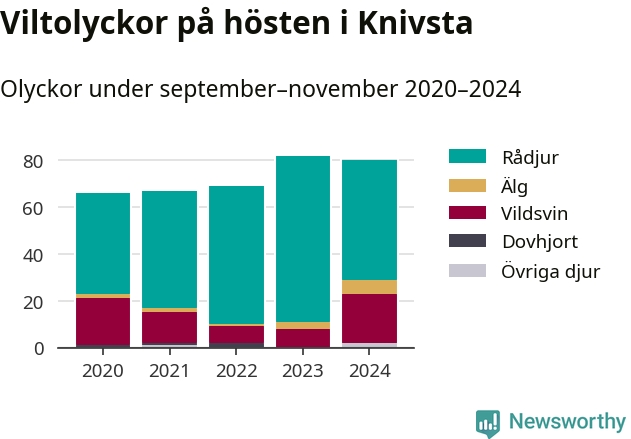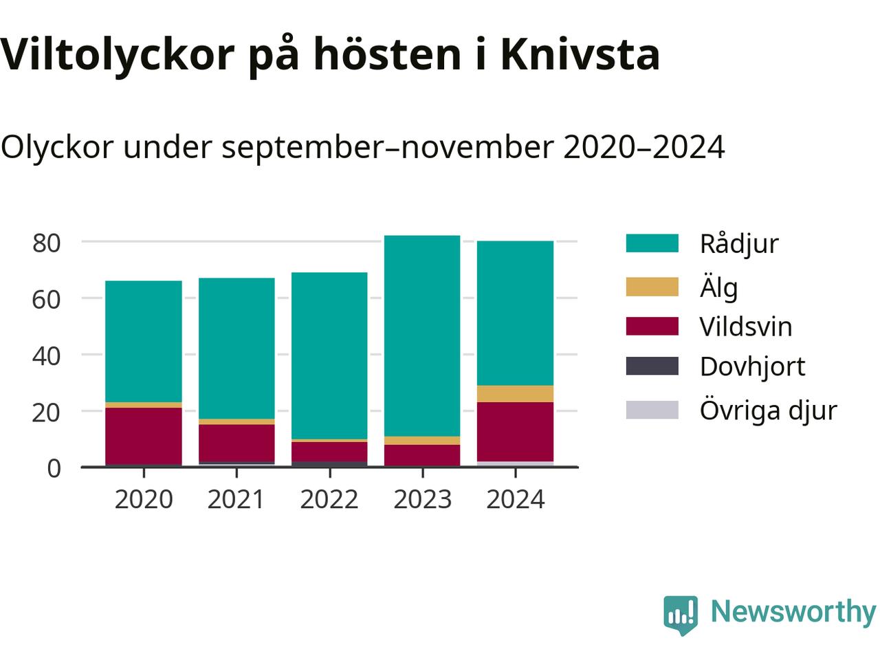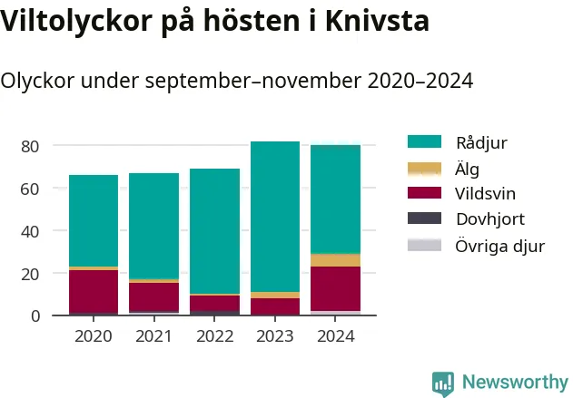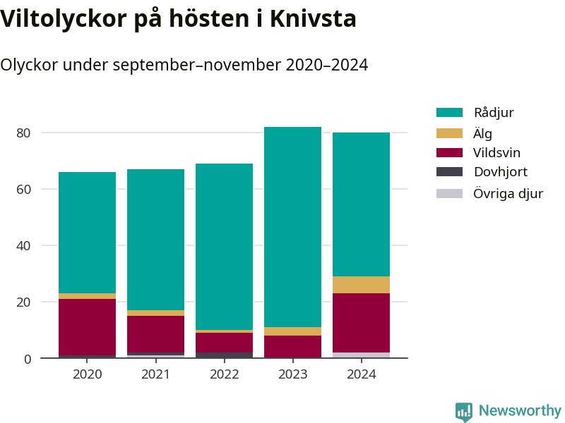 Under de senaste höstarna har antalet viltolyckor ökat i Sverige. Den höst med flest viltolyckor i Knivsta hittills under 2020-talet var 2023, 82 olyckor. I fjol höst rapporterades totalt 80 olyckor.