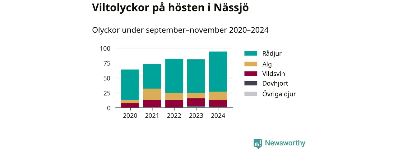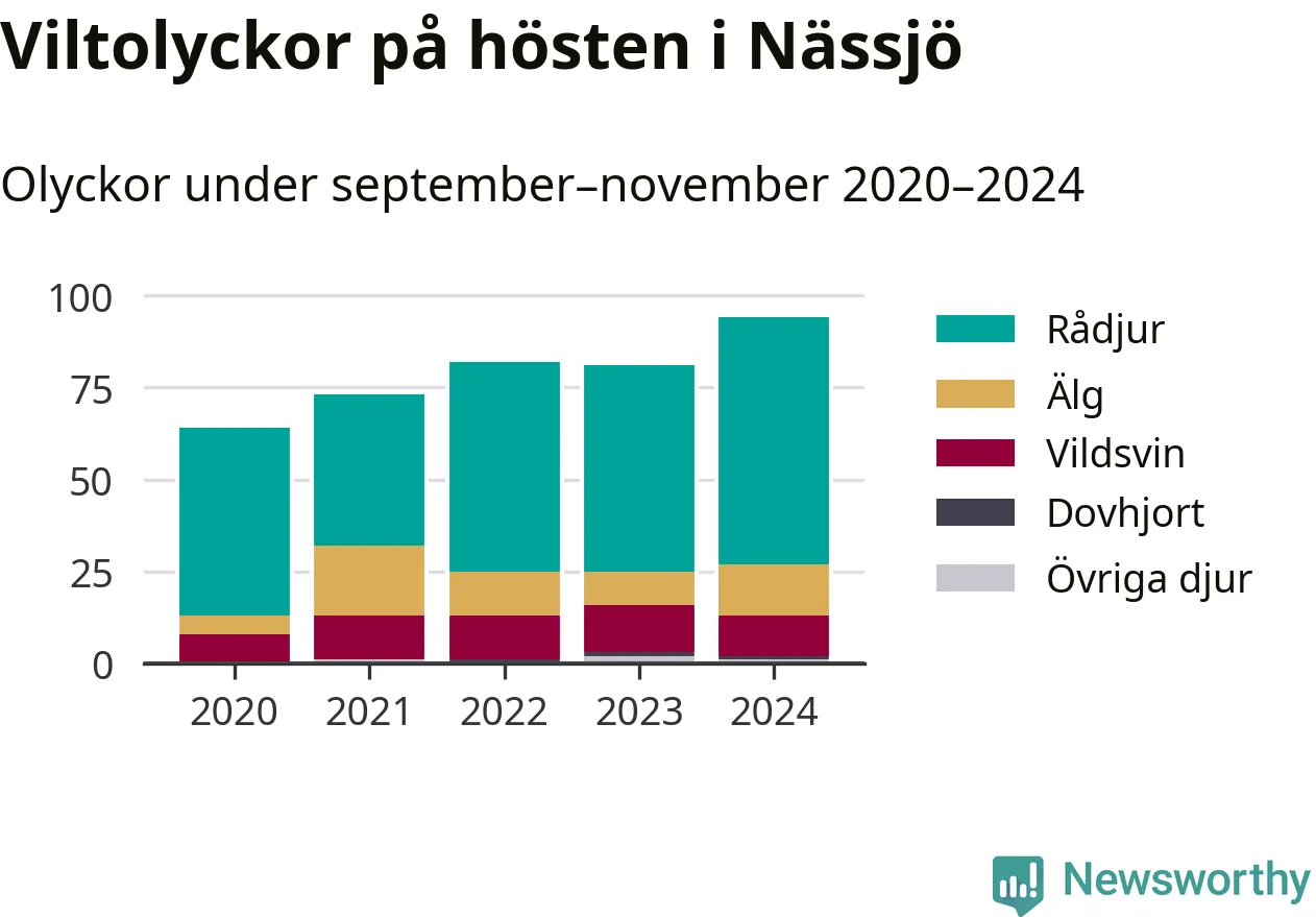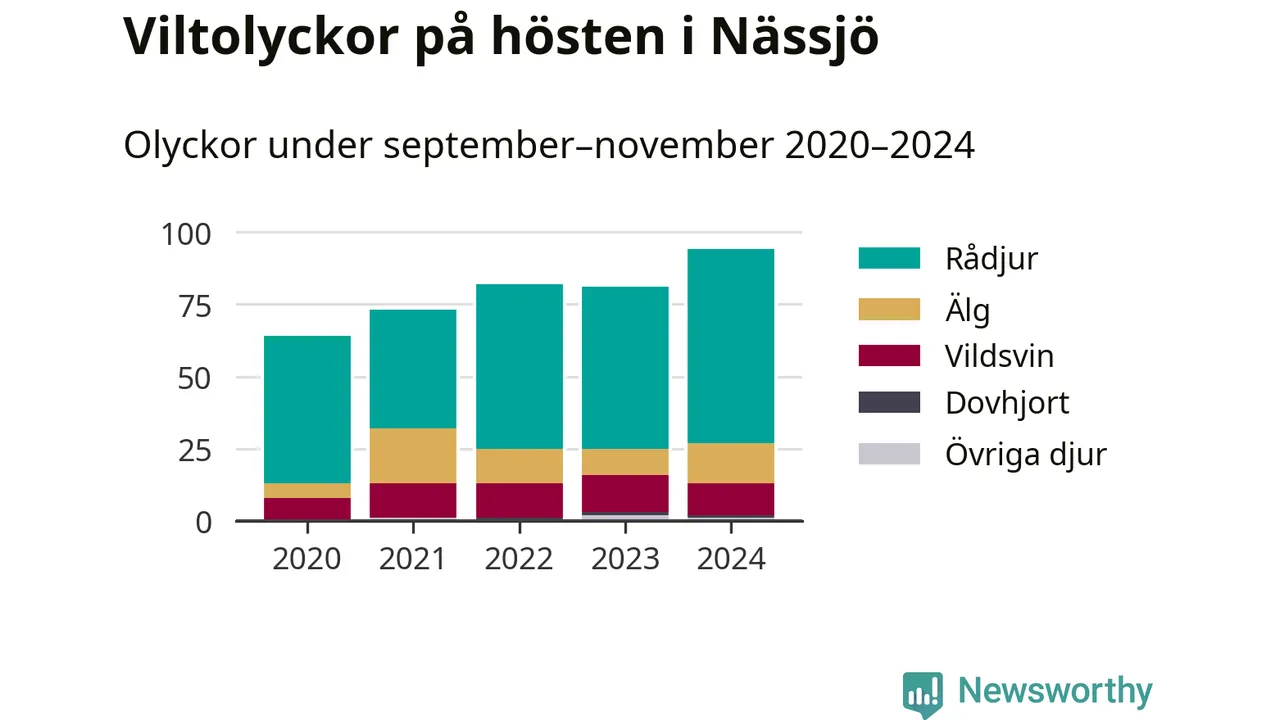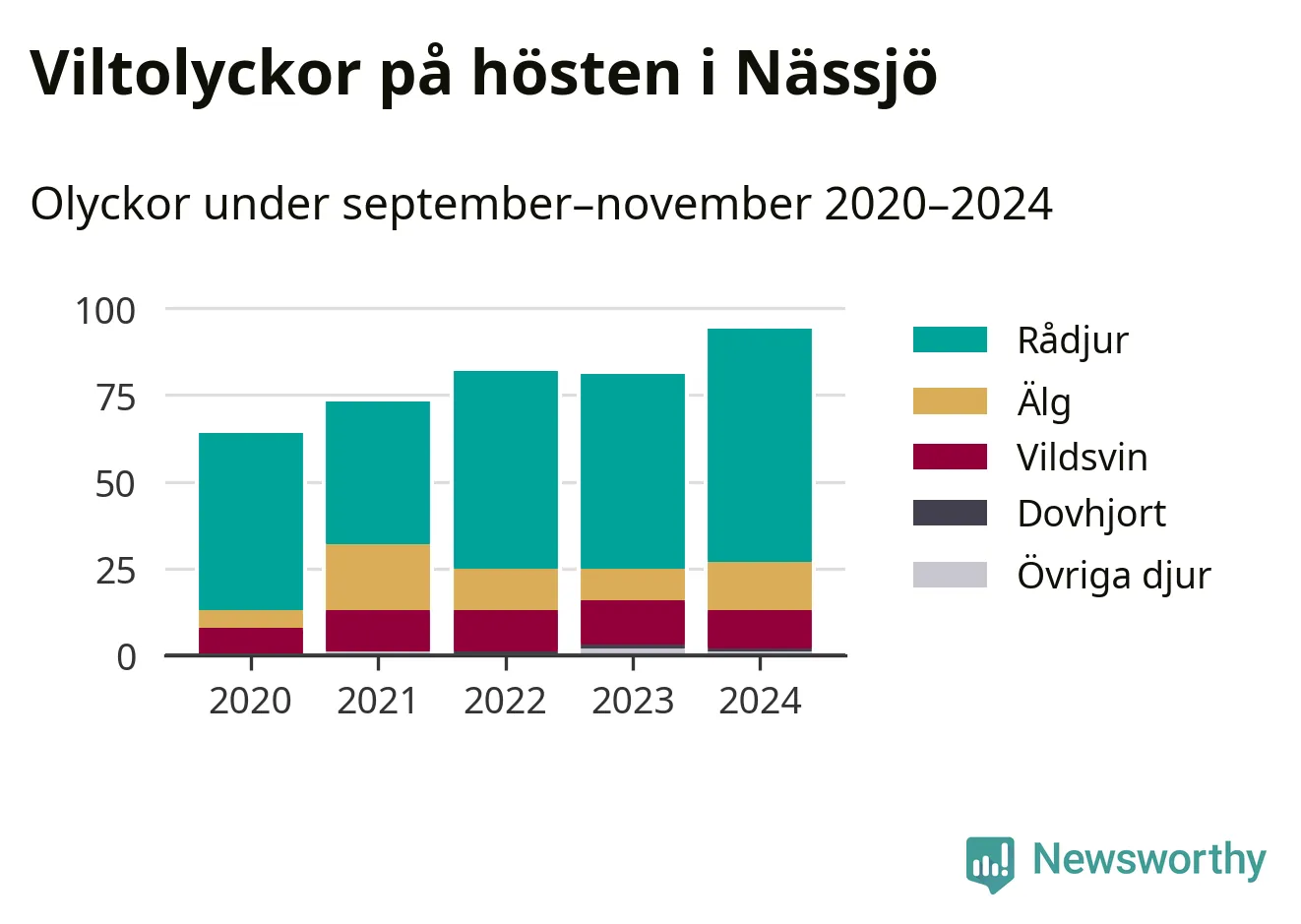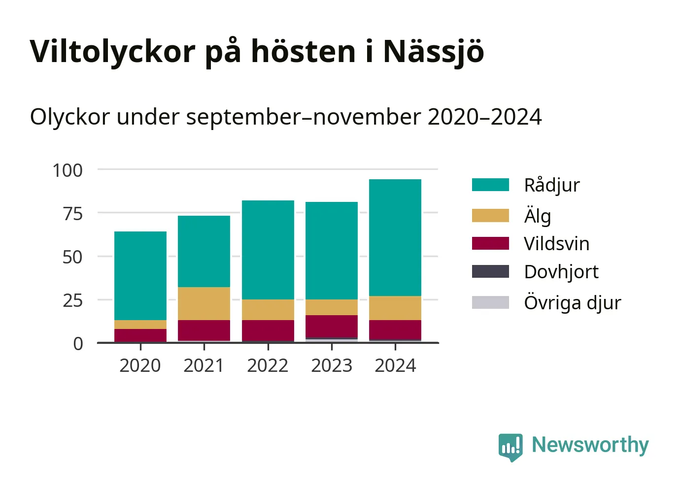Under de senaste höstarna har antalet viltolyckor ökat i Sverige. I fjol höst noterades också flest viltolyckor i Nässjö hittills under 2020-talet, totalt 94 stycken.