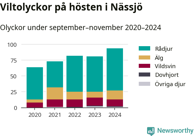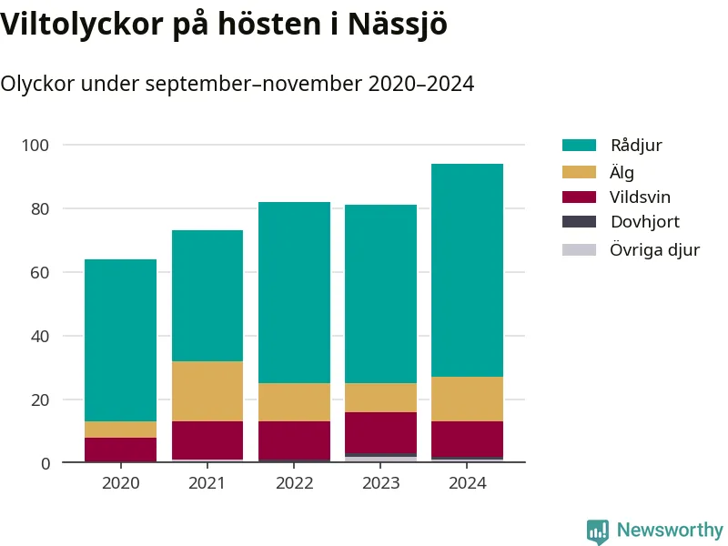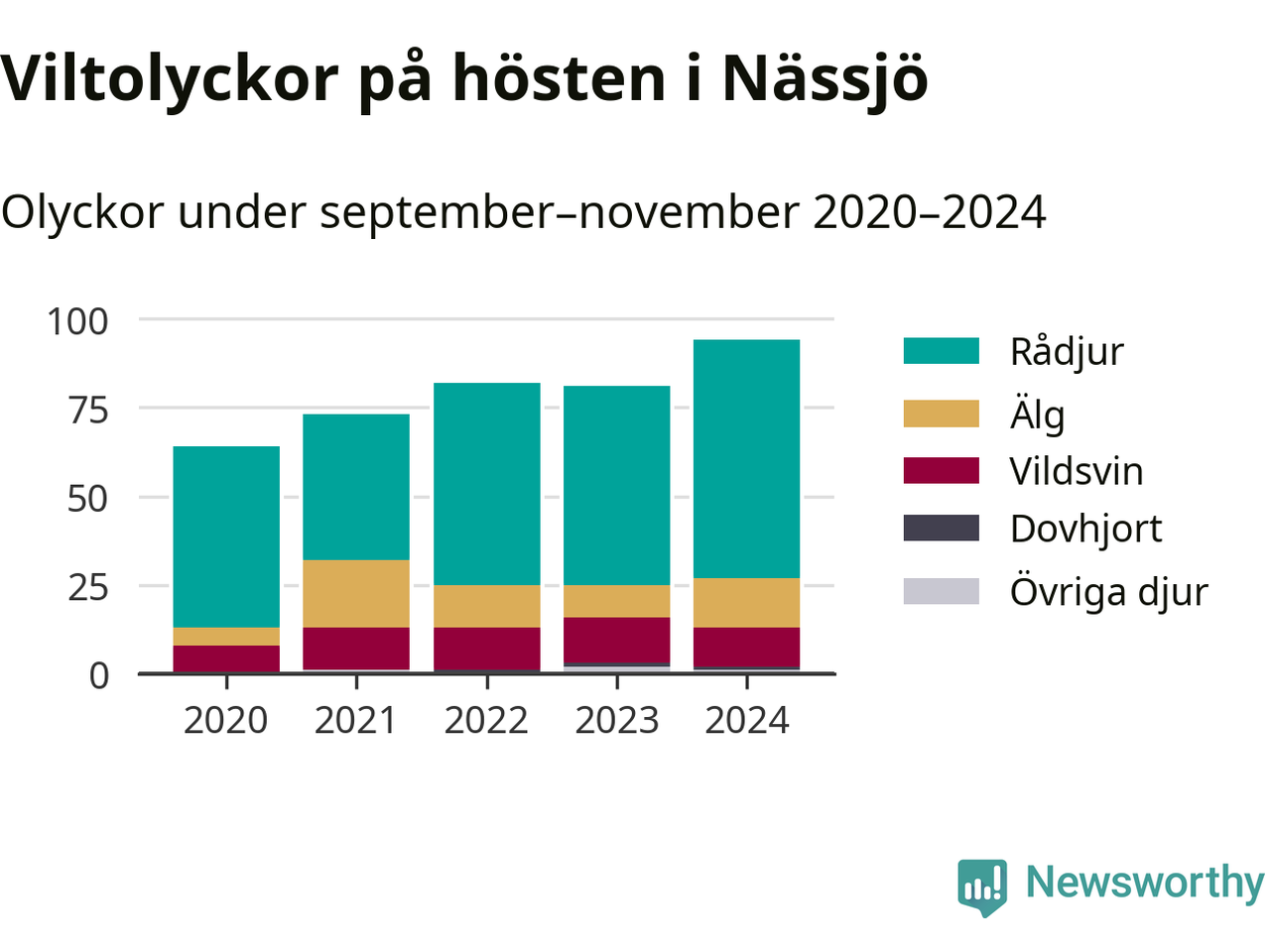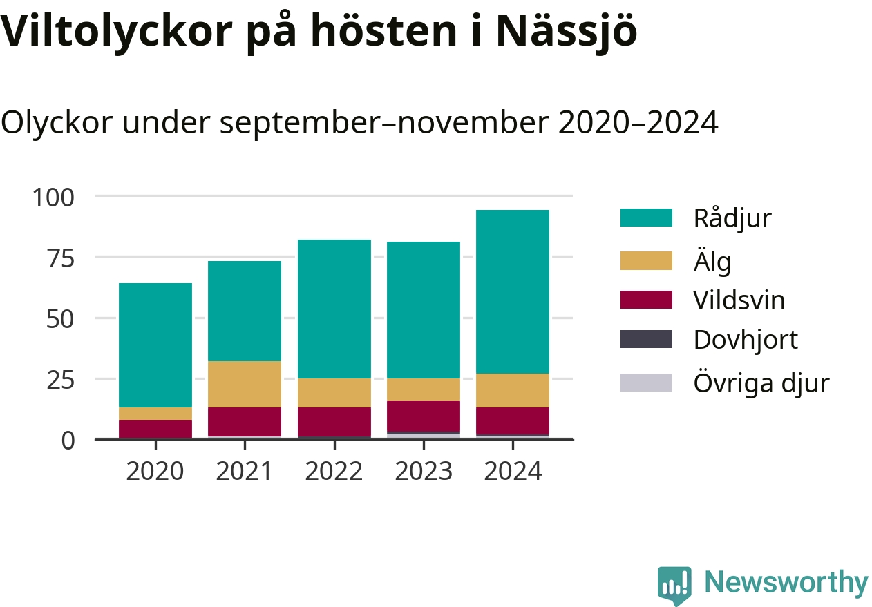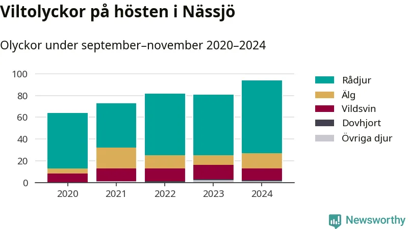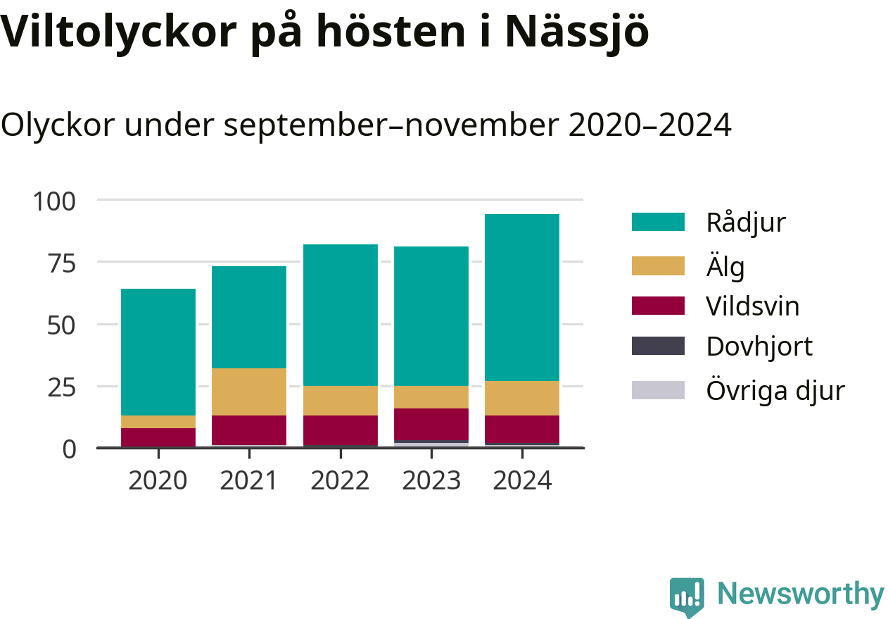 Under de senaste höstarna har antalet viltolyckor ökat i Sverige. I fjol höst noterades också flest viltolyckor i Nässjö hittills under 2020-talet, totalt 94 stycken.
