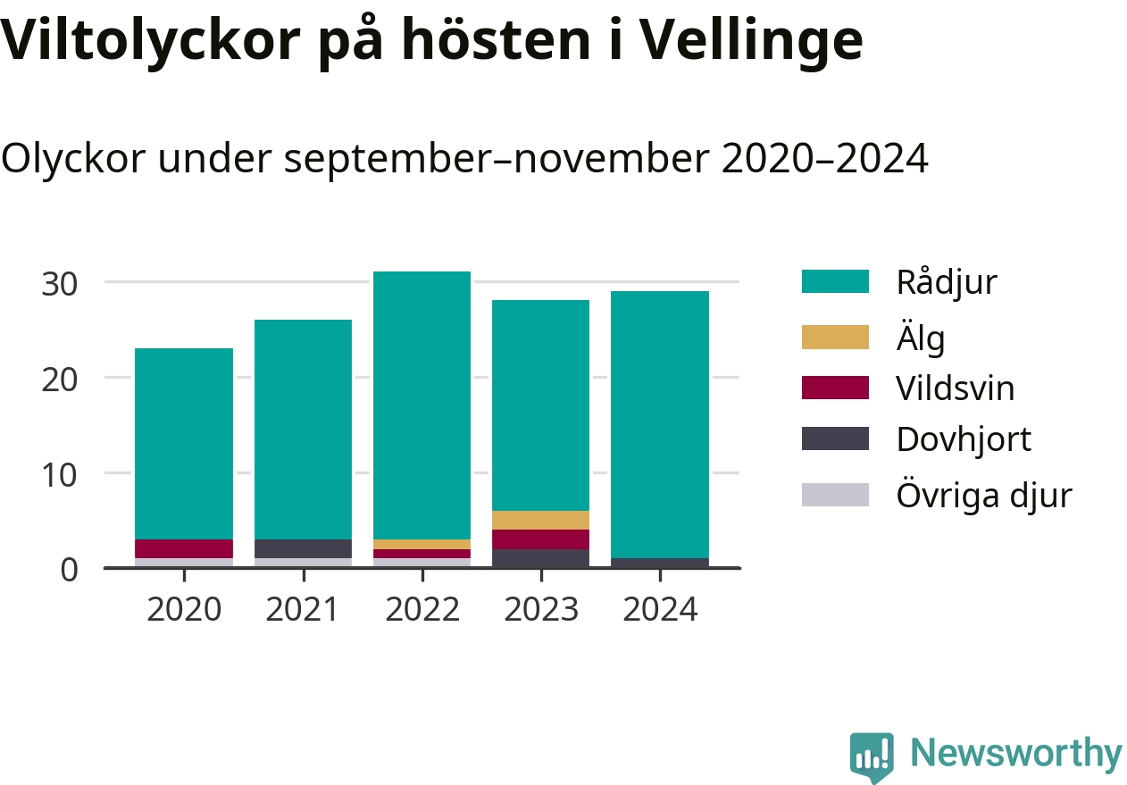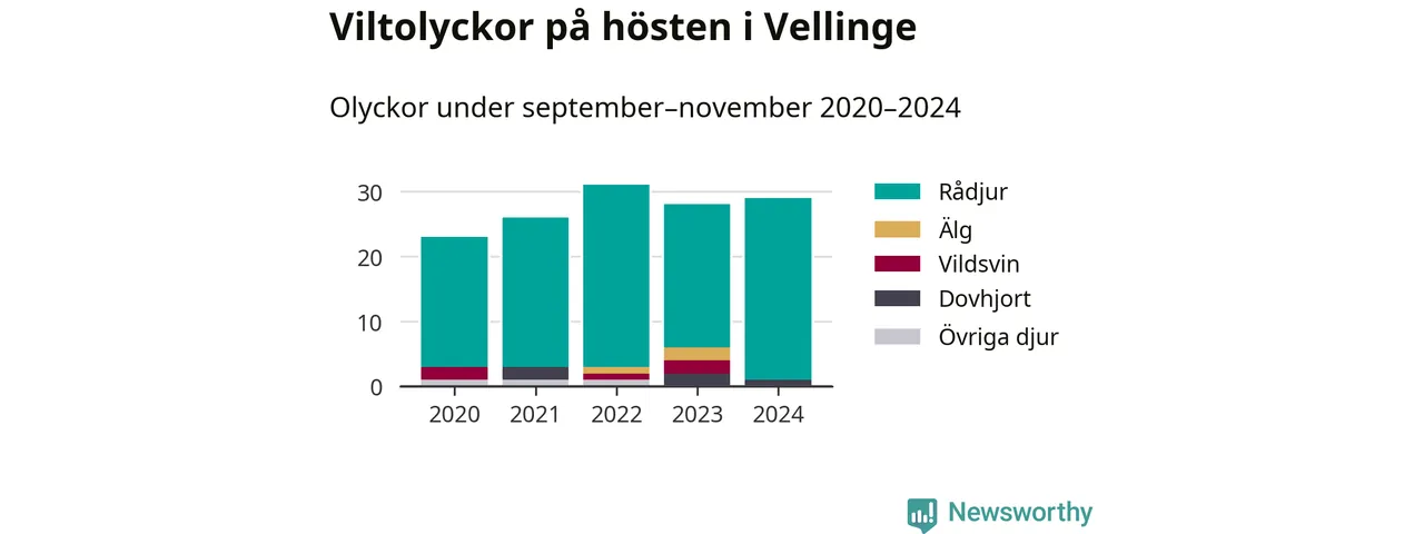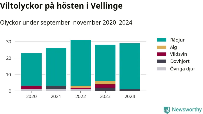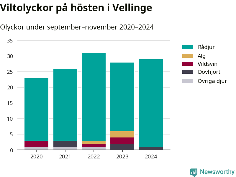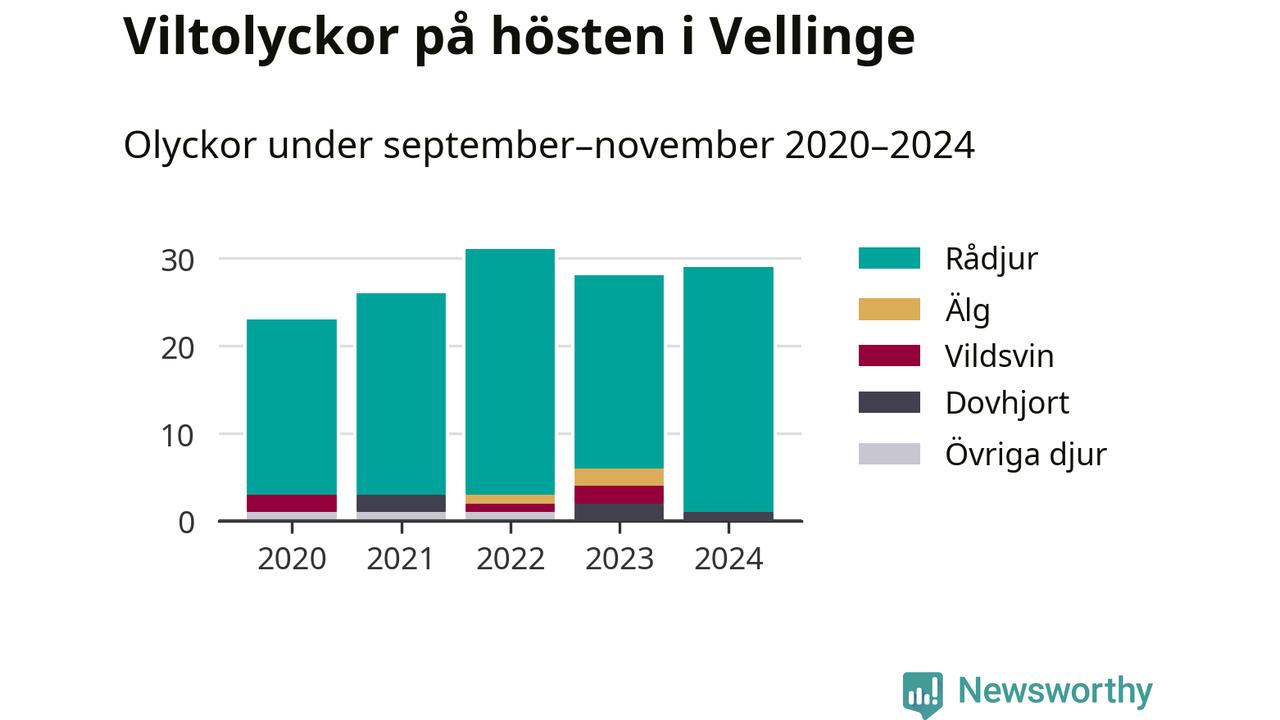 Under de senaste höstarna har antalet viltolyckor ökat i Sverige. Den höst med flest viltolyckor i Vellinge hittills under 2020-talet var 2022, 31 olyckor. I fjol höst rapporterades totalt 29 olyckor.