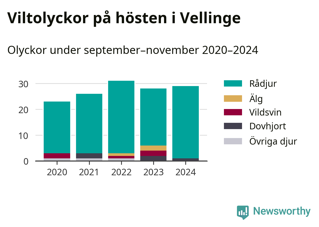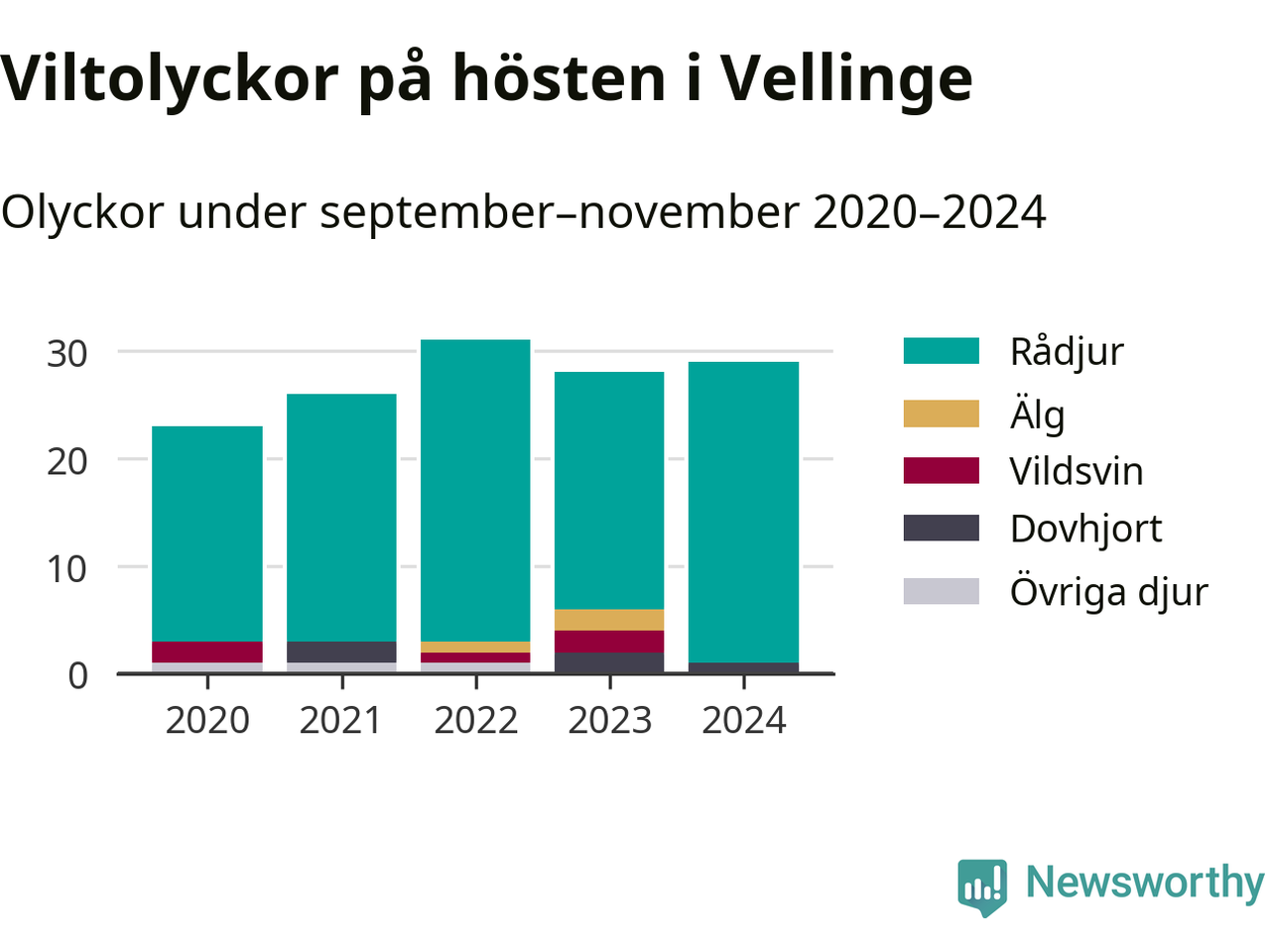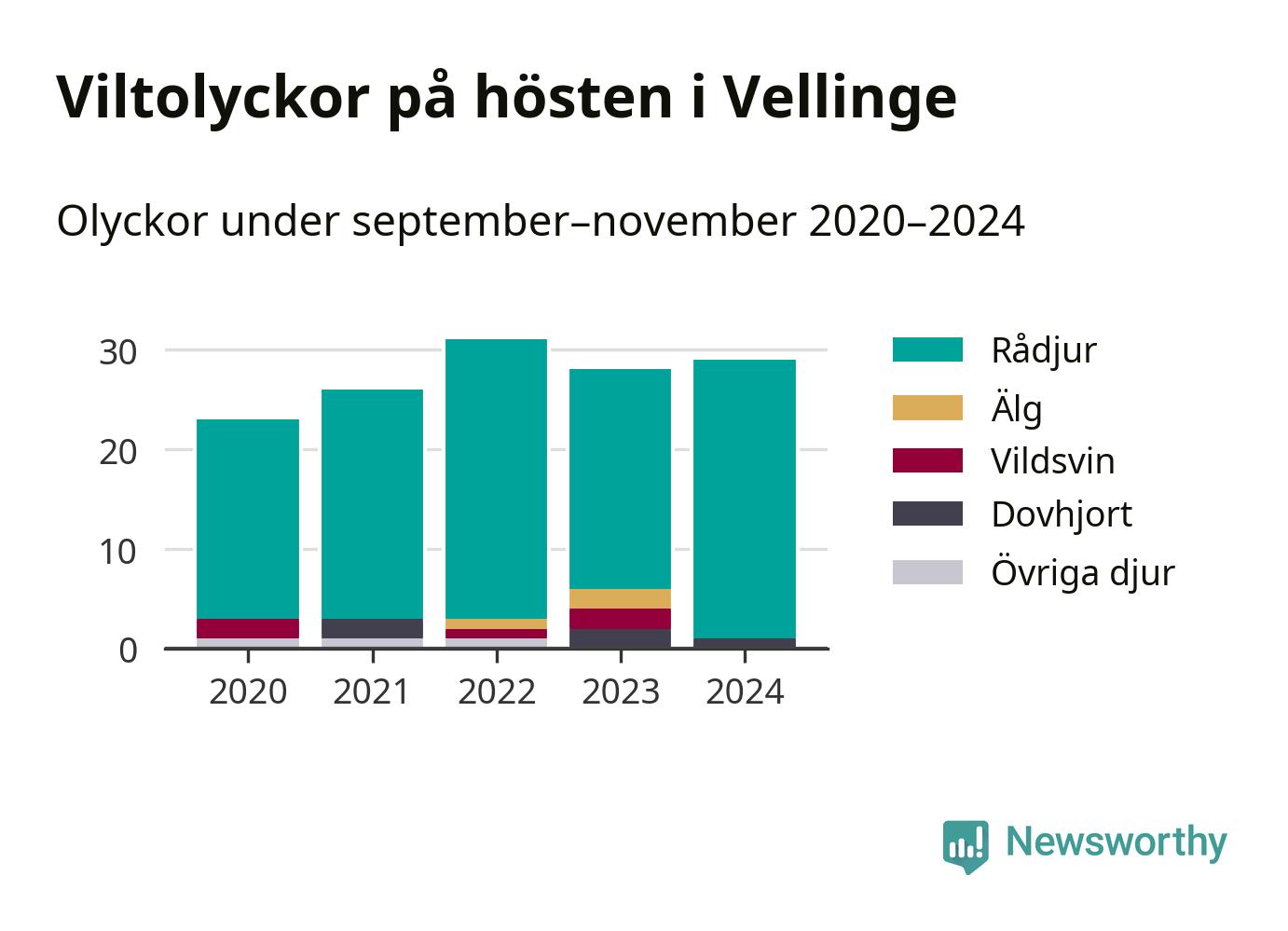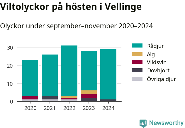 Viltolyckor i Vellinge 2020–2024 uppdelat på viltslag