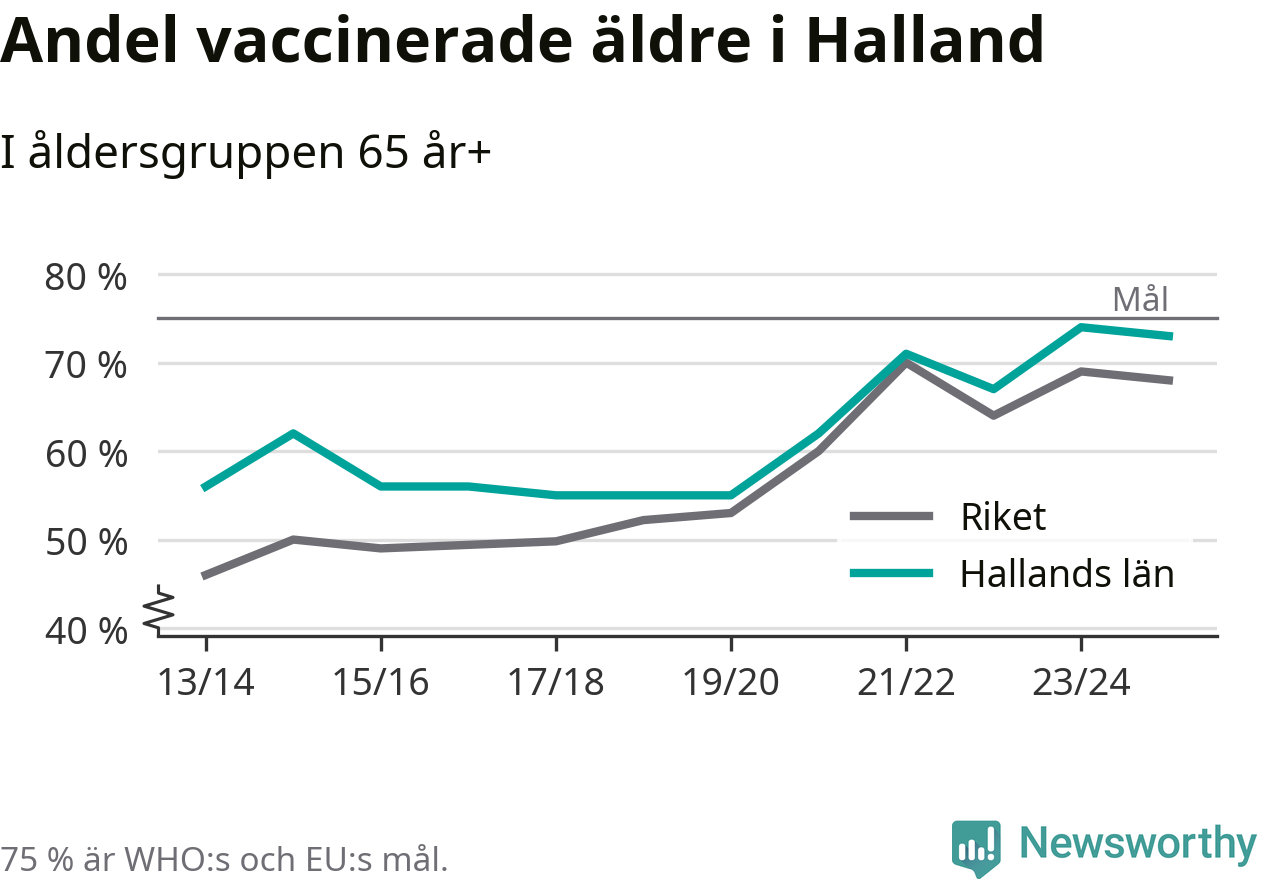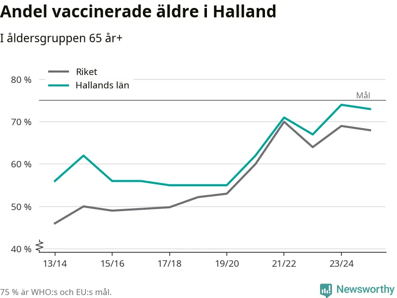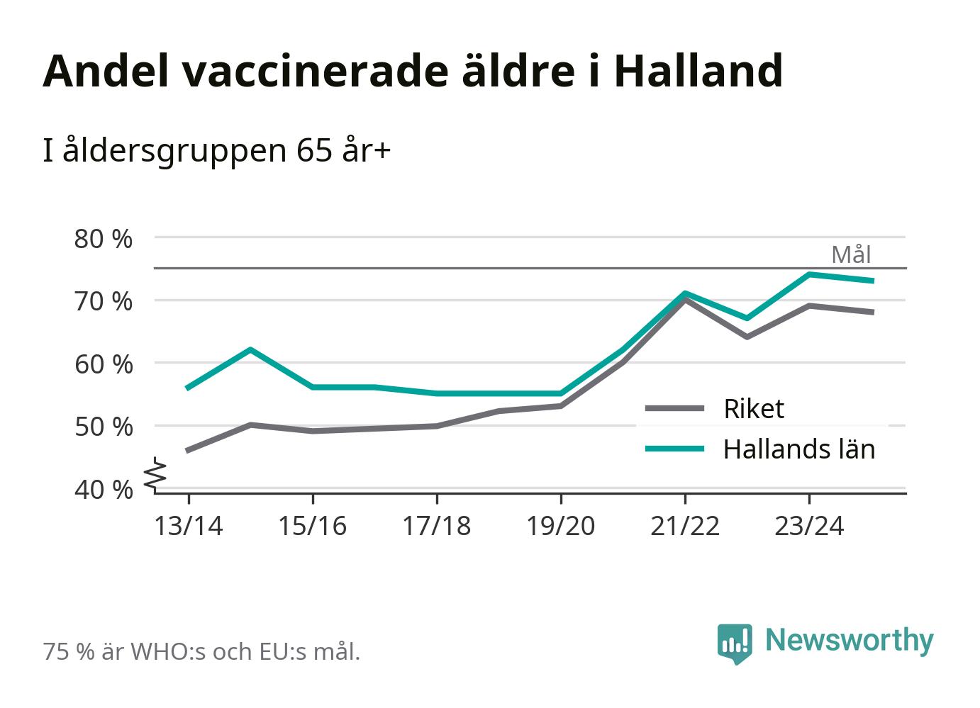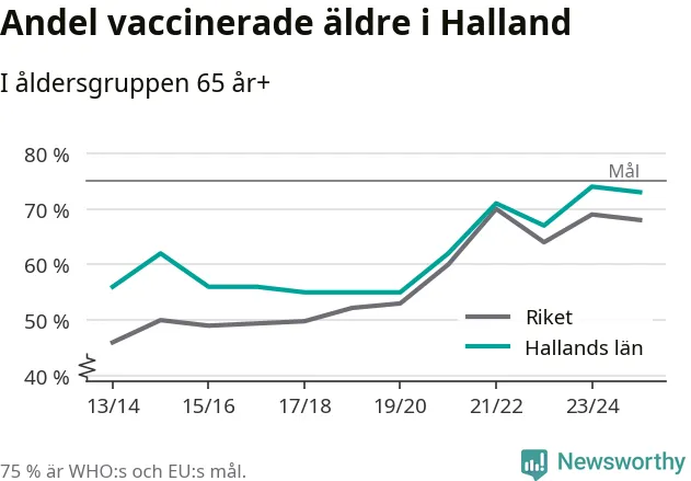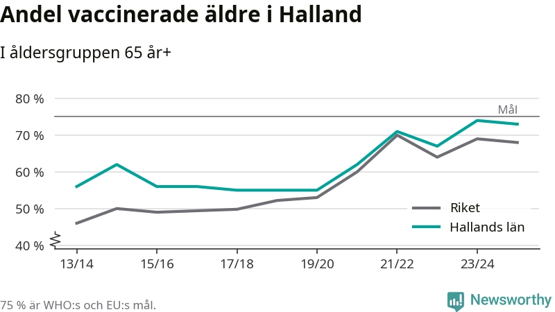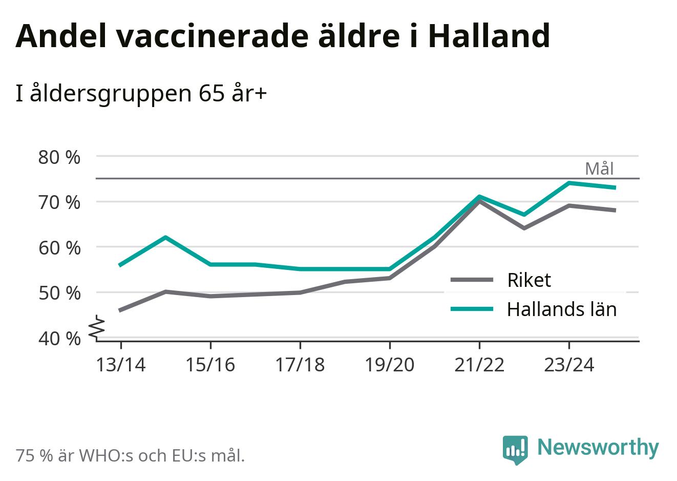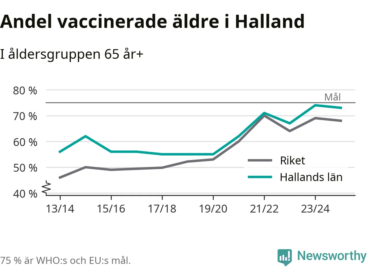 Region Halland når alltså inte heller vaccinationsmålet, men har en avsevärt högre täckning nu än före pandemin. 2017/18, 2018/19 och 2019/20 var andelen exempelvis bara 55 procent.