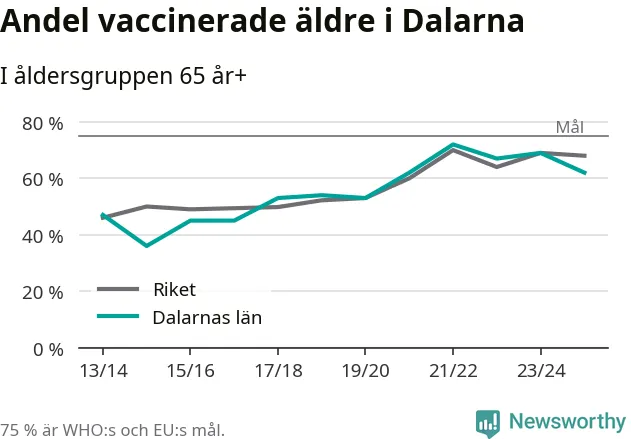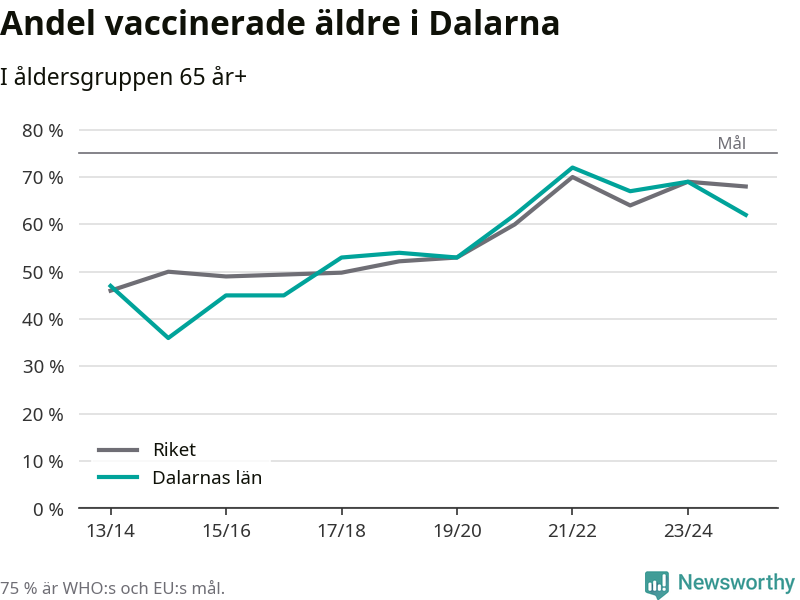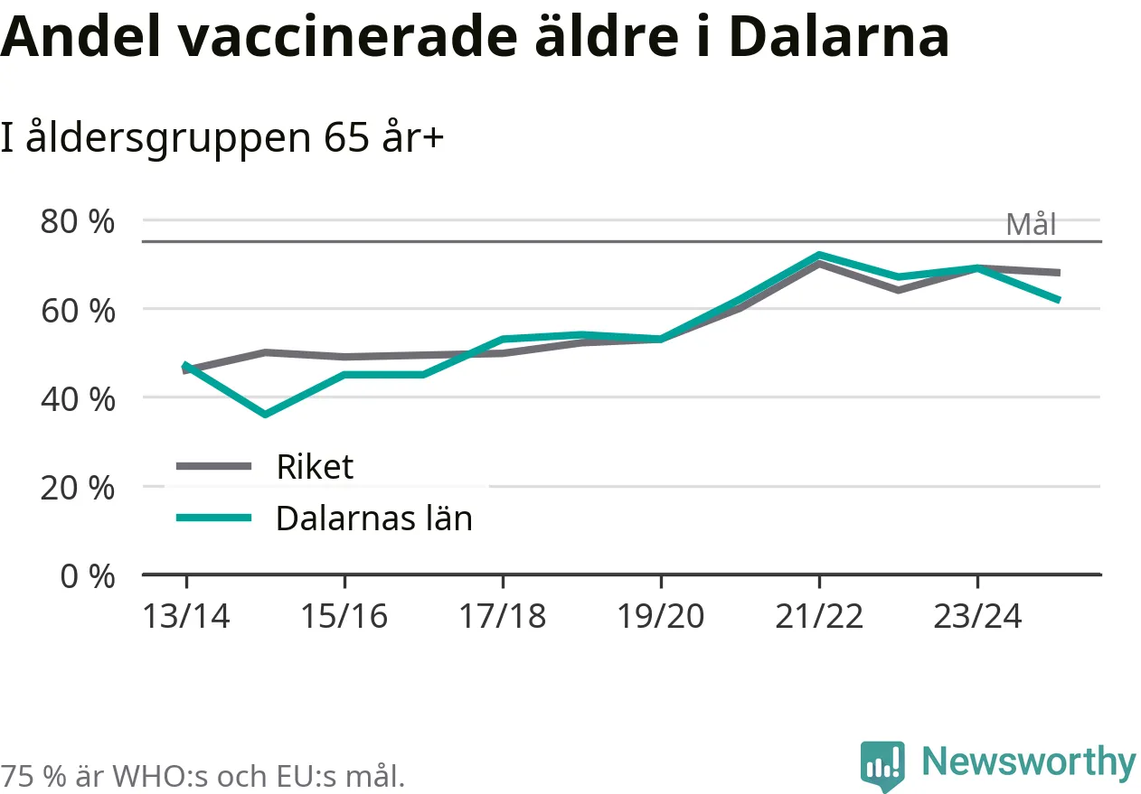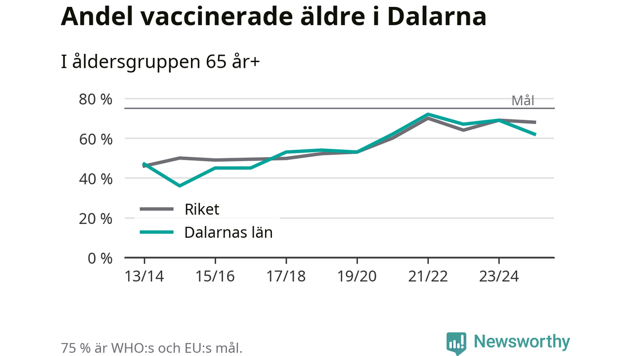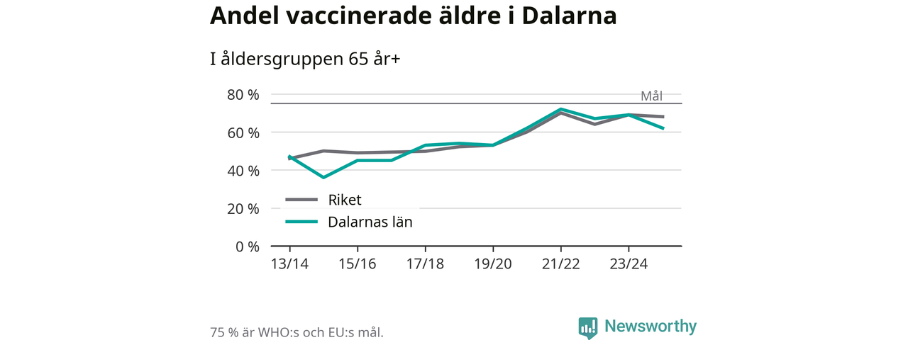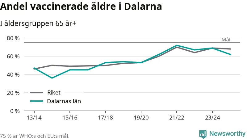 Region Dalarna når alltså inte heller vaccinationsmålet, men har en avsevärt högre täckning nu än före pandemin. 2014/15 var andelen exempelvis bara 36 procent.
