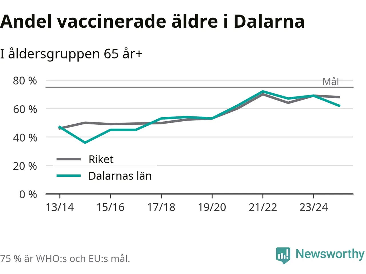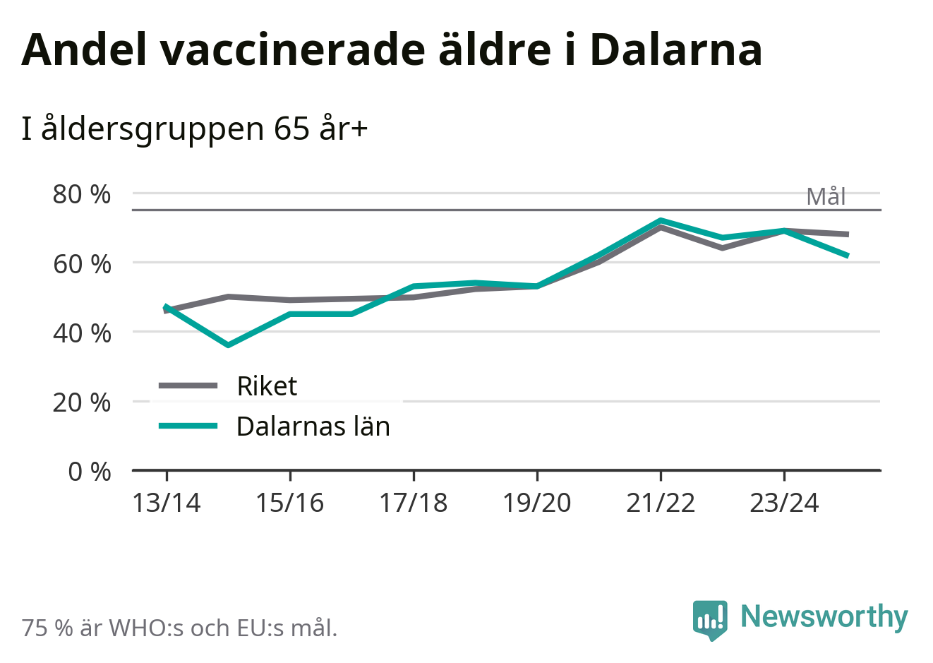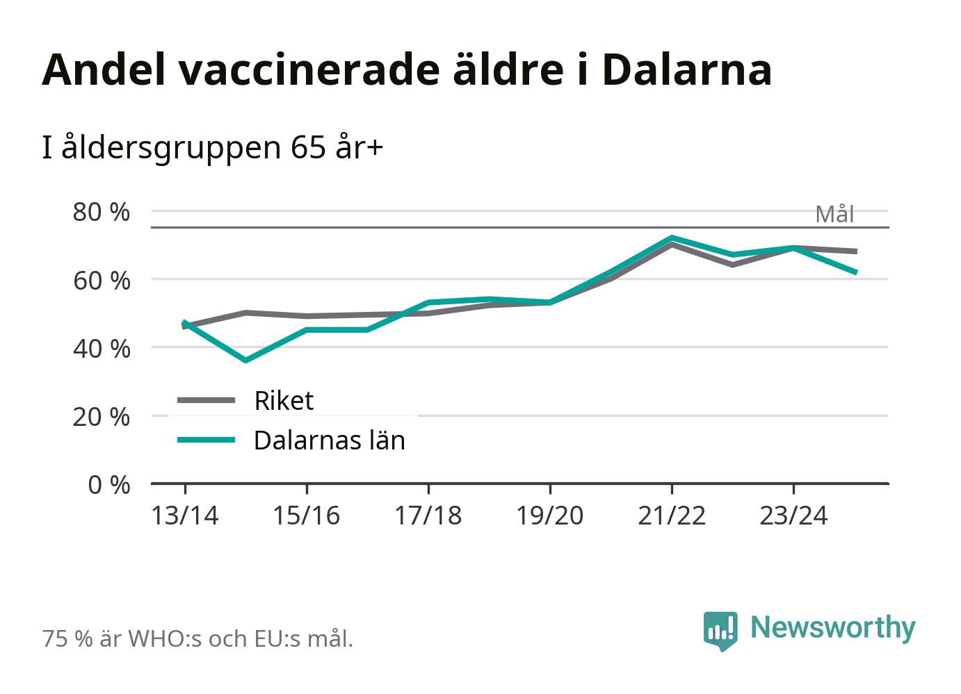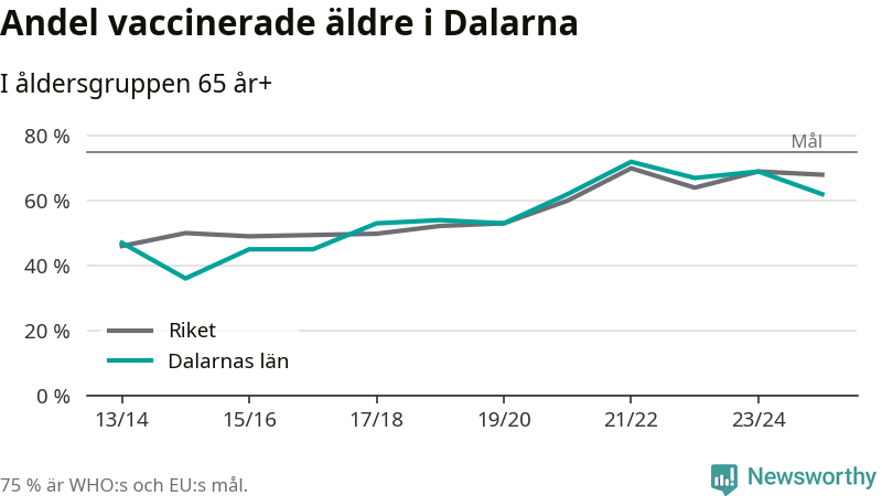 Region Dalarna når alltså inte heller vaccinationsmålet, men har en avsevärt högre täckning nu än före pandemin. 2014/15 var andelen exempelvis bara 36 procent.