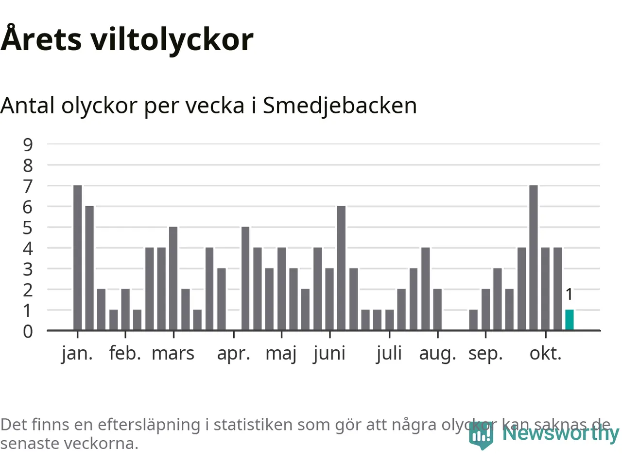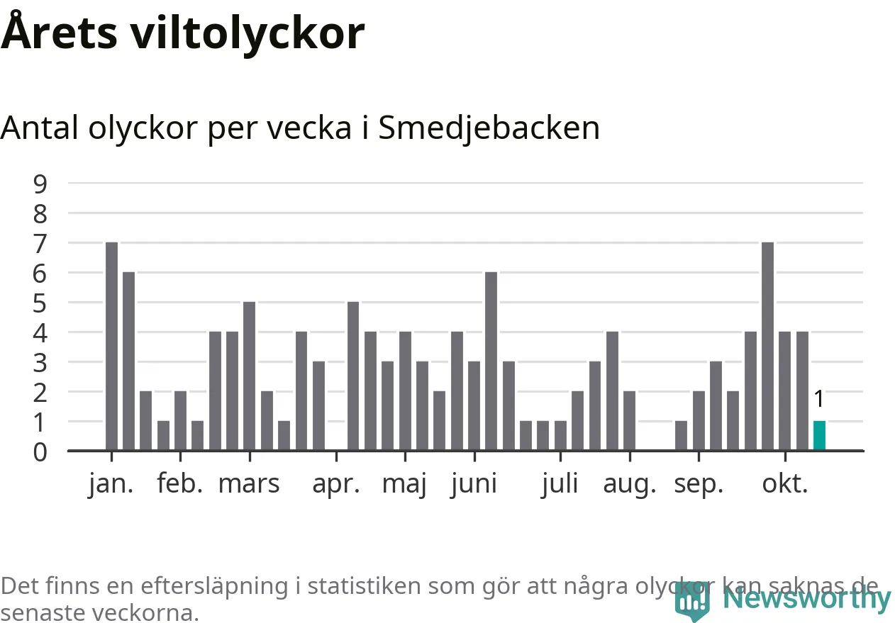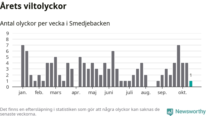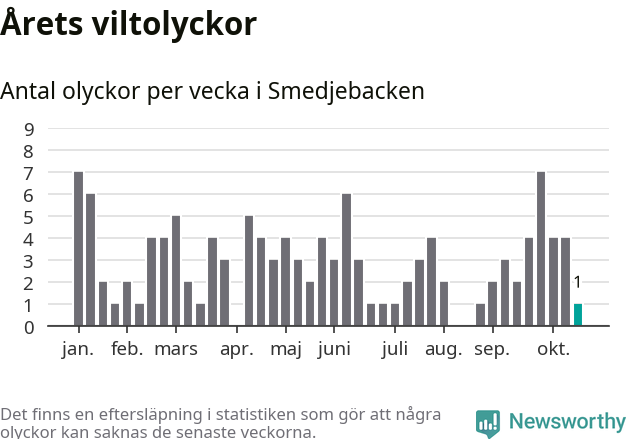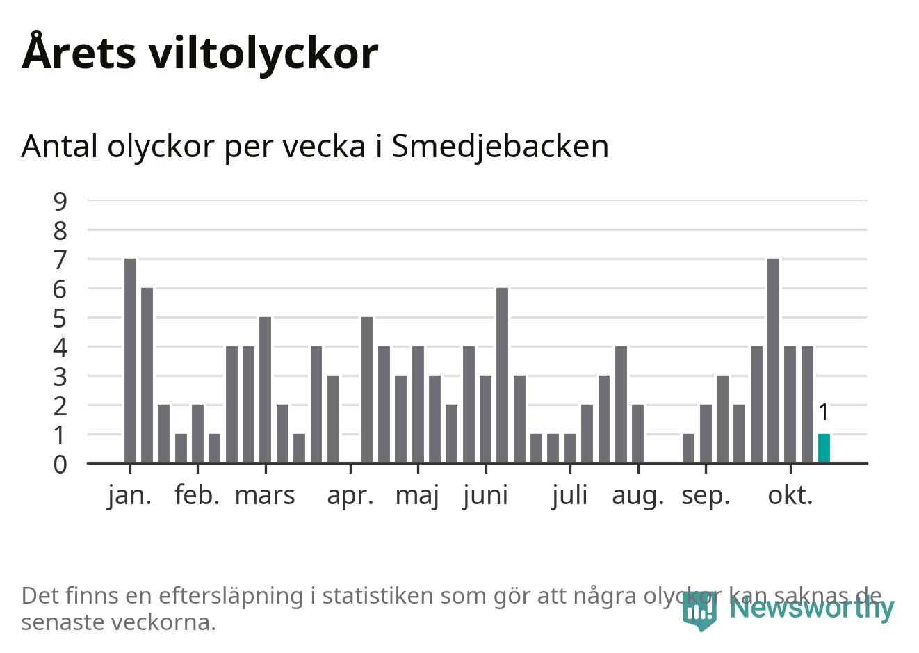 Från förra veckan (vecka 43) har hittills en viltolycka rapporterats in i Smedjebackens kommun.
