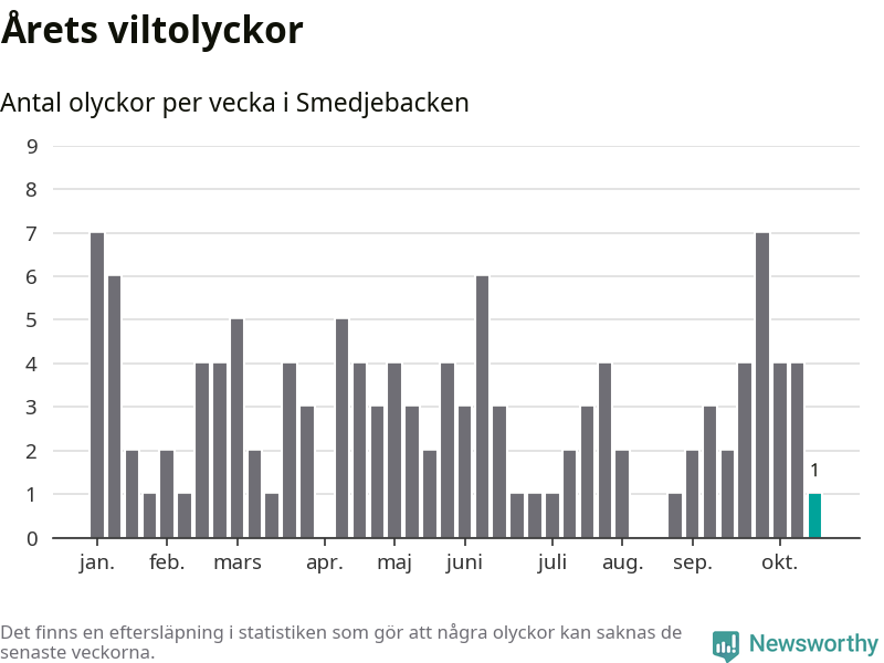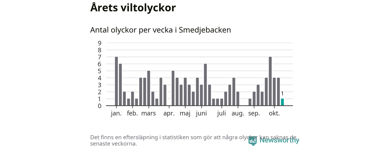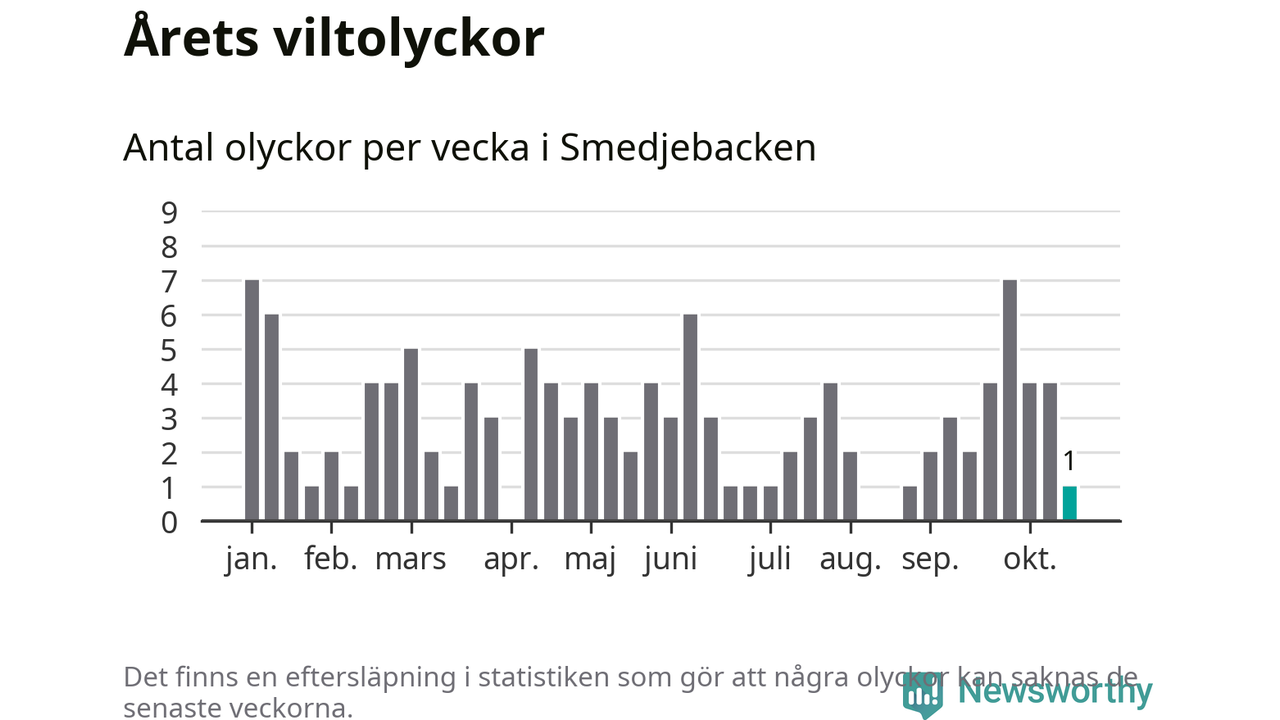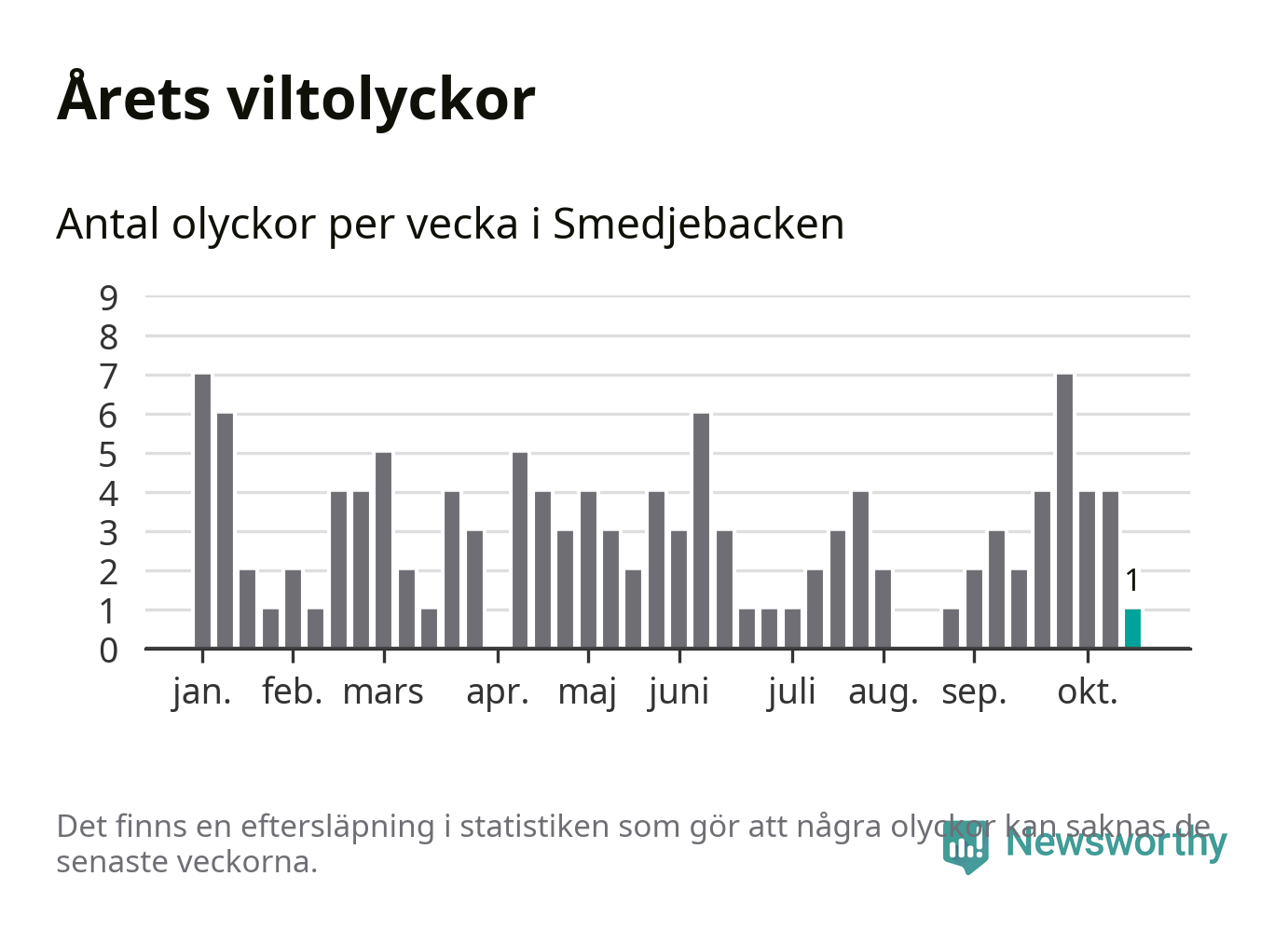 Från förra veckan (vecka 43) har hittills en viltolycka rapporterats in i Smedjebackens kommun.