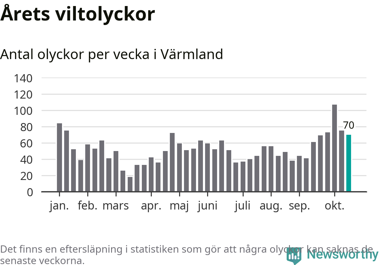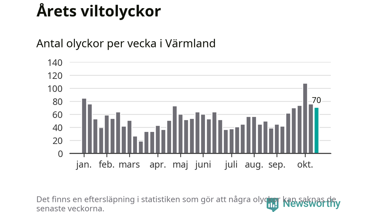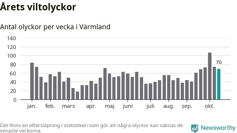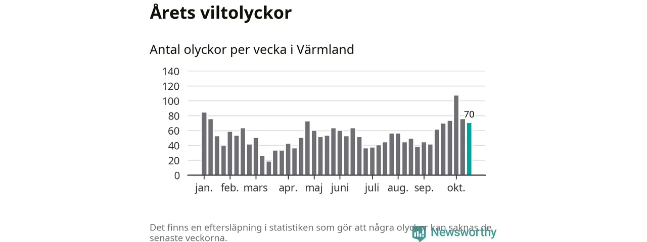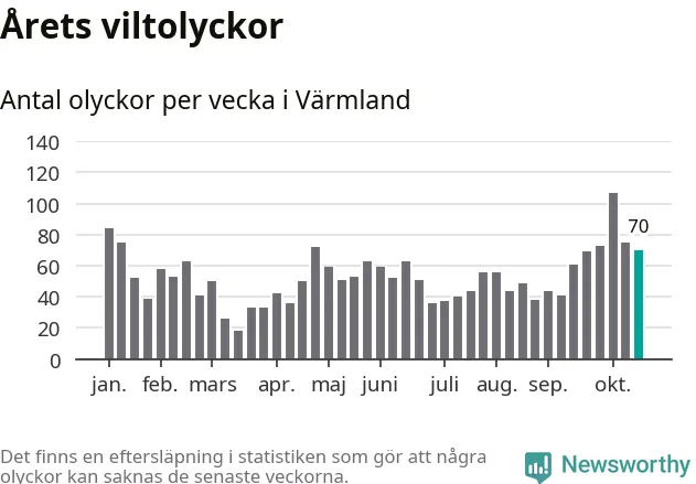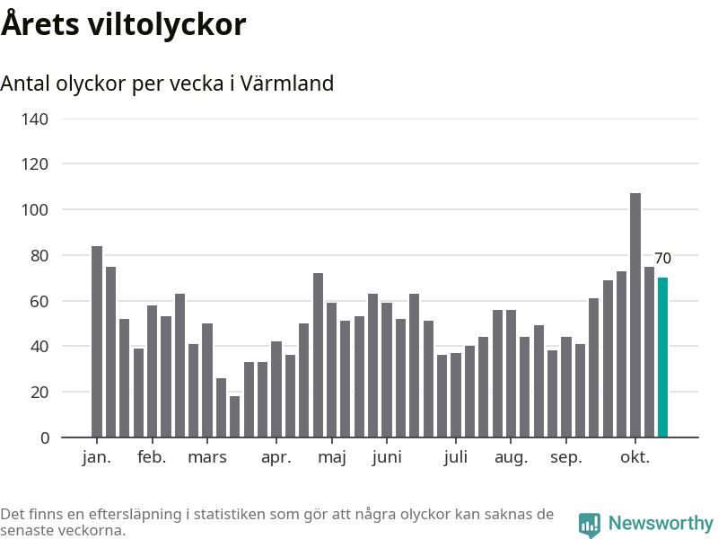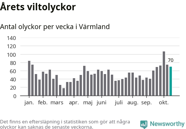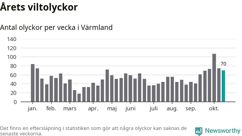 Hittills har 70 viltolyckor rapporterats in i Värmlands län från vecka 43. Se listan här.