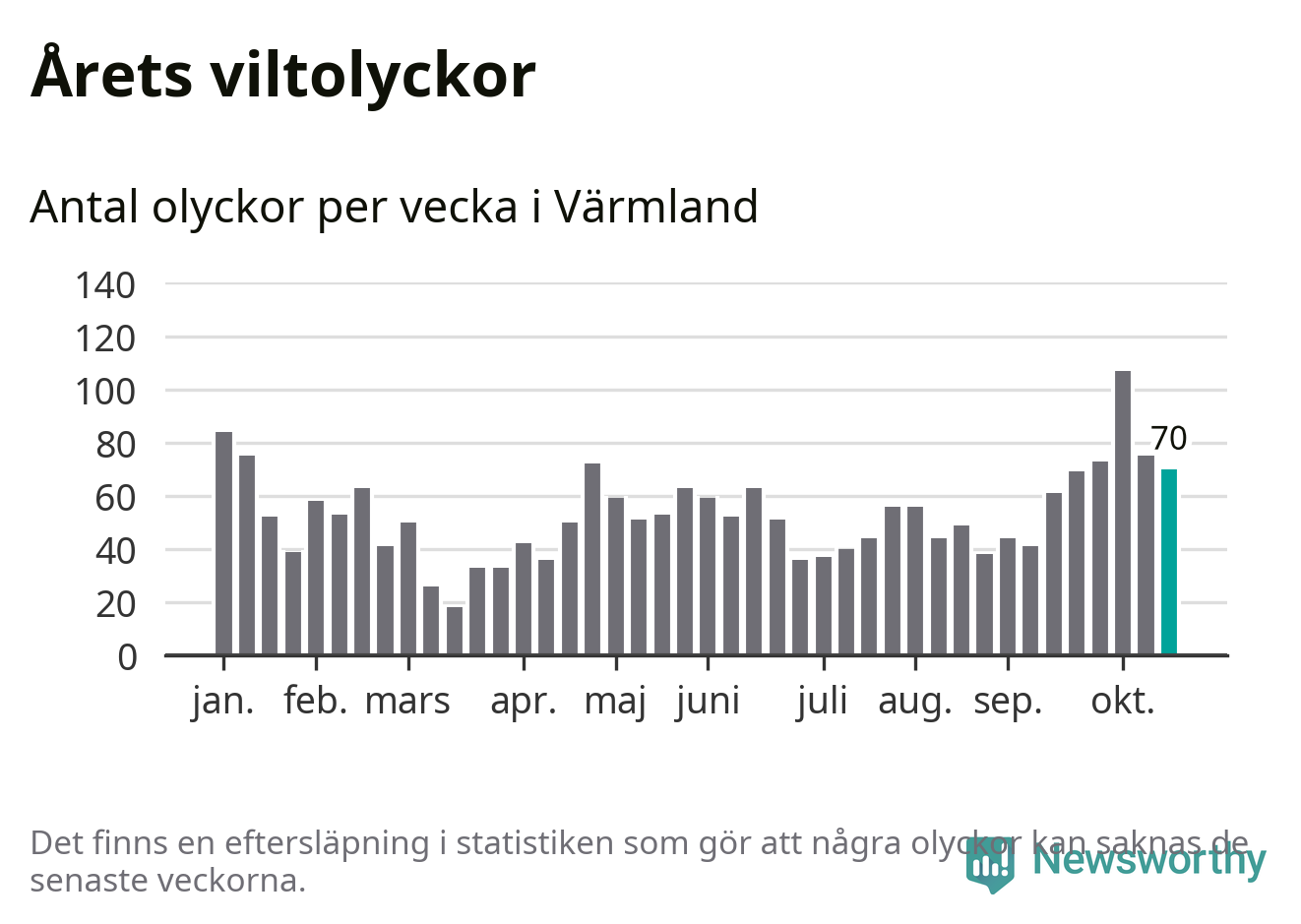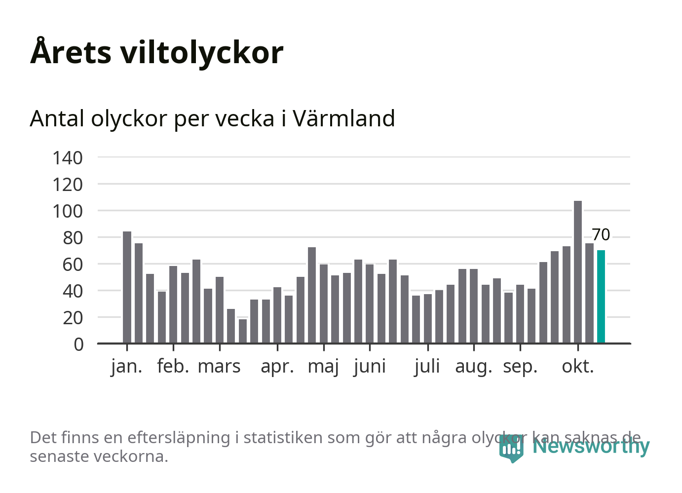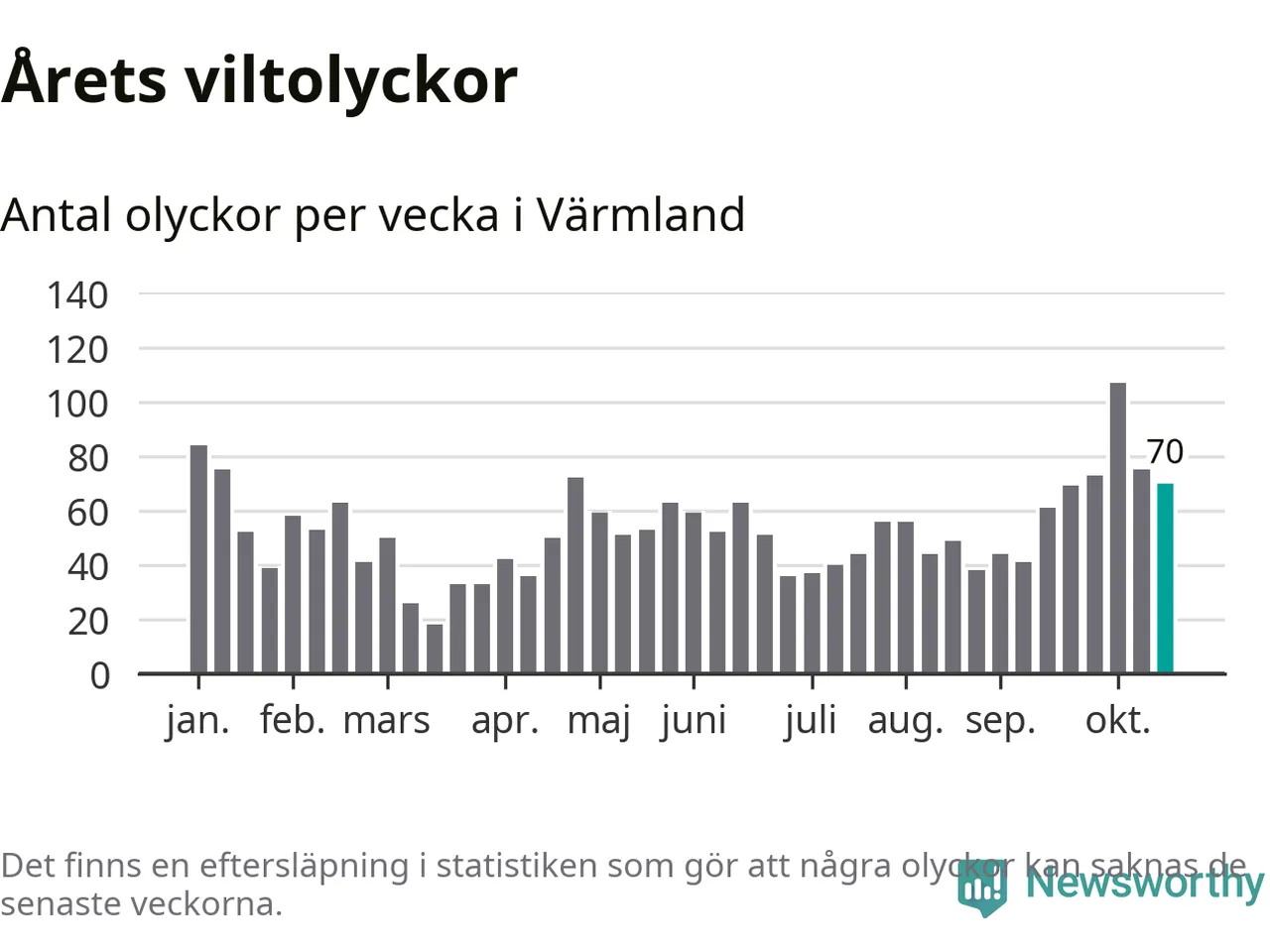 Hittills har 70 viltolyckor rapporterats in i Värmlands län från vecka 43. Se listan här.