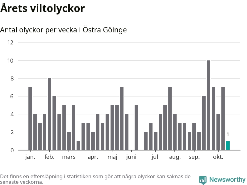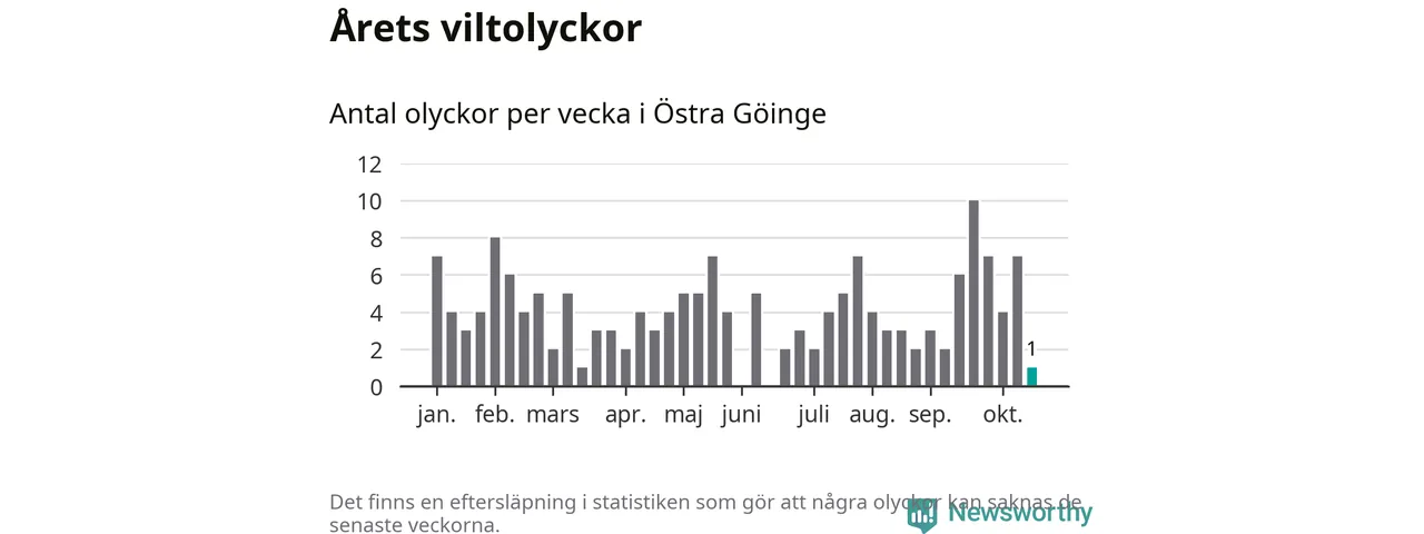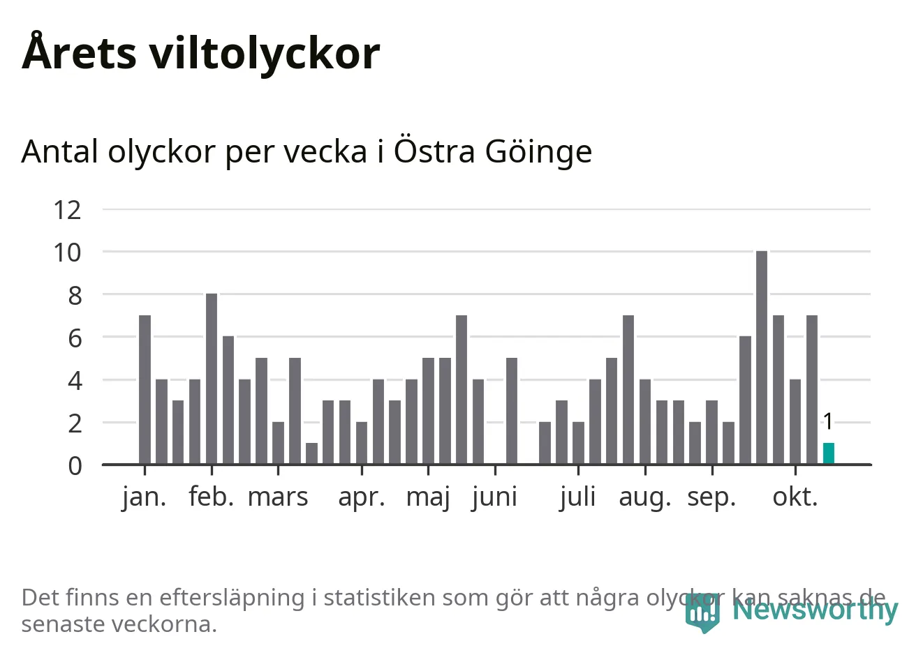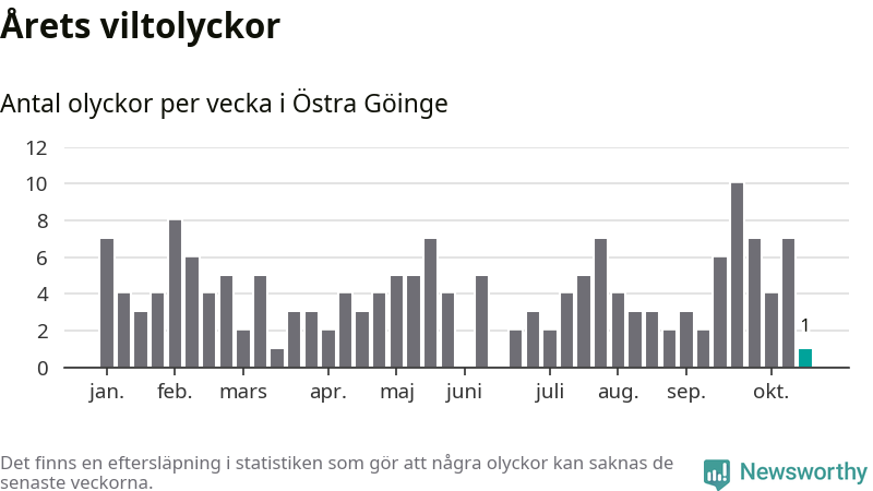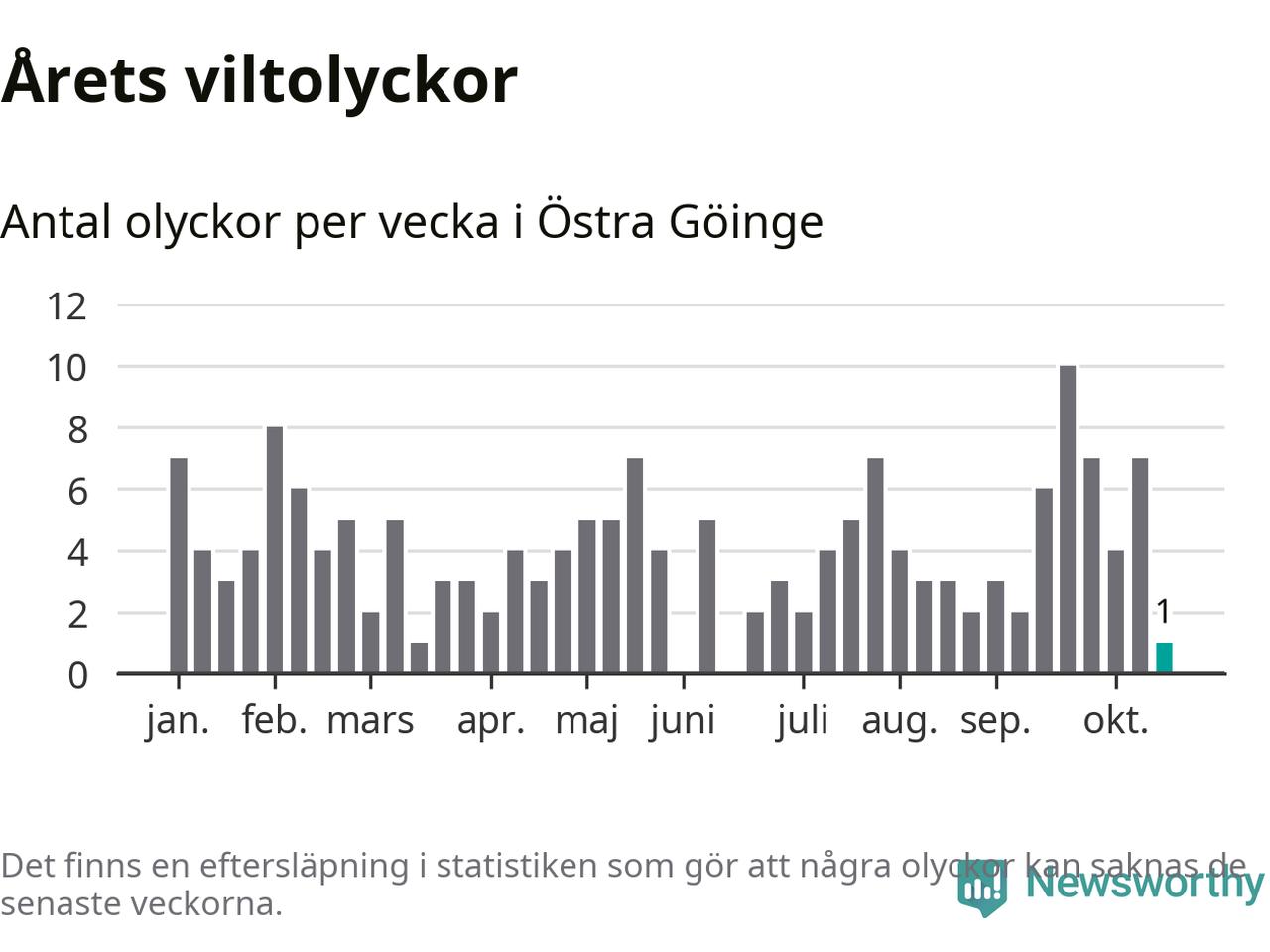Från förra veckan (vecka 43) har hittills en viltolycka rapporterats in i Östra Göinge kommun.