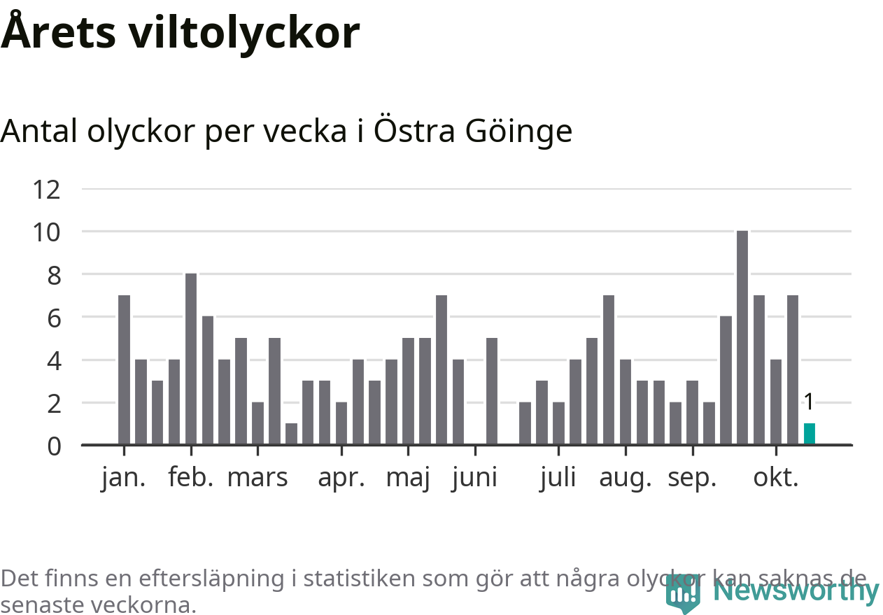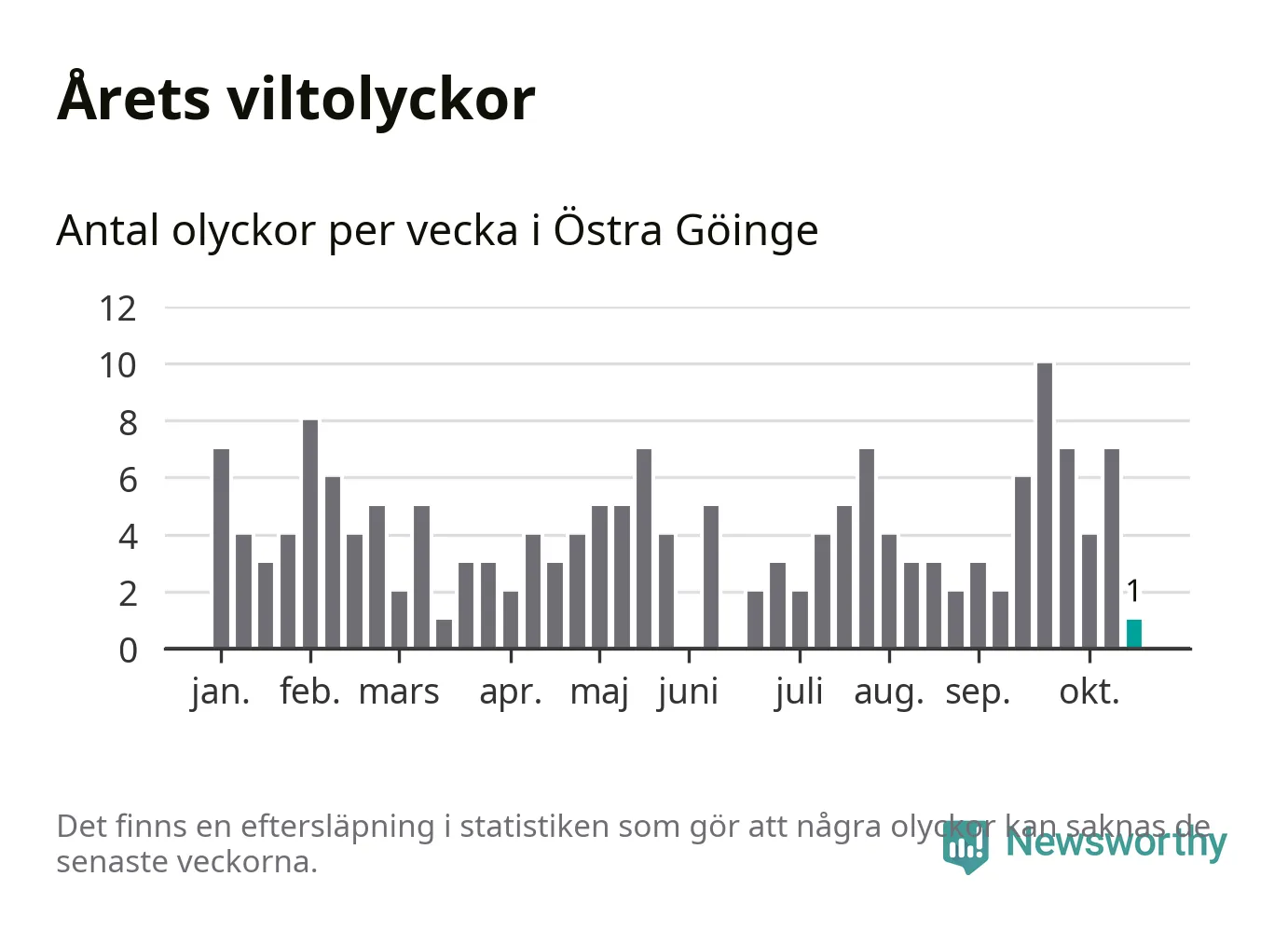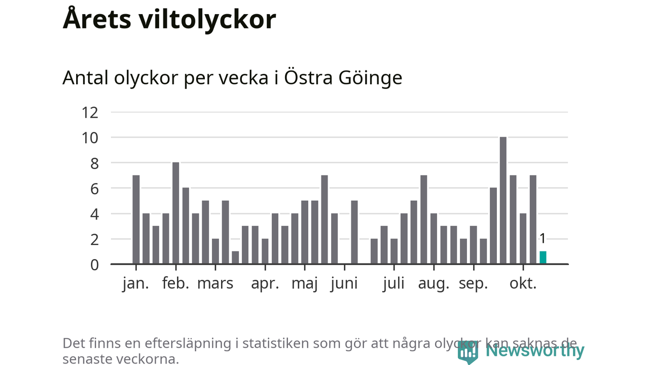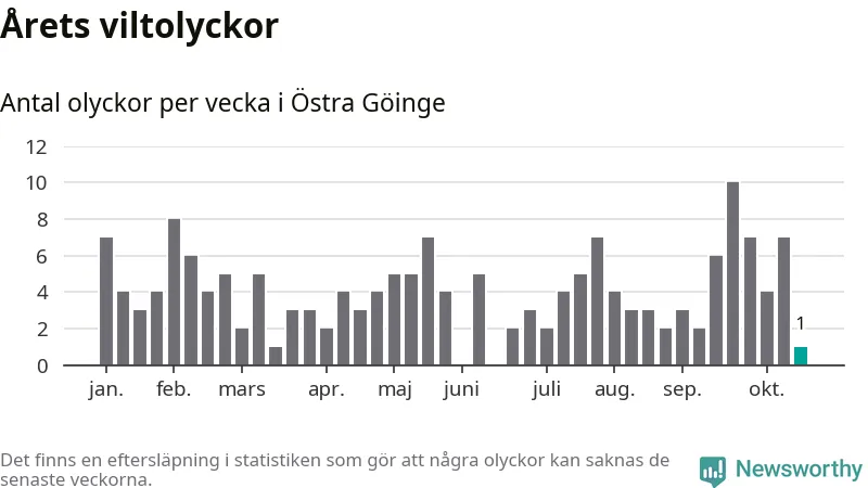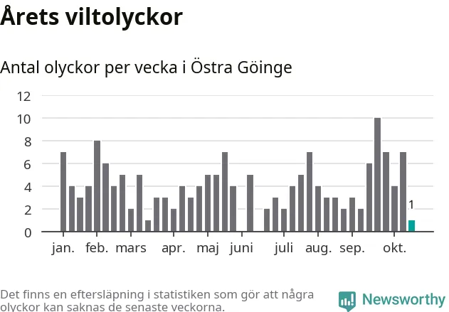 Från förra veckan (vecka 43) har hittills en viltolycka rapporterats in i Östra Göinge kommun.