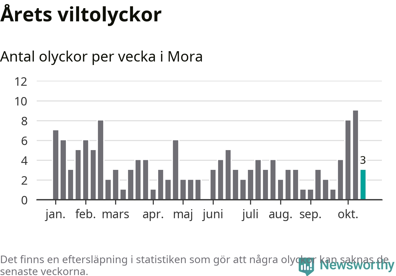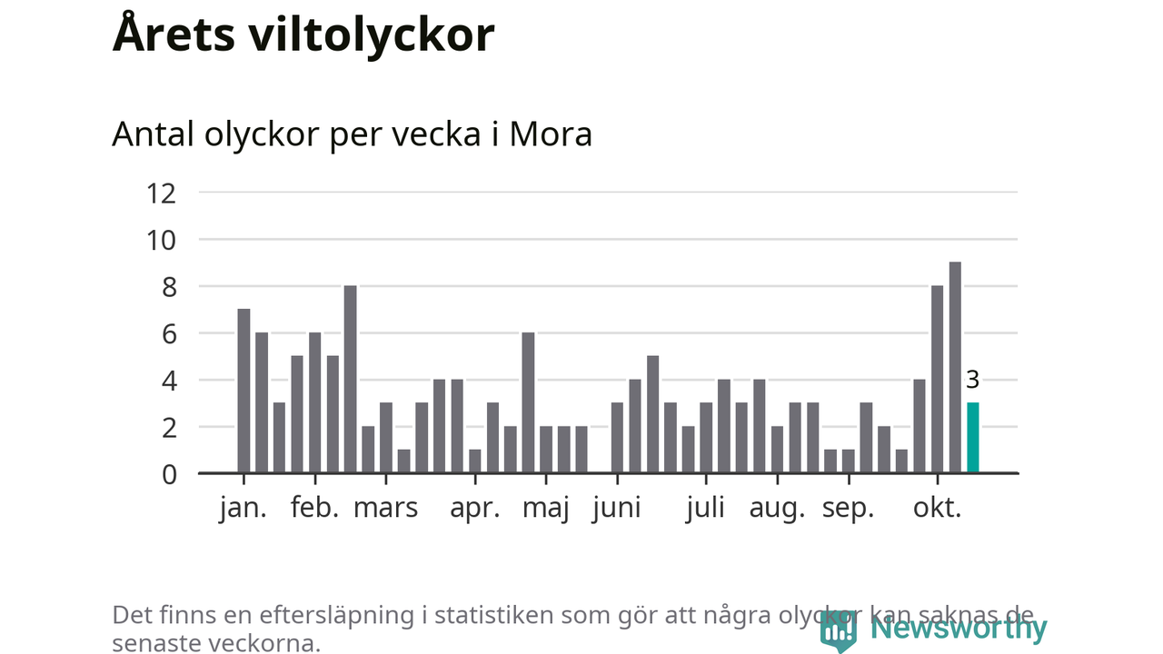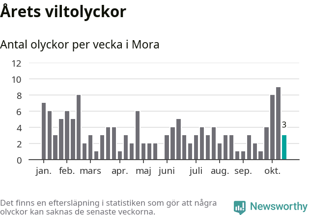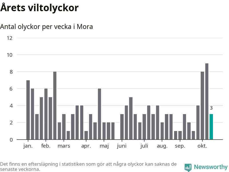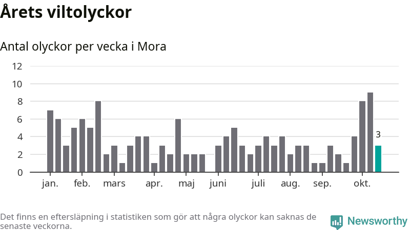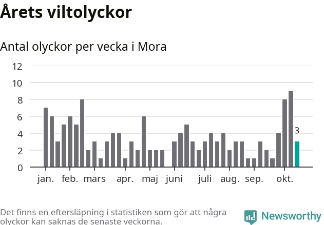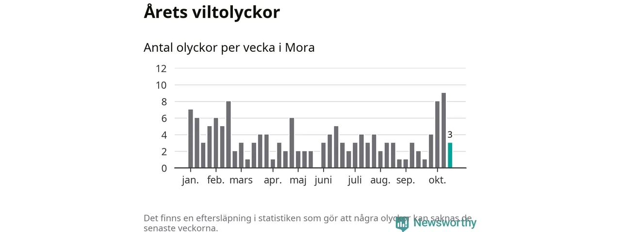 Hittills har tre viltolyckor rapporterats in i Mora kommun från vecka 43. Se listan här.