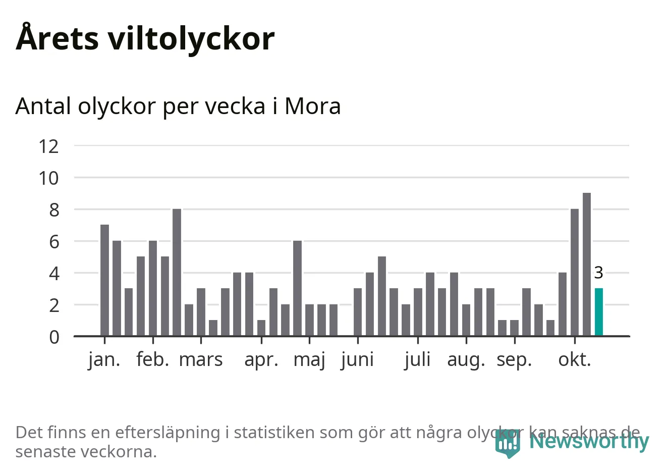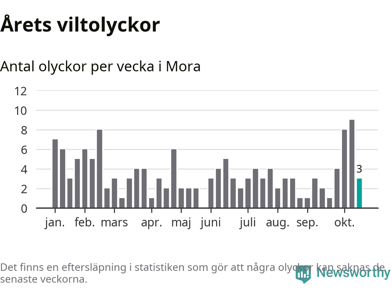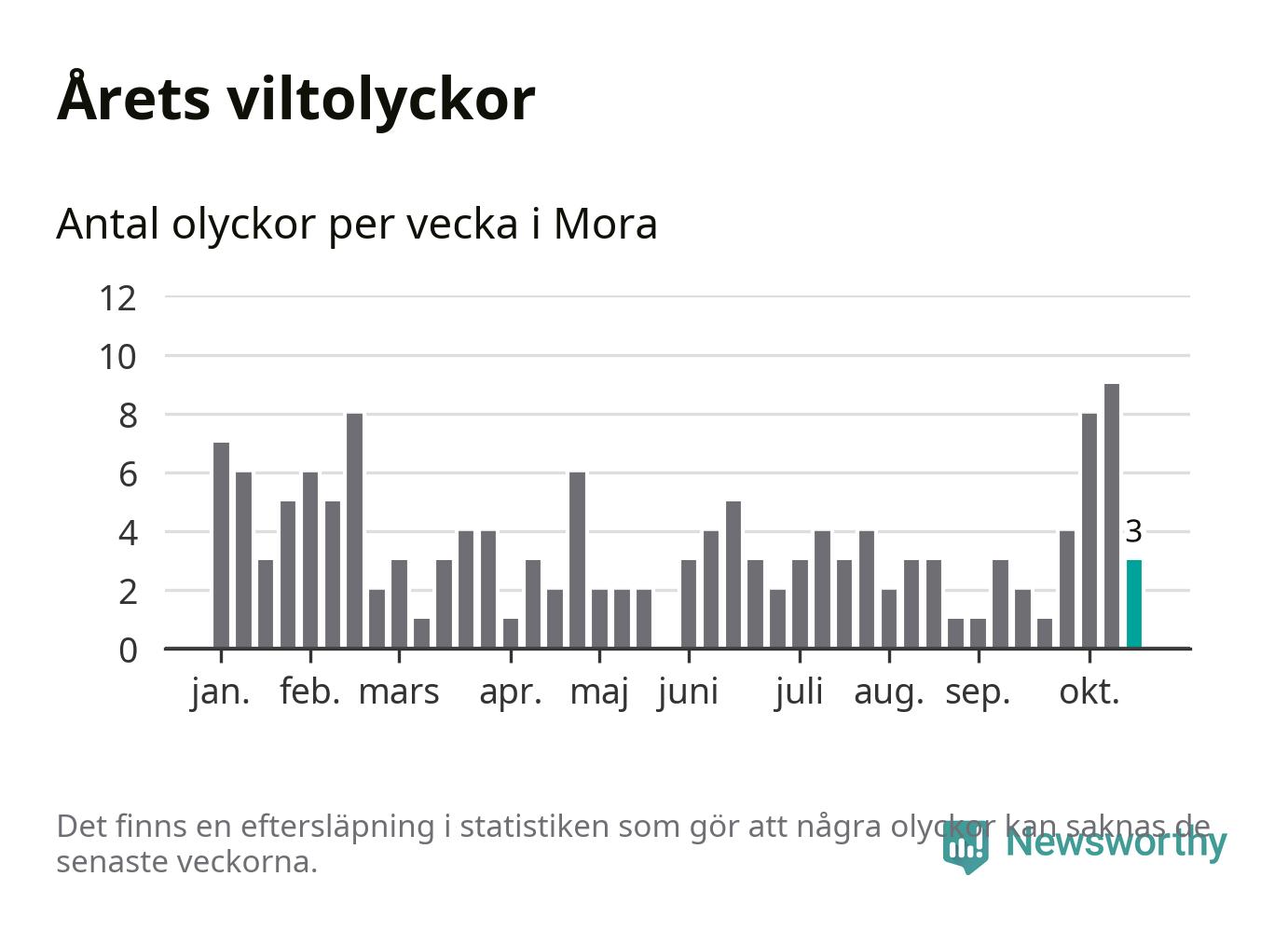 Hittills har tre viltolyckor rapporterats in i Mora kommun från vecka 43. Se listan här.