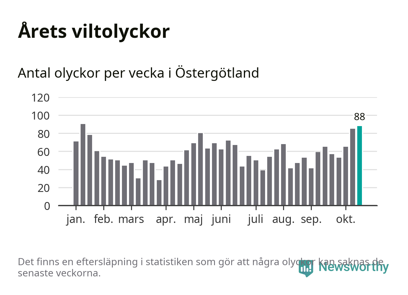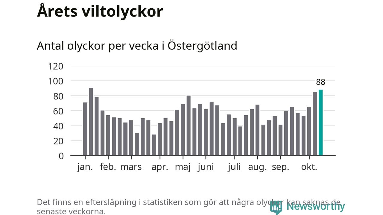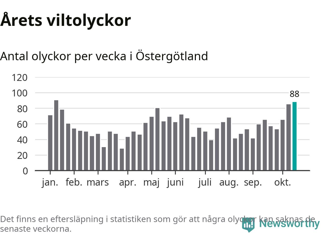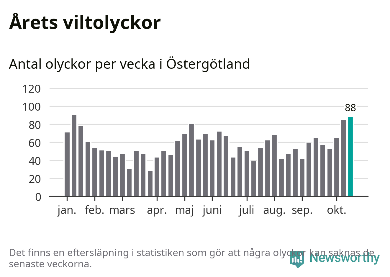 Hittills har 88 viltolyckor rapporterats in i Östergötlands län från vecka 43. Se listan här.