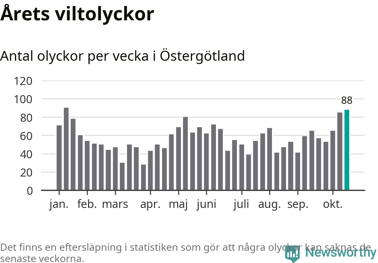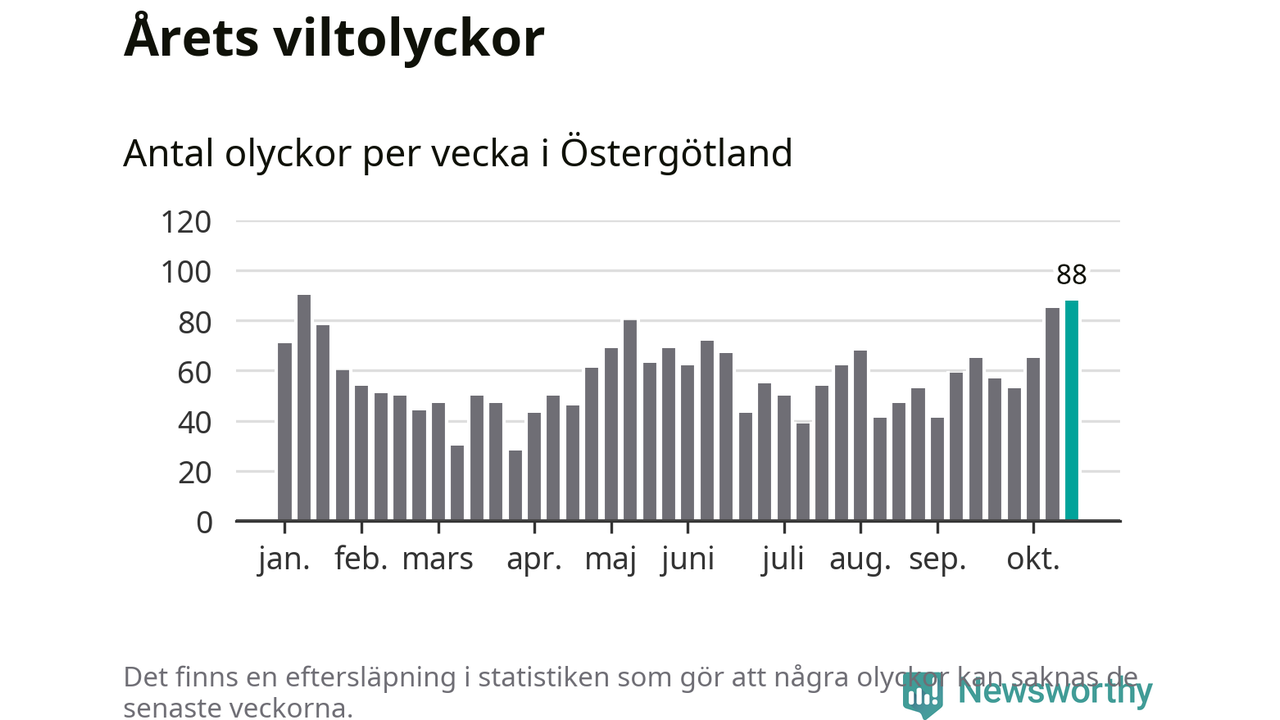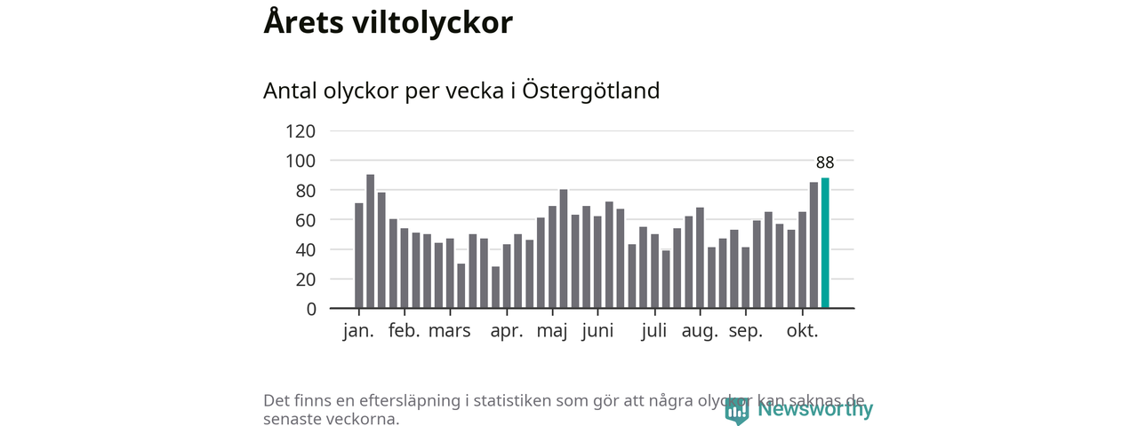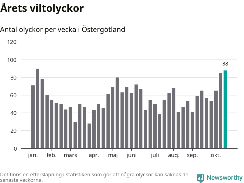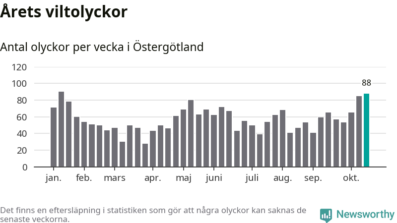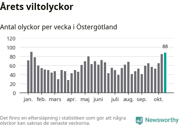 Hittills har 88 viltolyckor rapporterats in i Östergötlands län från vecka 43. Se listan här.