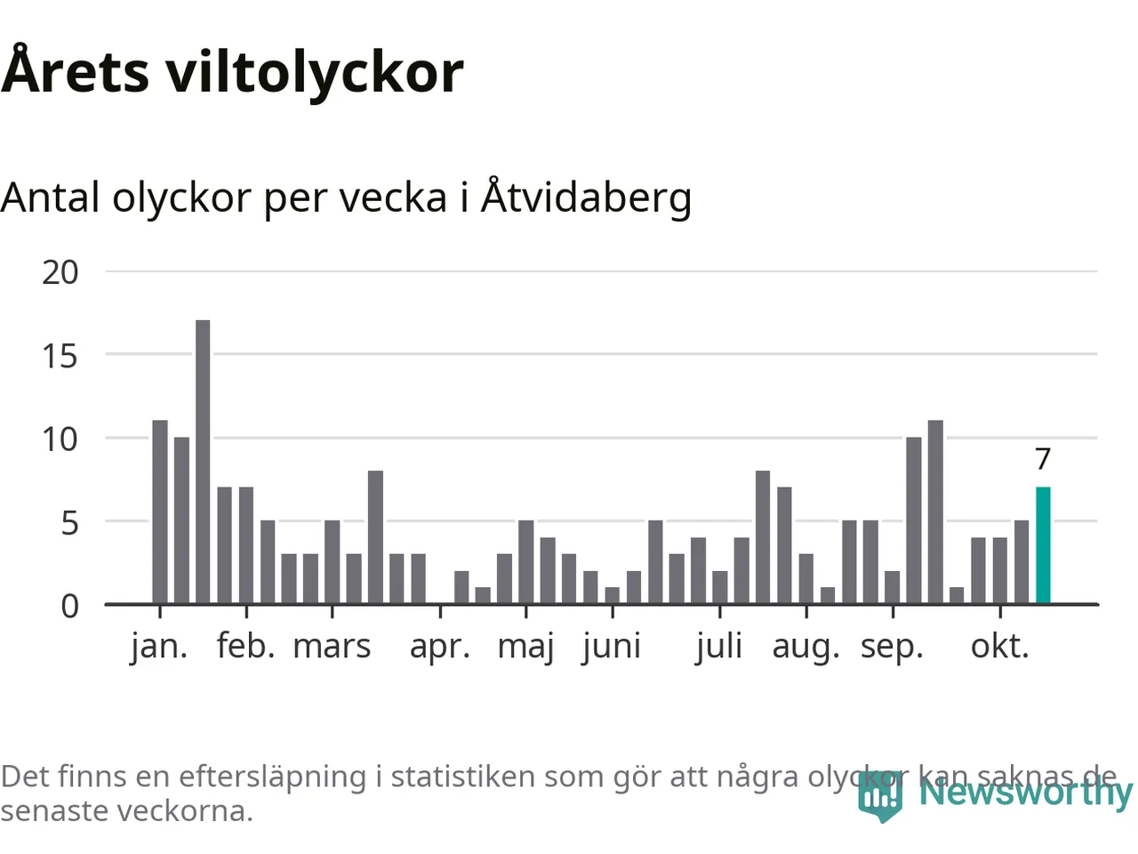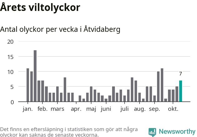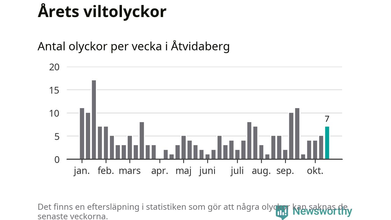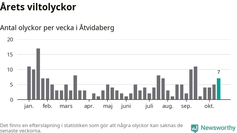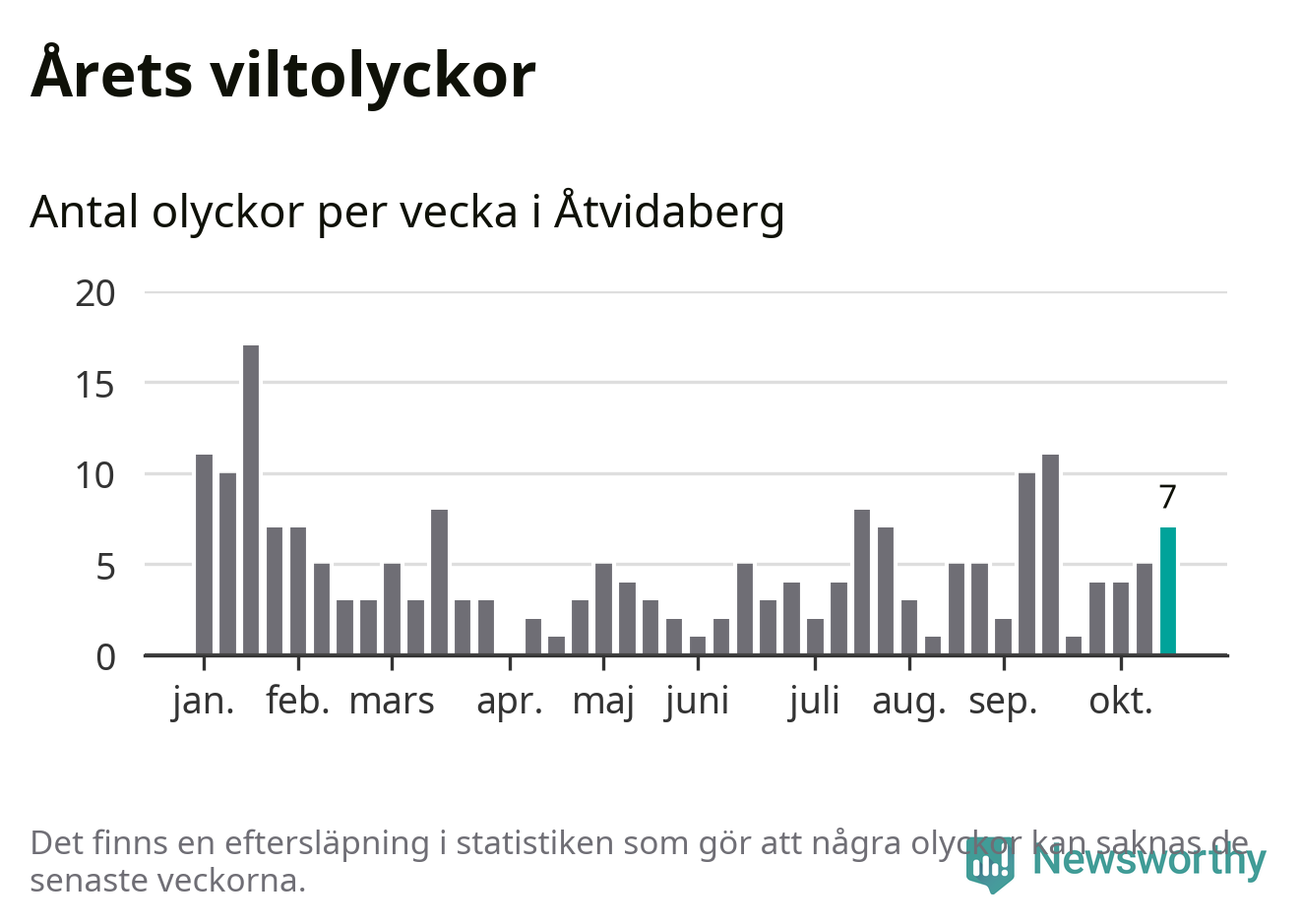 Hittills har sju viltolyckor rapporterats in i Åtvidabergs kommun från vecka 43. Se listan här.