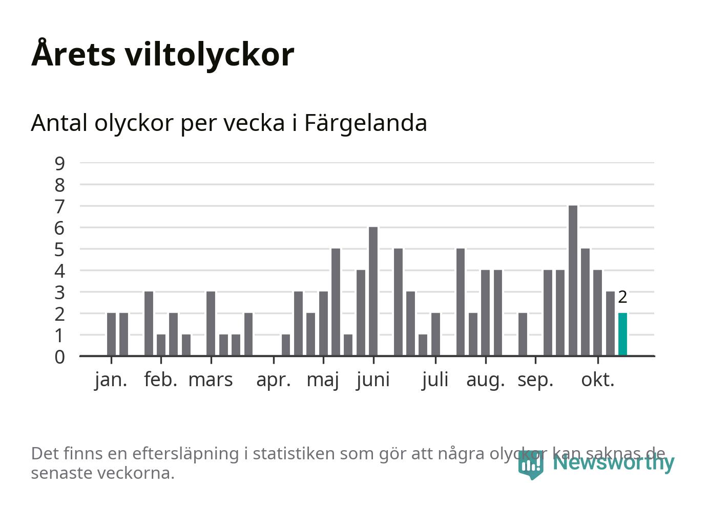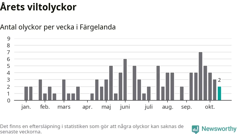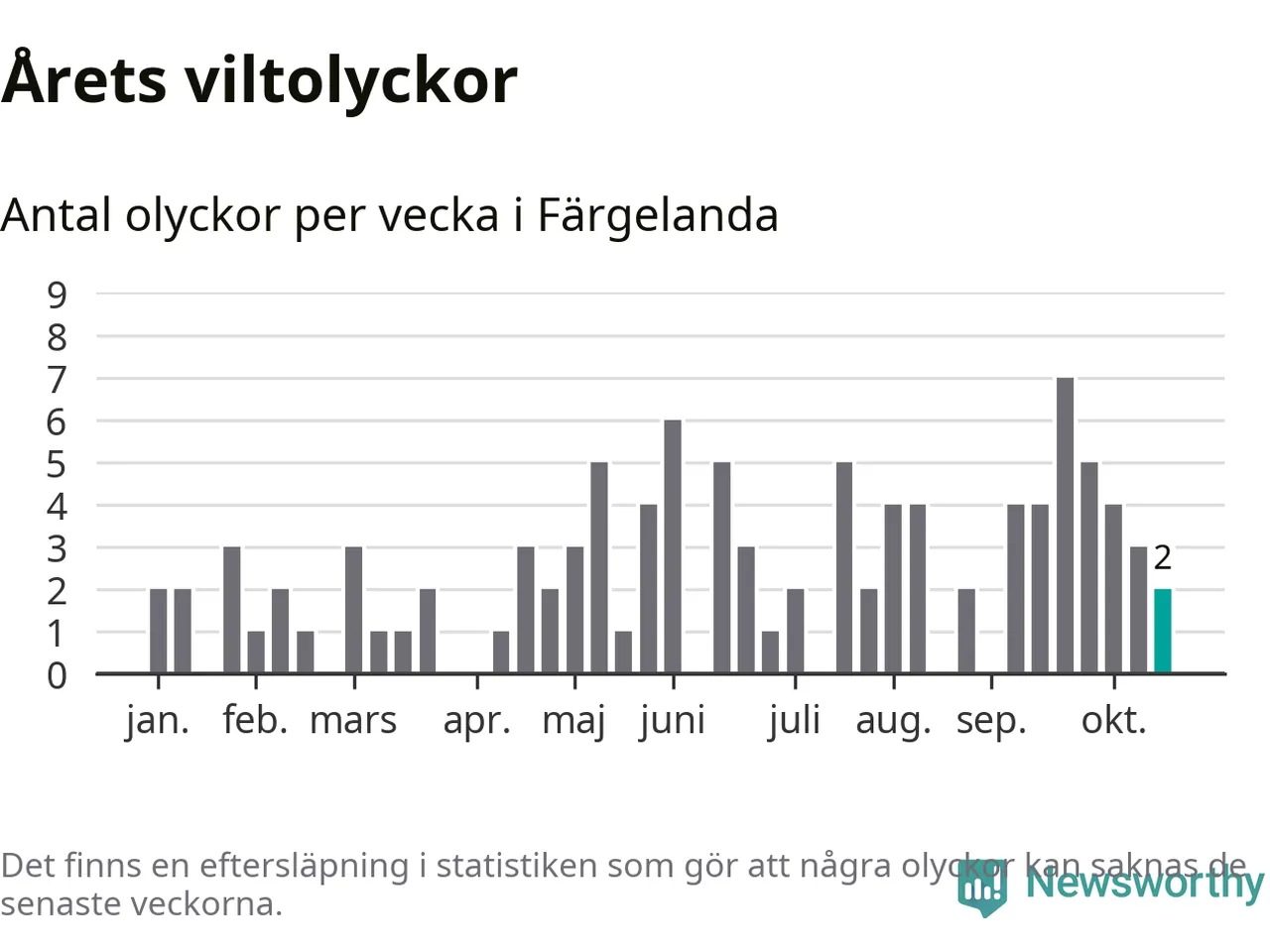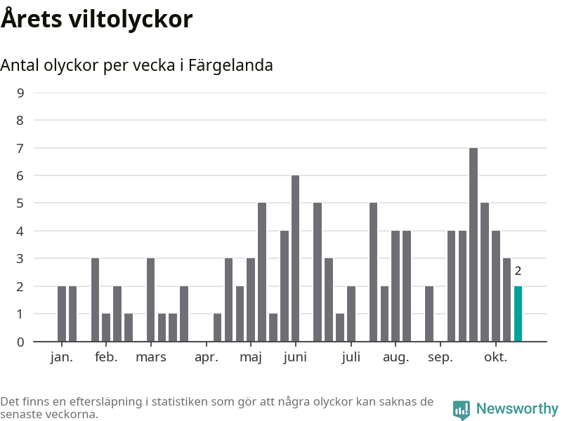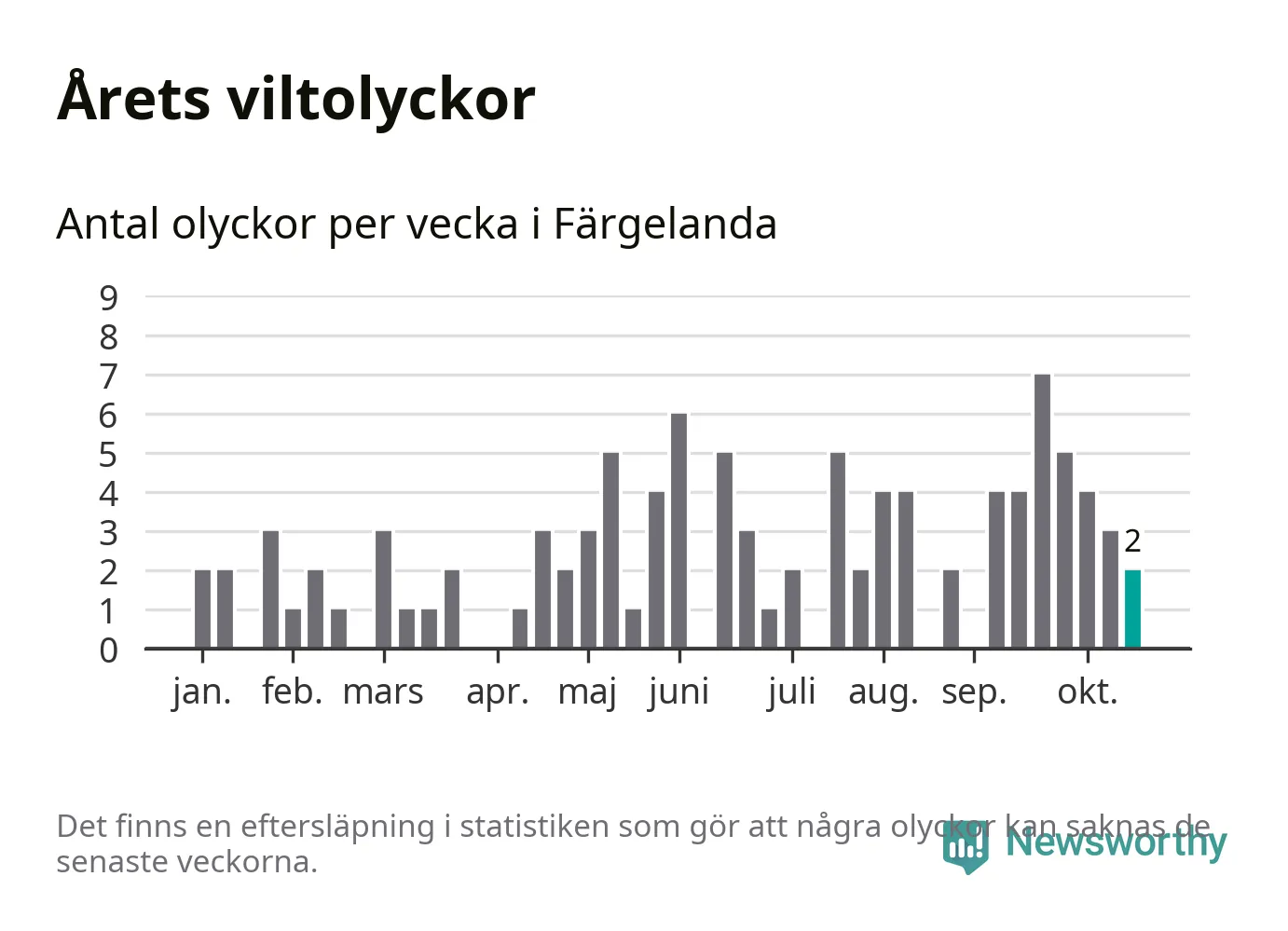 Hittills har två viltolyckor rapporterats in i Färgelanda kommun från vecka 43. Se listan här.