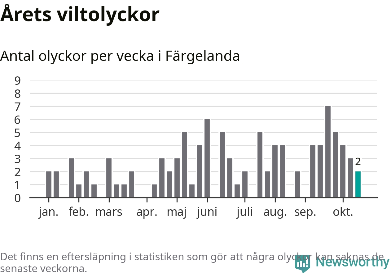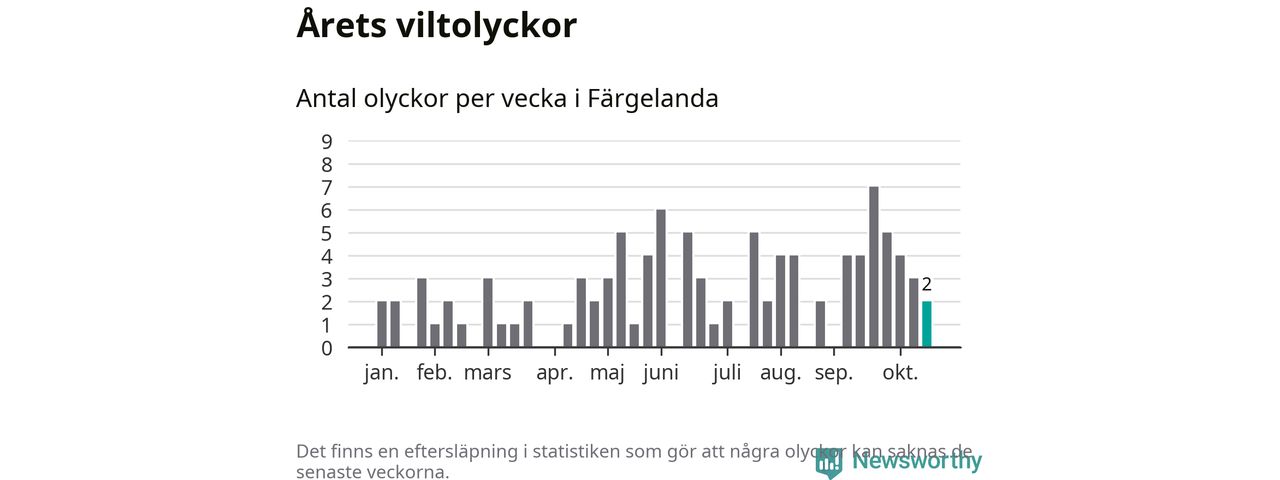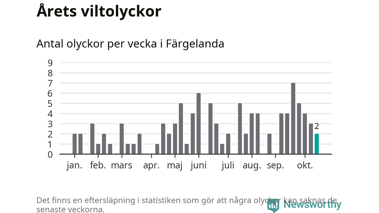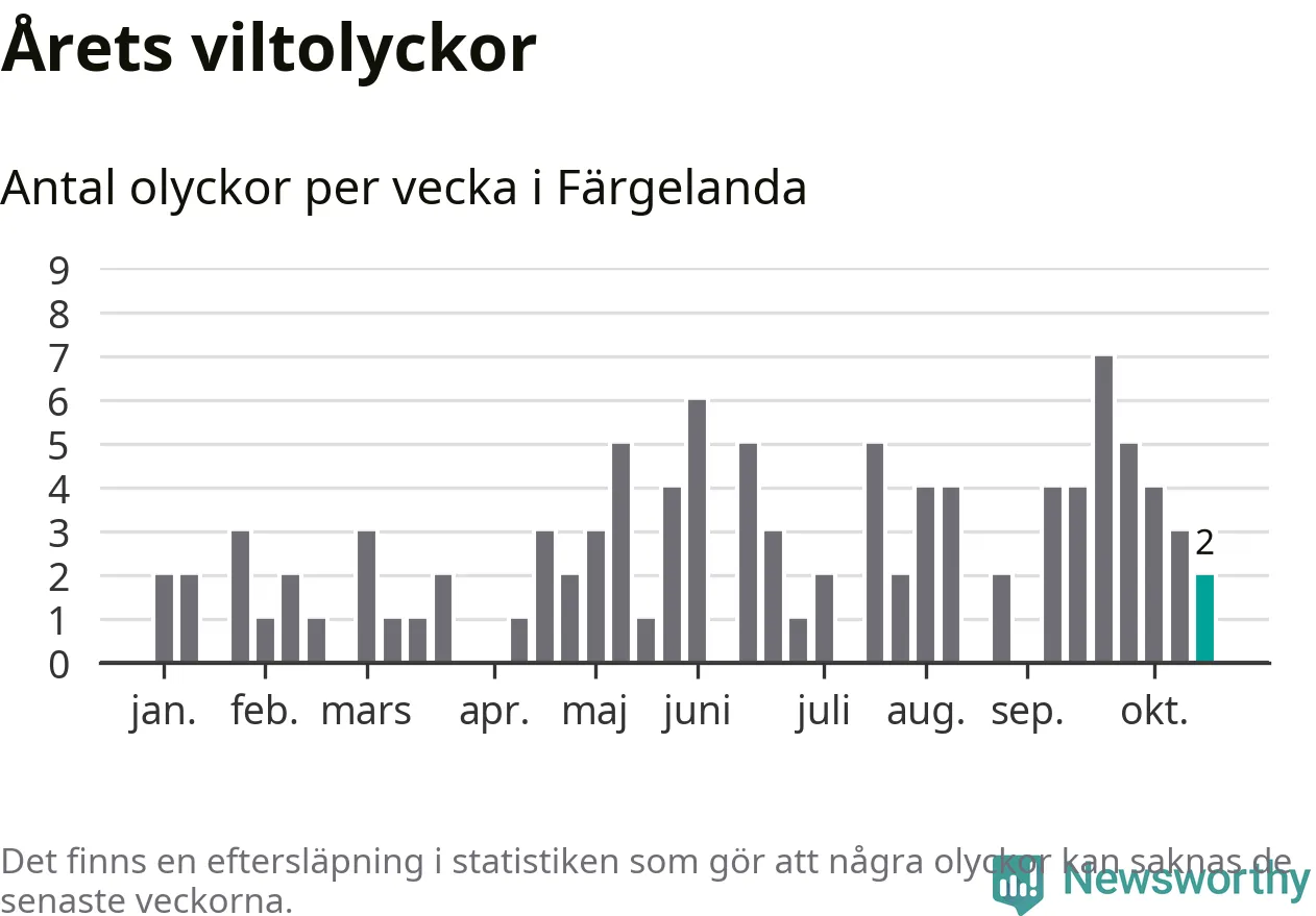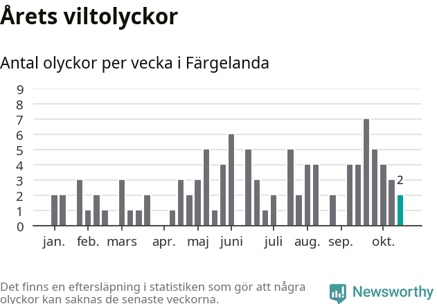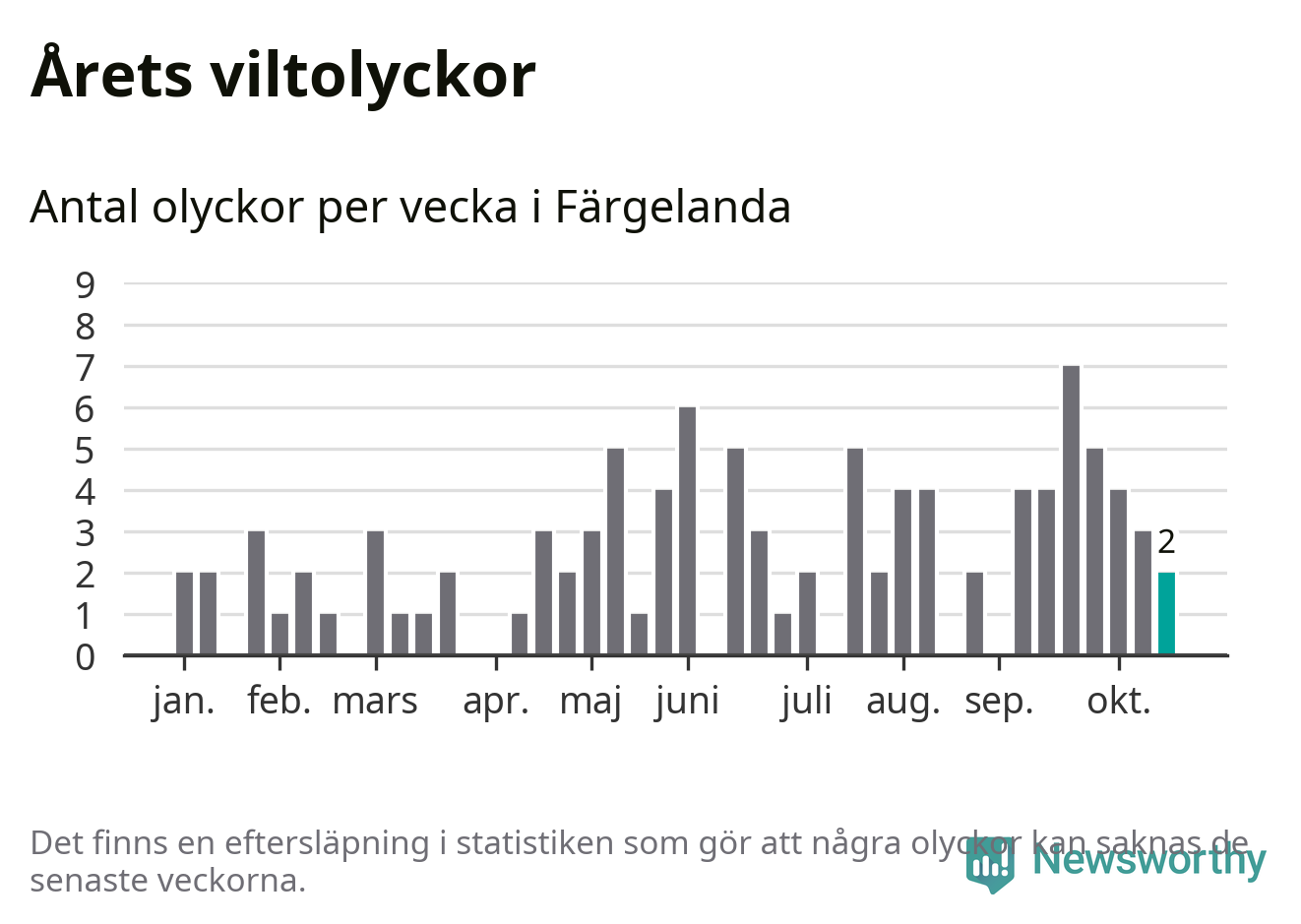 Hittills har två viltolyckor rapporterats in i Färgelanda kommun från vecka 43. Se listan här.