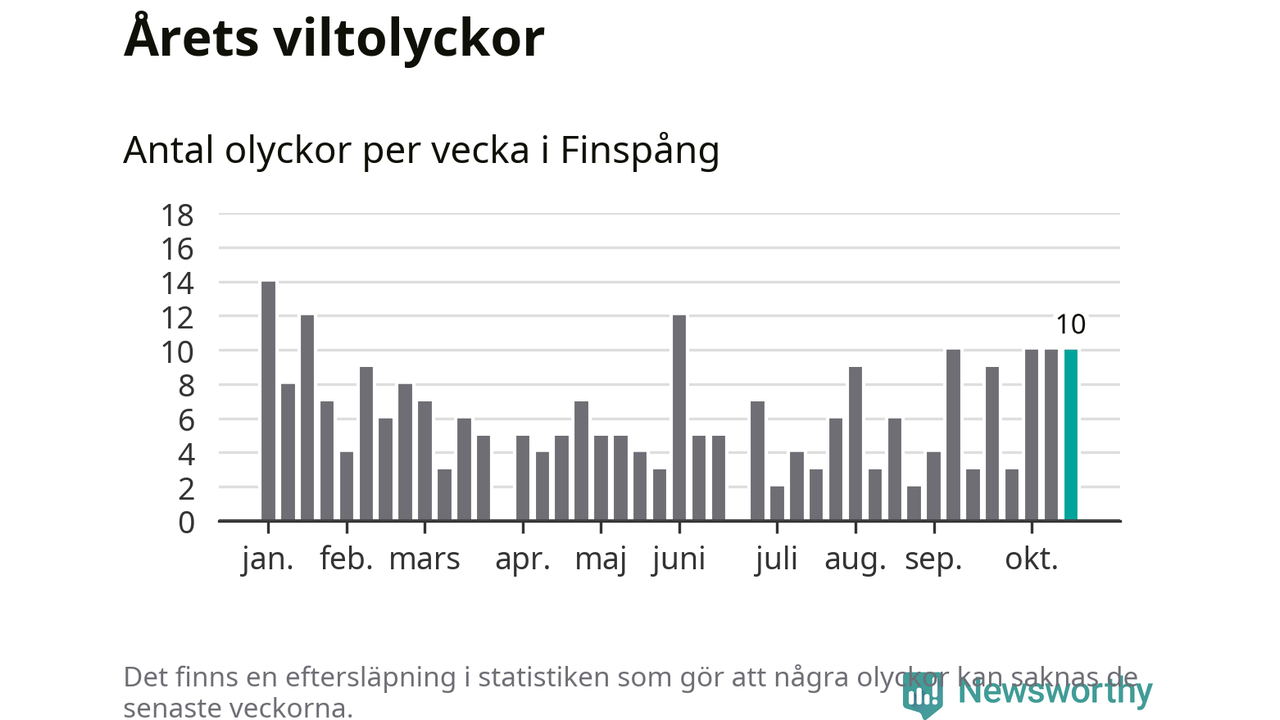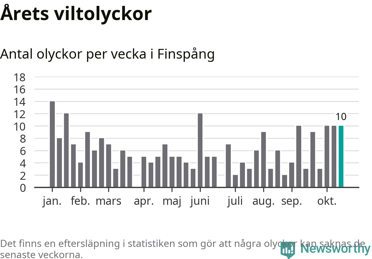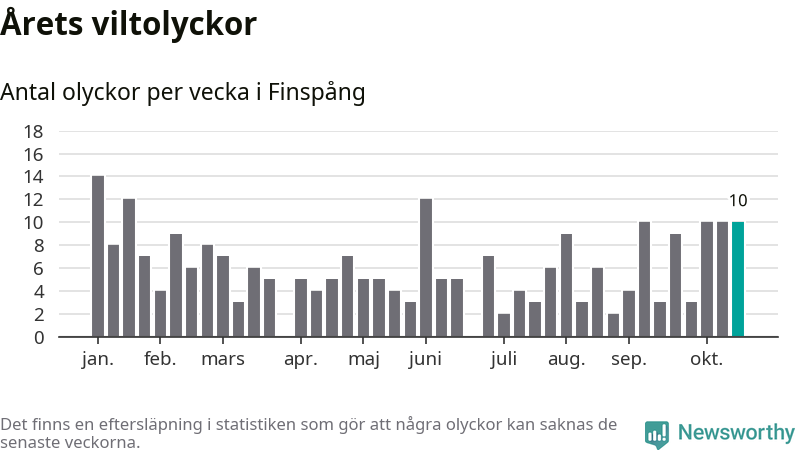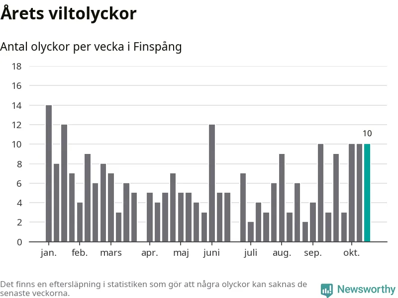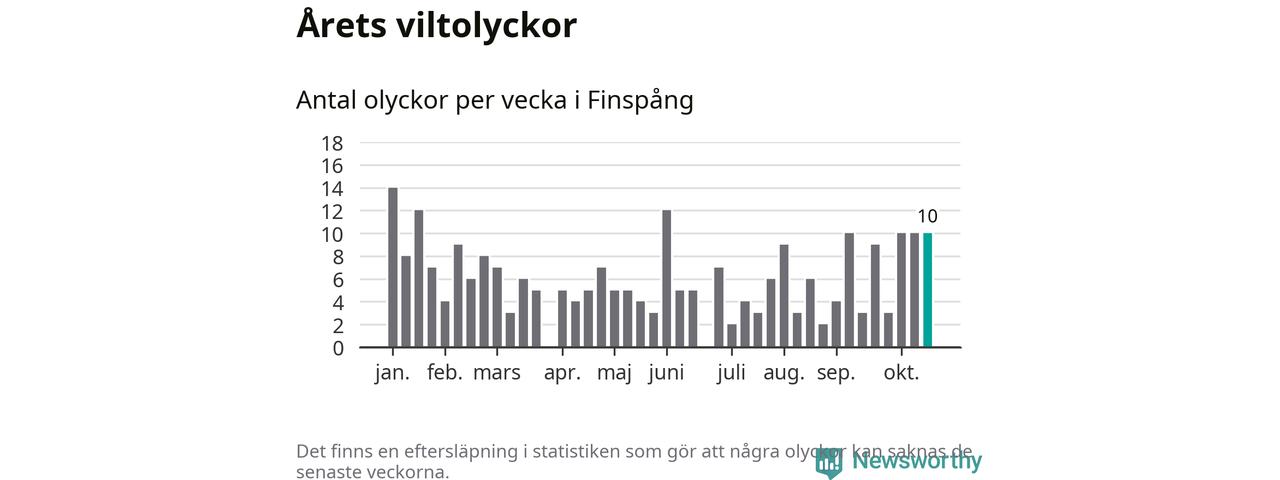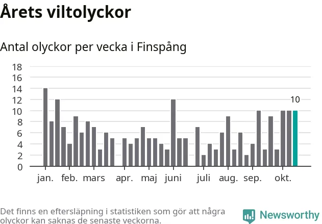 Hittills har tio viltolyckor rapporterats in i Finspångs kommun från vecka 43. Se listan här.