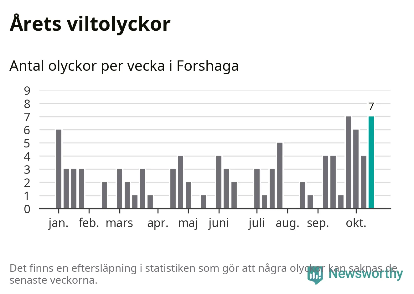 94 viltolyckor i kommunen. Det är en normal nivå i förhållande till hur det har sett ut under de senaste tio åren – genomsnittet för motsvarande period är 100.