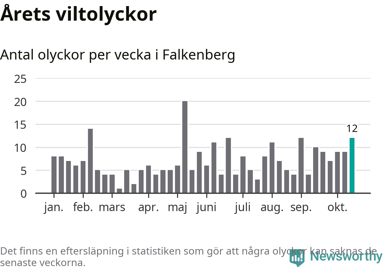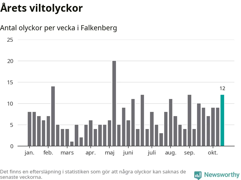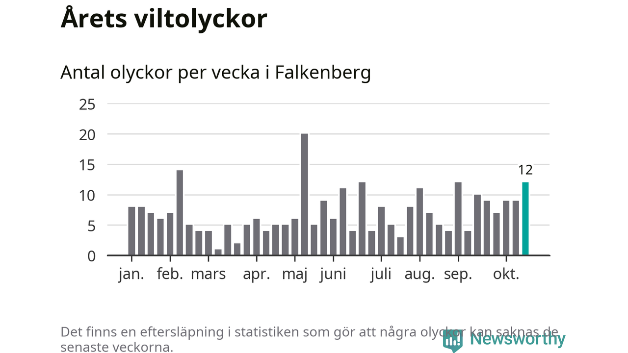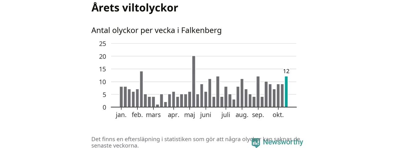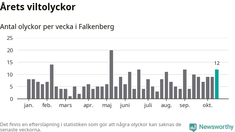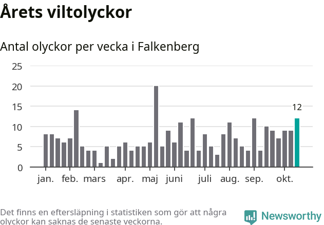 Hittills har tolv viltolyckor rapporterats in i Falkenbergs kommun från vecka 43. Se listan här.