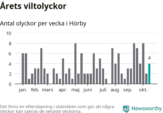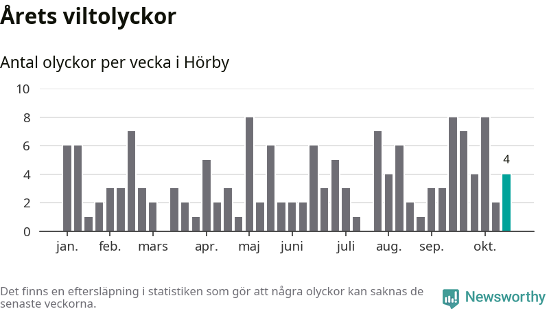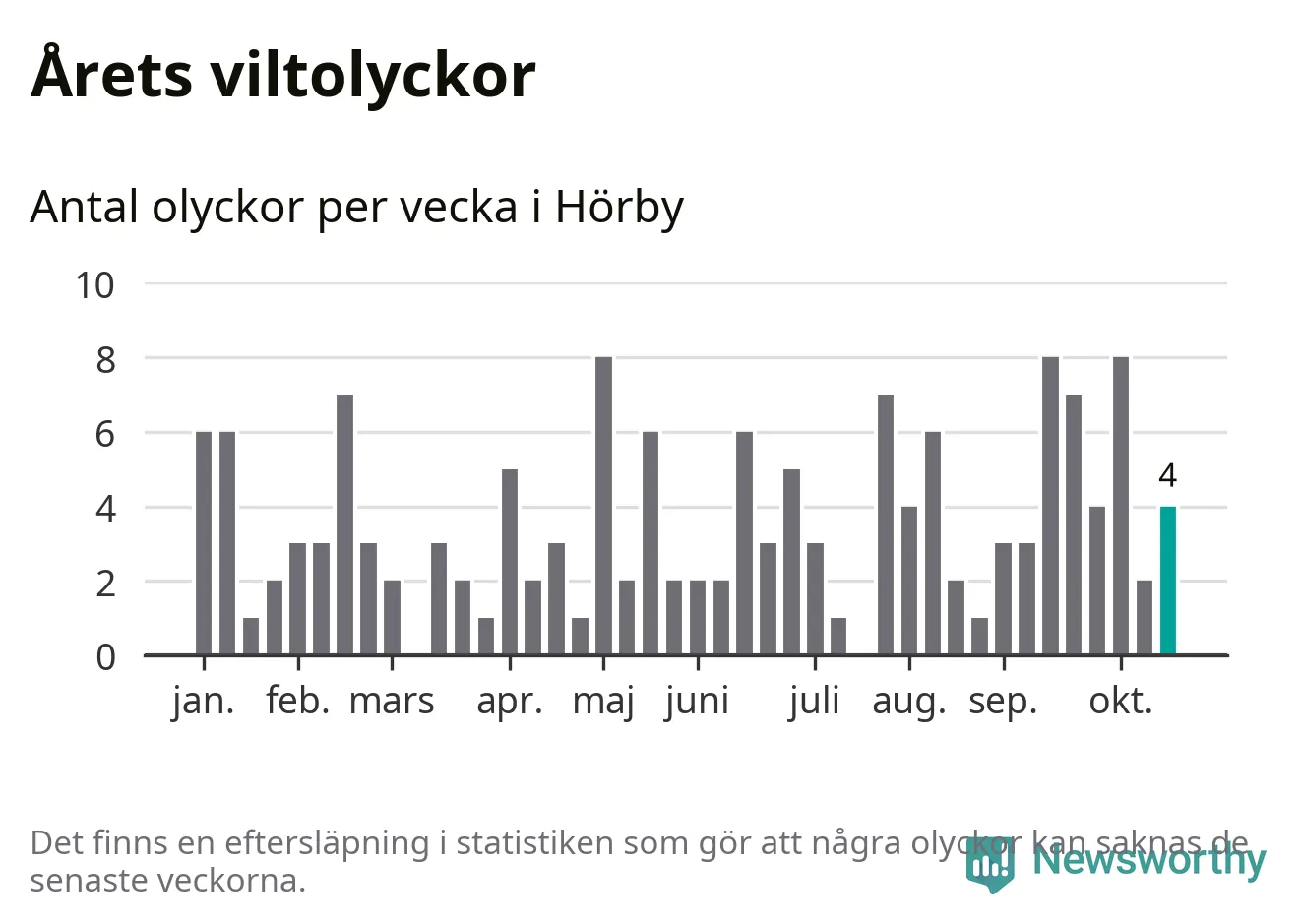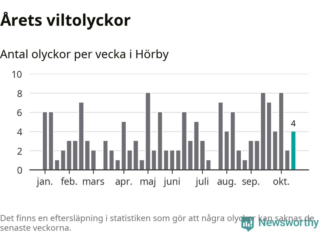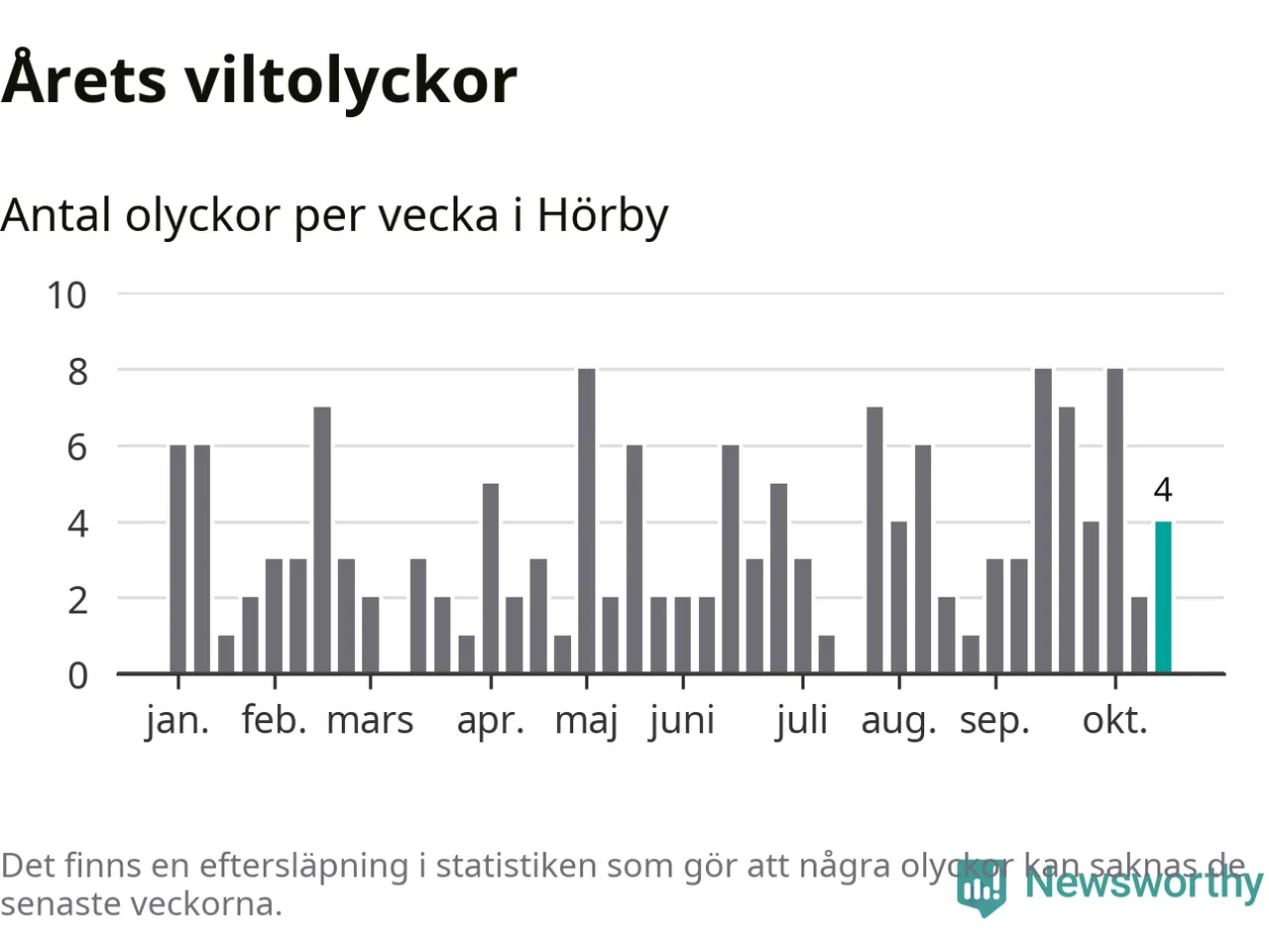Hittills har fyra viltolyckor rapporterats in i Hörby kommun från vecka 43. Se listan här.