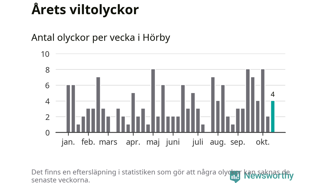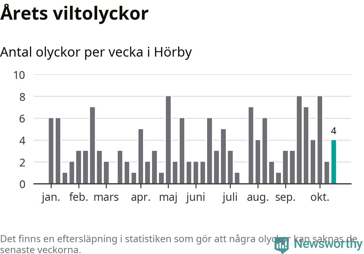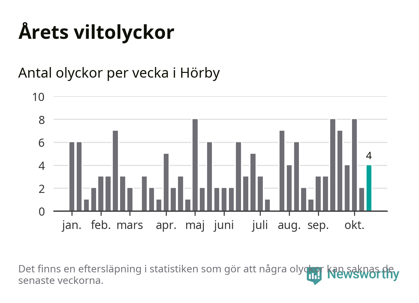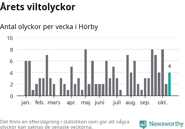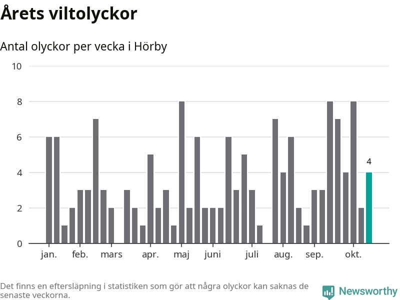 Hittills har fyra viltolyckor rapporterats in i Hörby kommun från vecka 43. Se listan här.