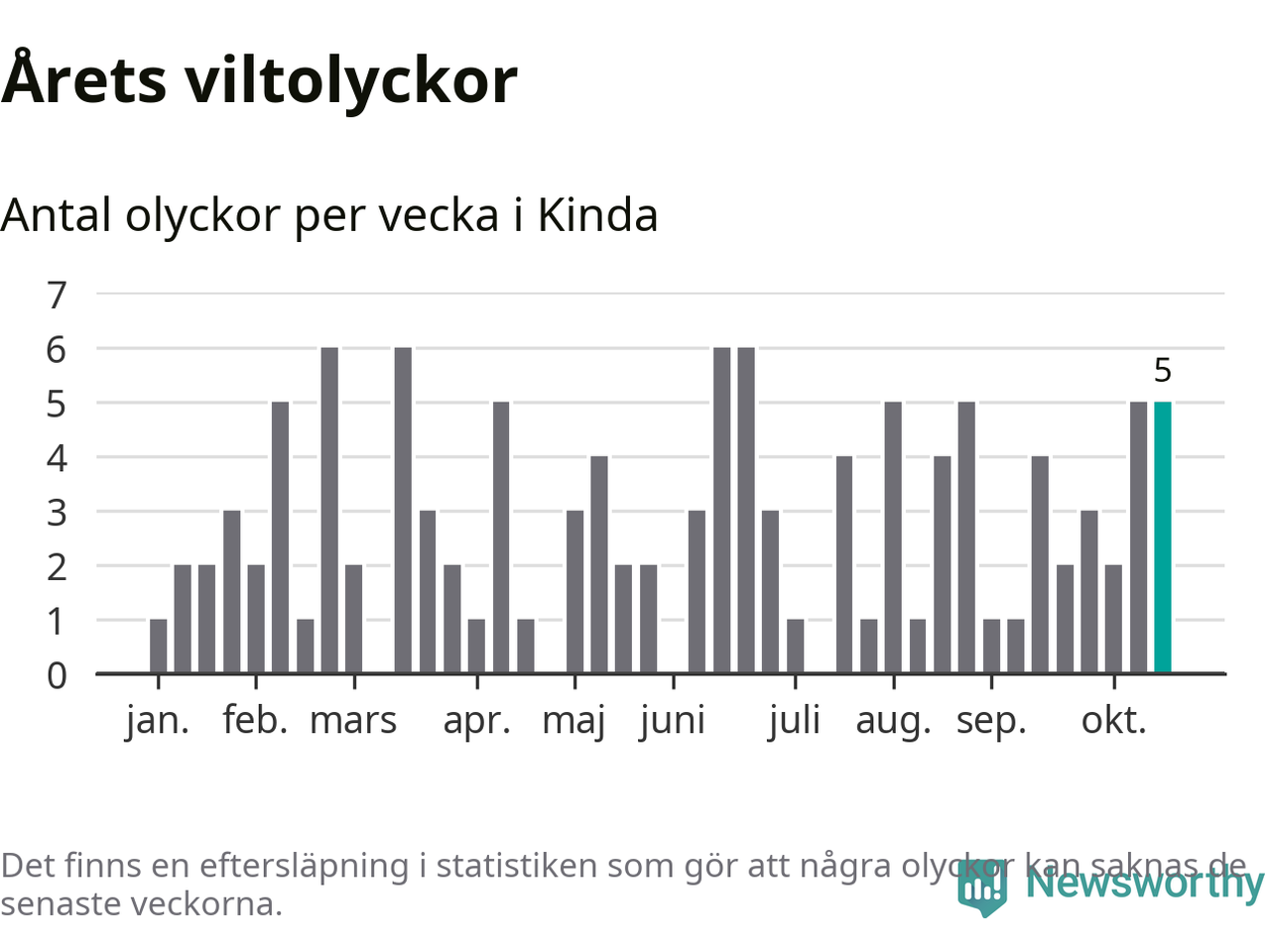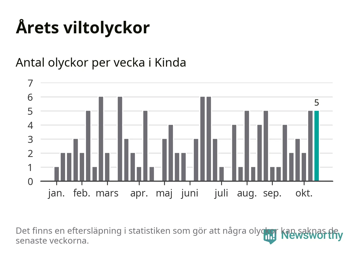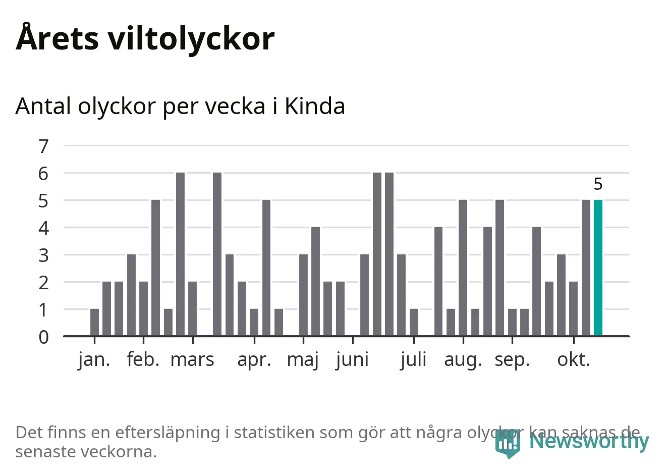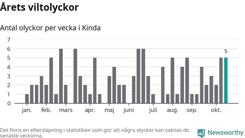 Hittills har fem viltolyckor rapporterats in i Kinda kommun från vecka 43. Se listan här.