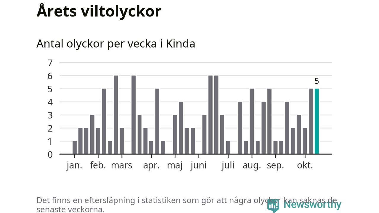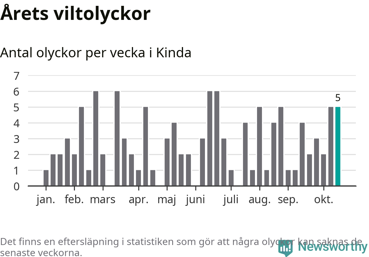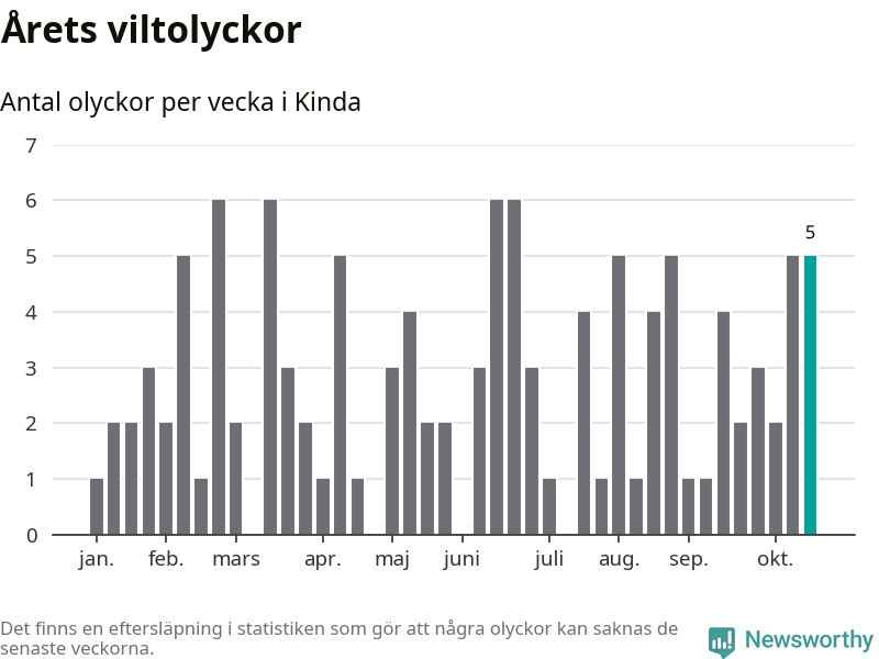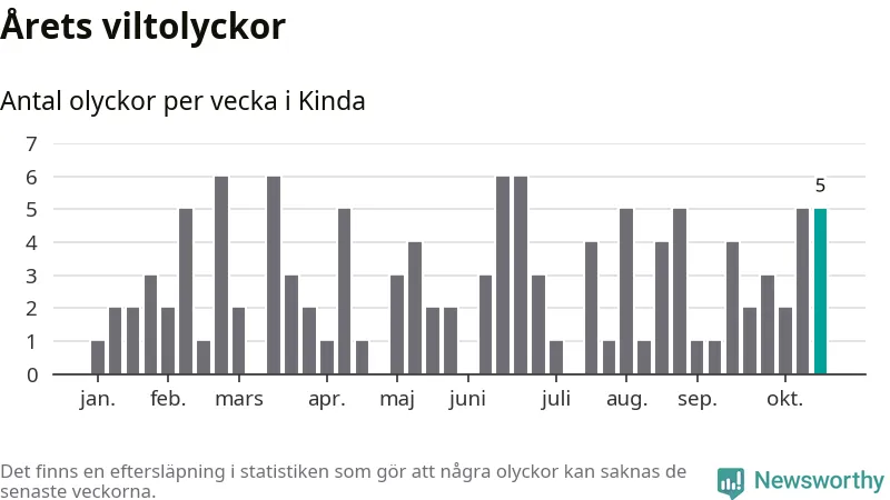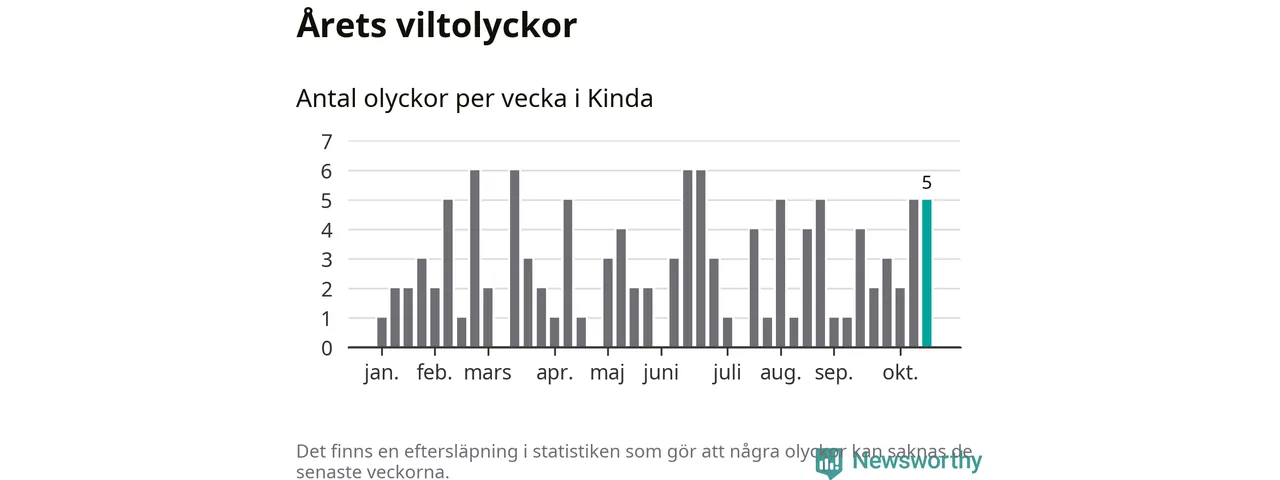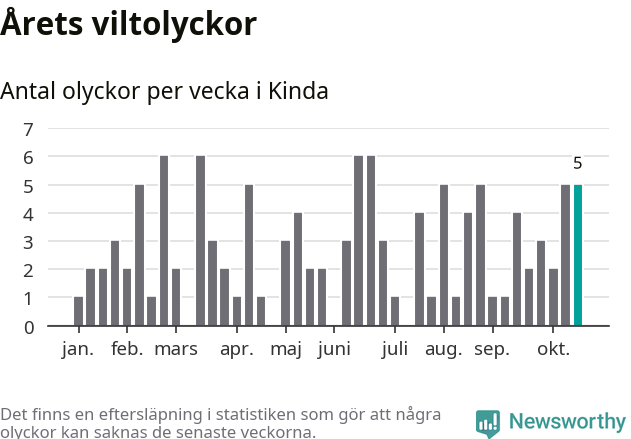 Hittills har fem viltolyckor rapporterats in i Kinda kommun från vecka 43. Se listan här.