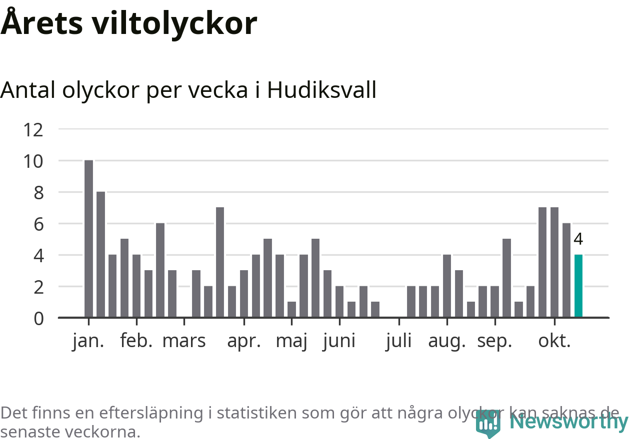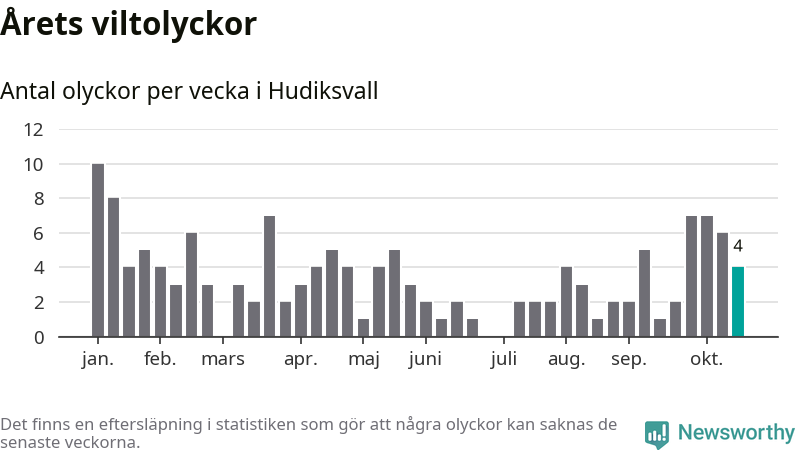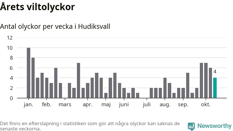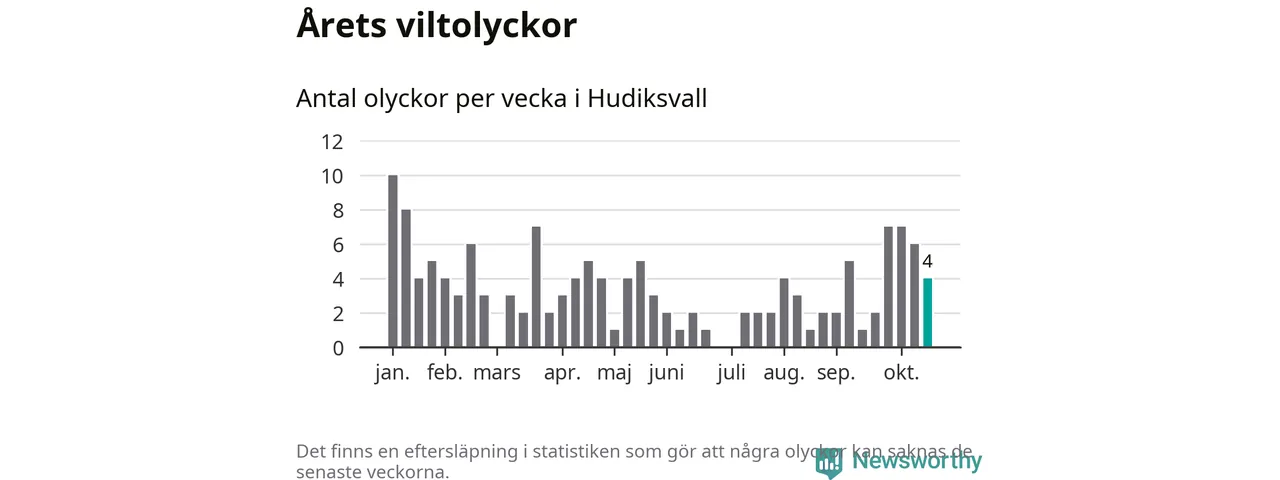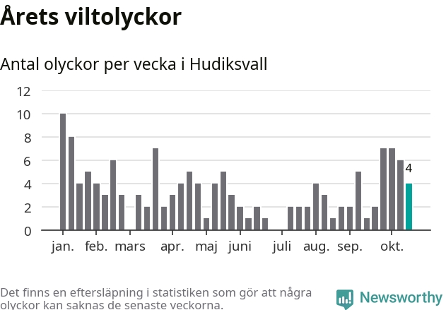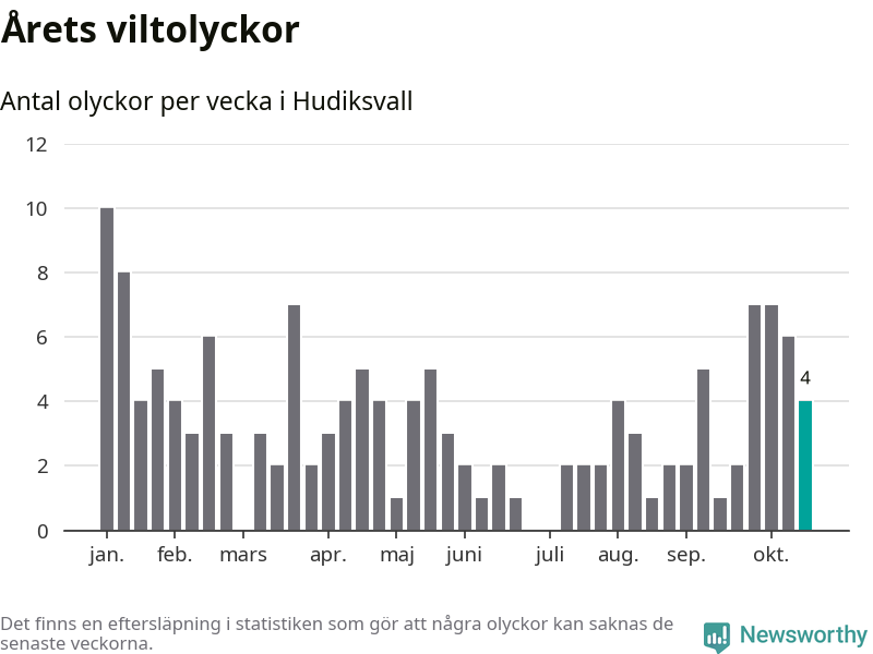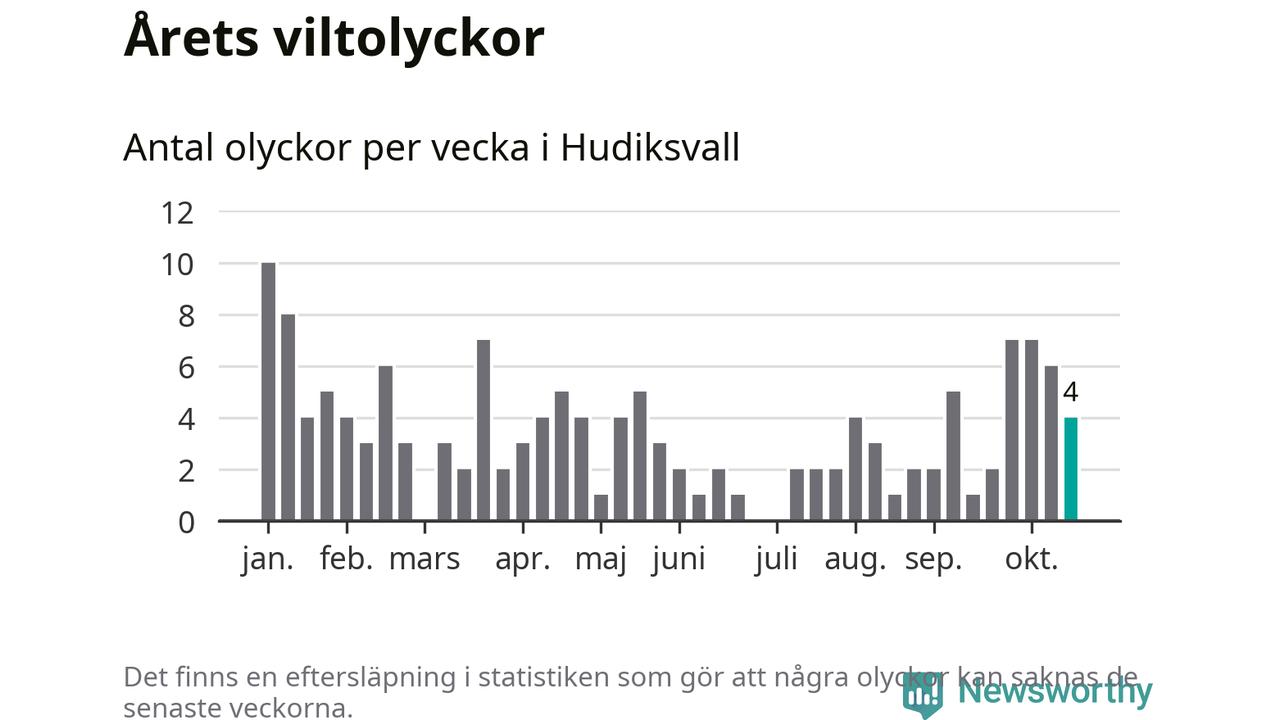 Hittills har fyra viltolyckor rapporterats in i Hudiksvalls kommun från vecka 43. Se listan här.