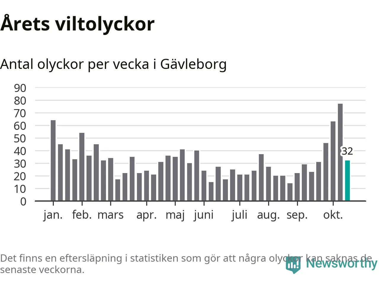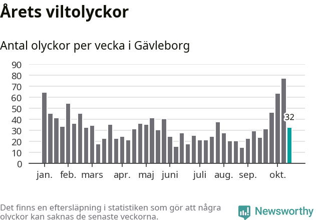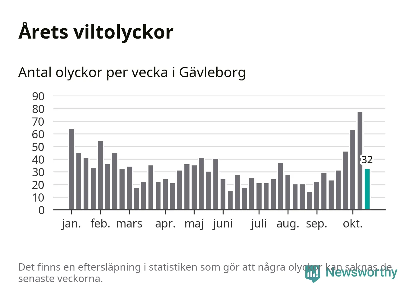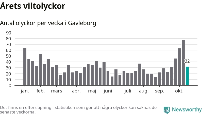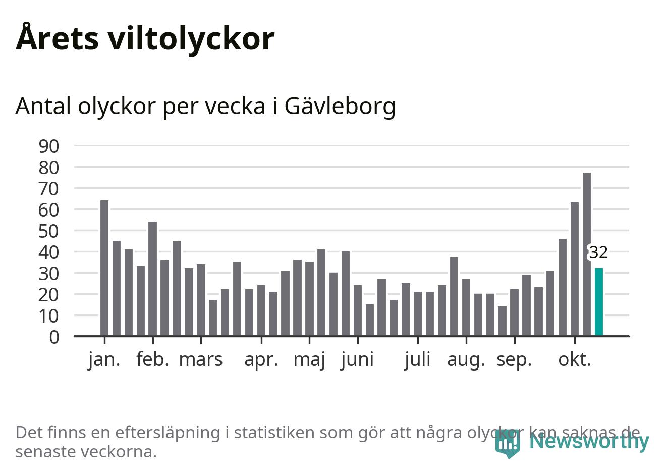 Hittills har 32 viltolyckor rapporterats in i Gävleborgs län från vecka 43. Se listan här.