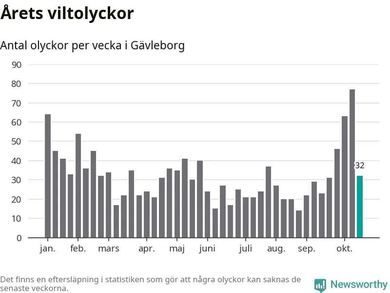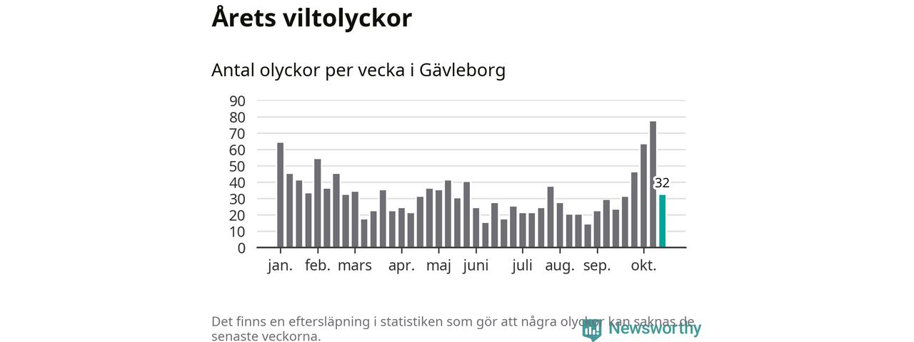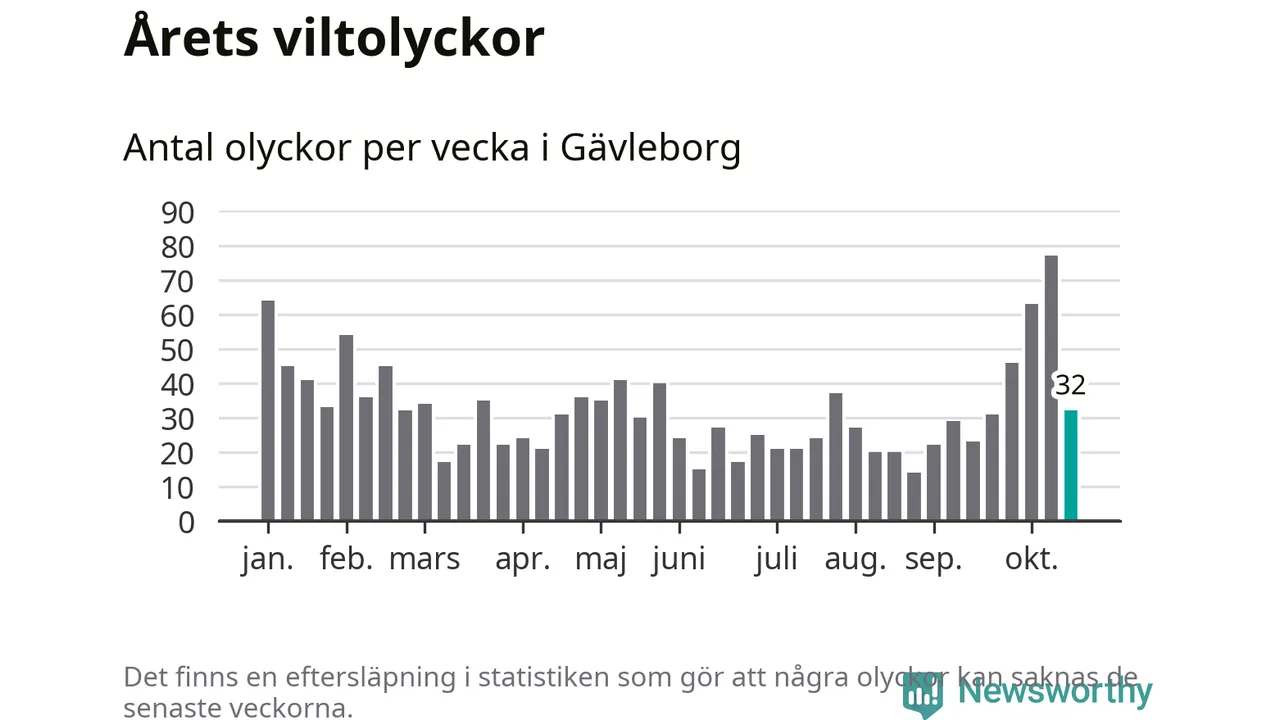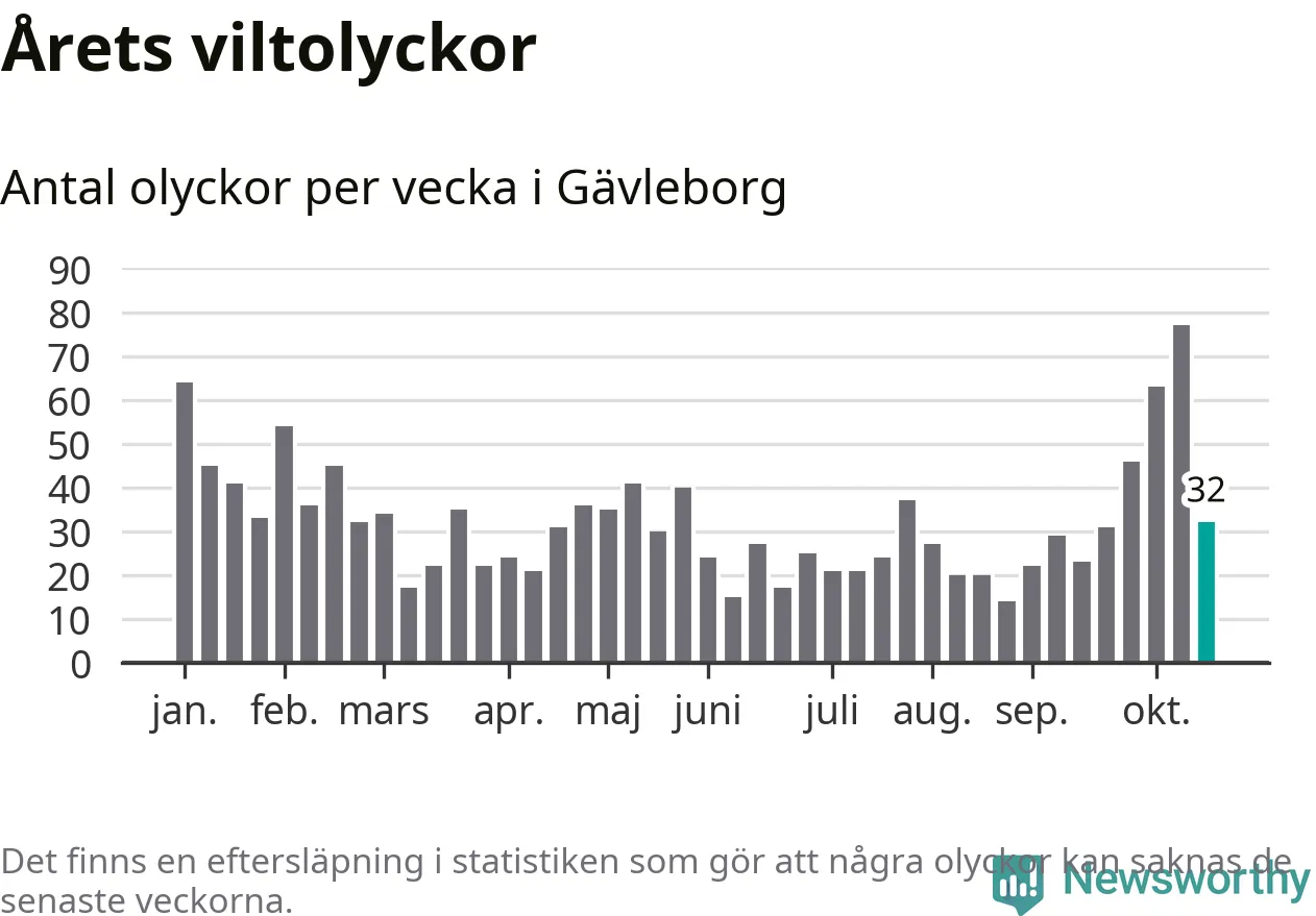 Hittills har 32 viltolyckor rapporterats in i Gävleborgs län från vecka 43. Se listan här.