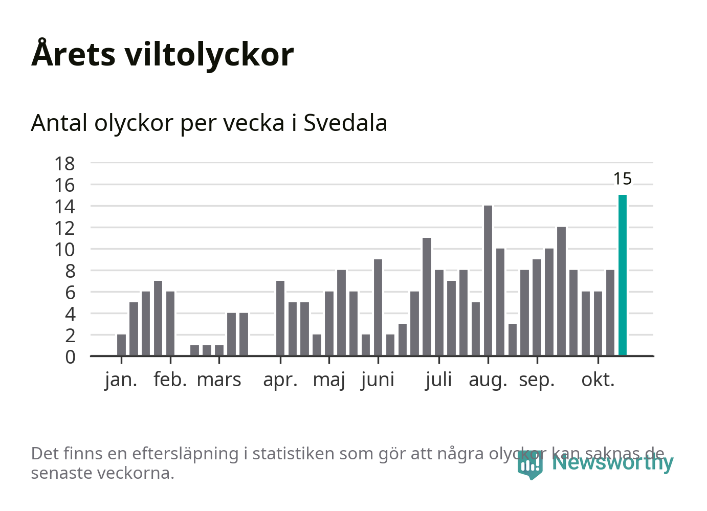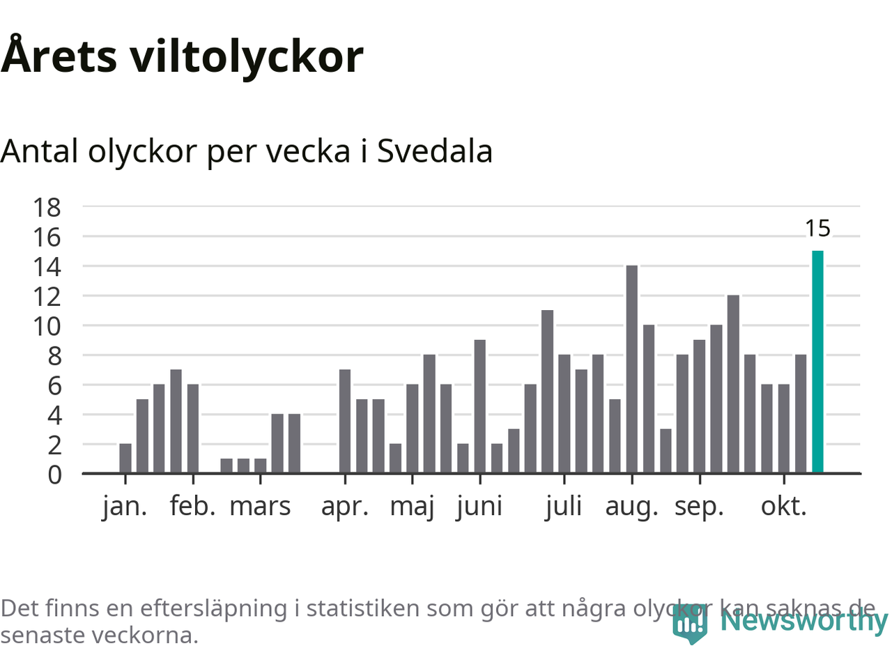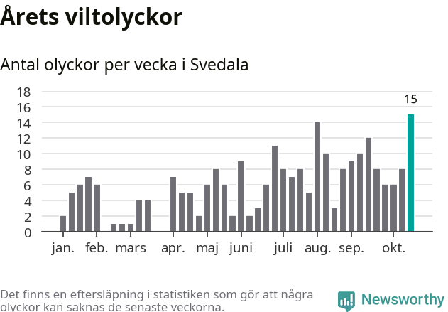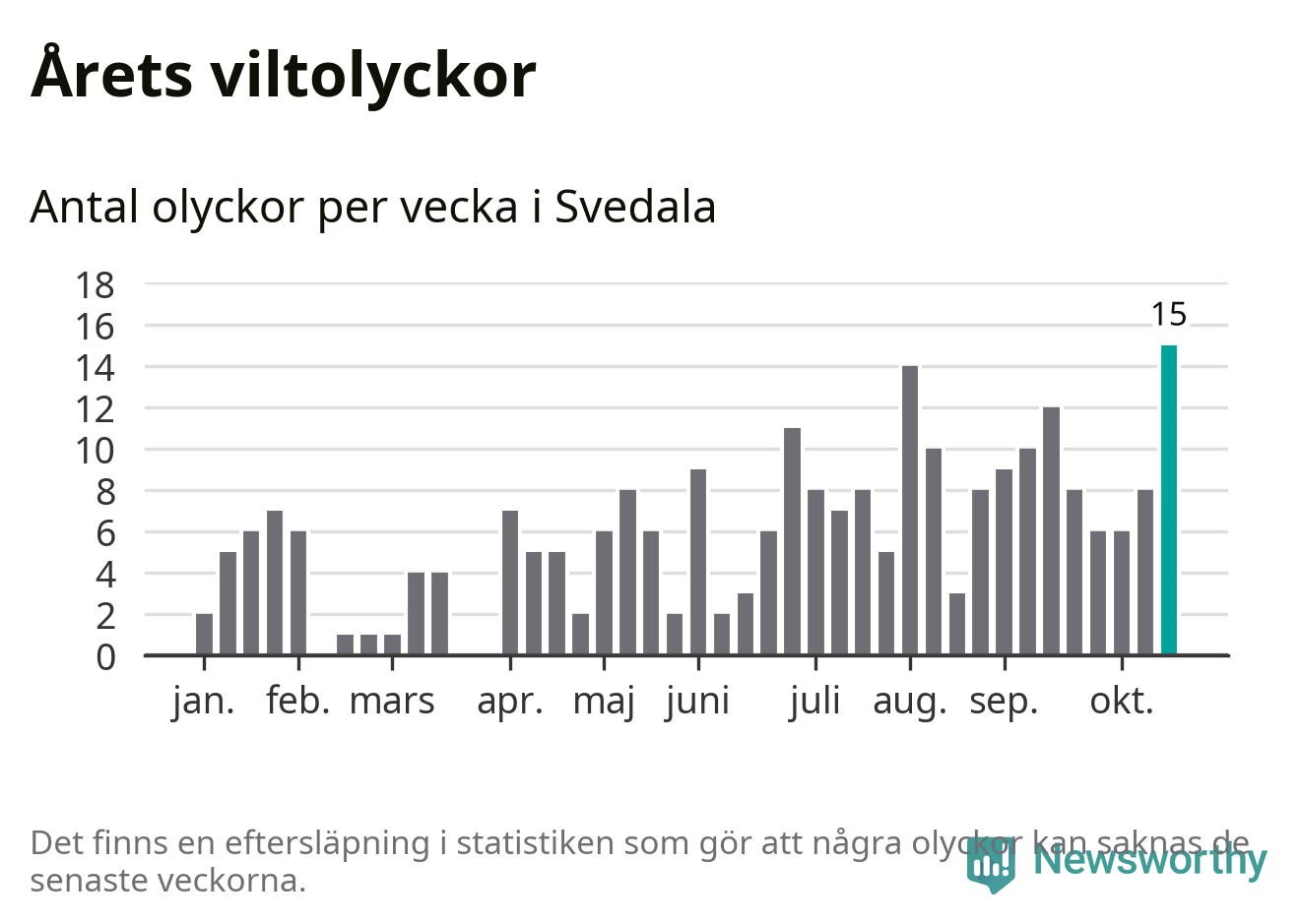 Under vecka 43 rapporterades 15 viltolyckor in i Svedala kommun. Det är det största antalet på en enskild vecka hittills i år.