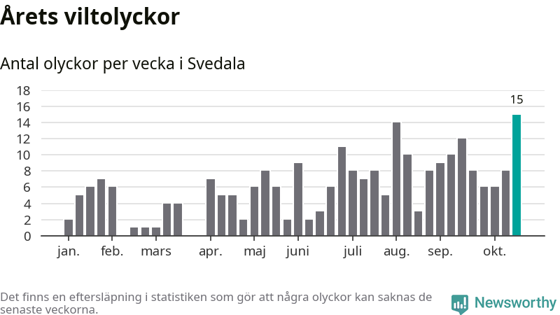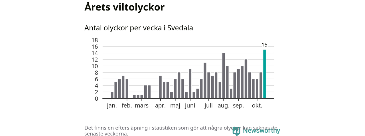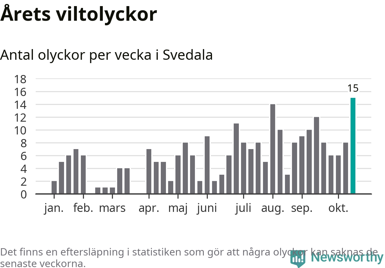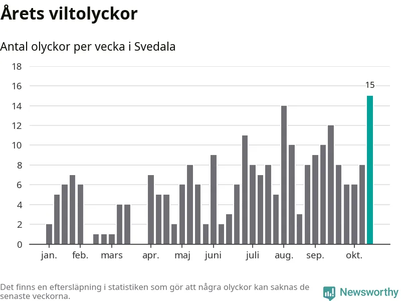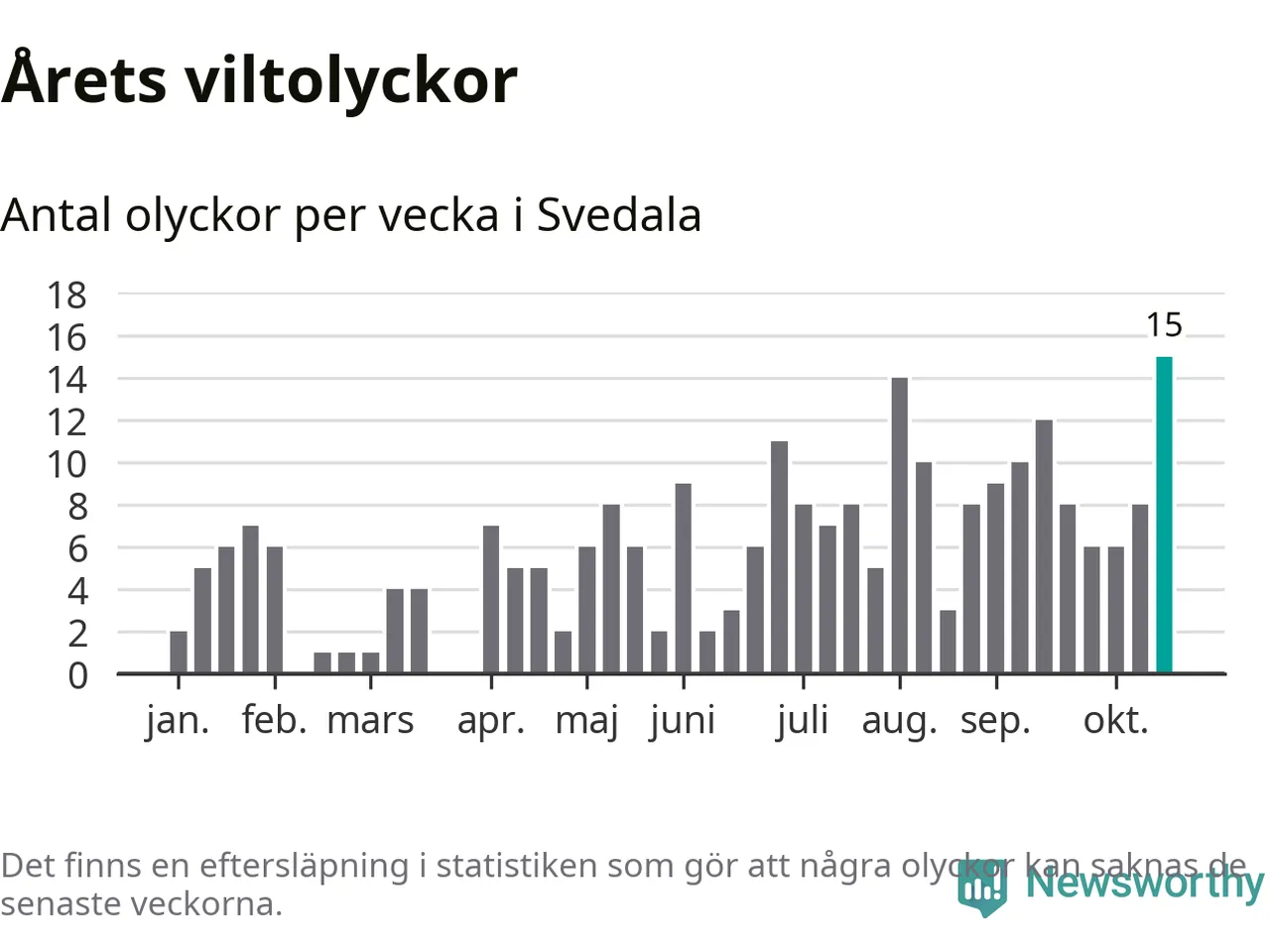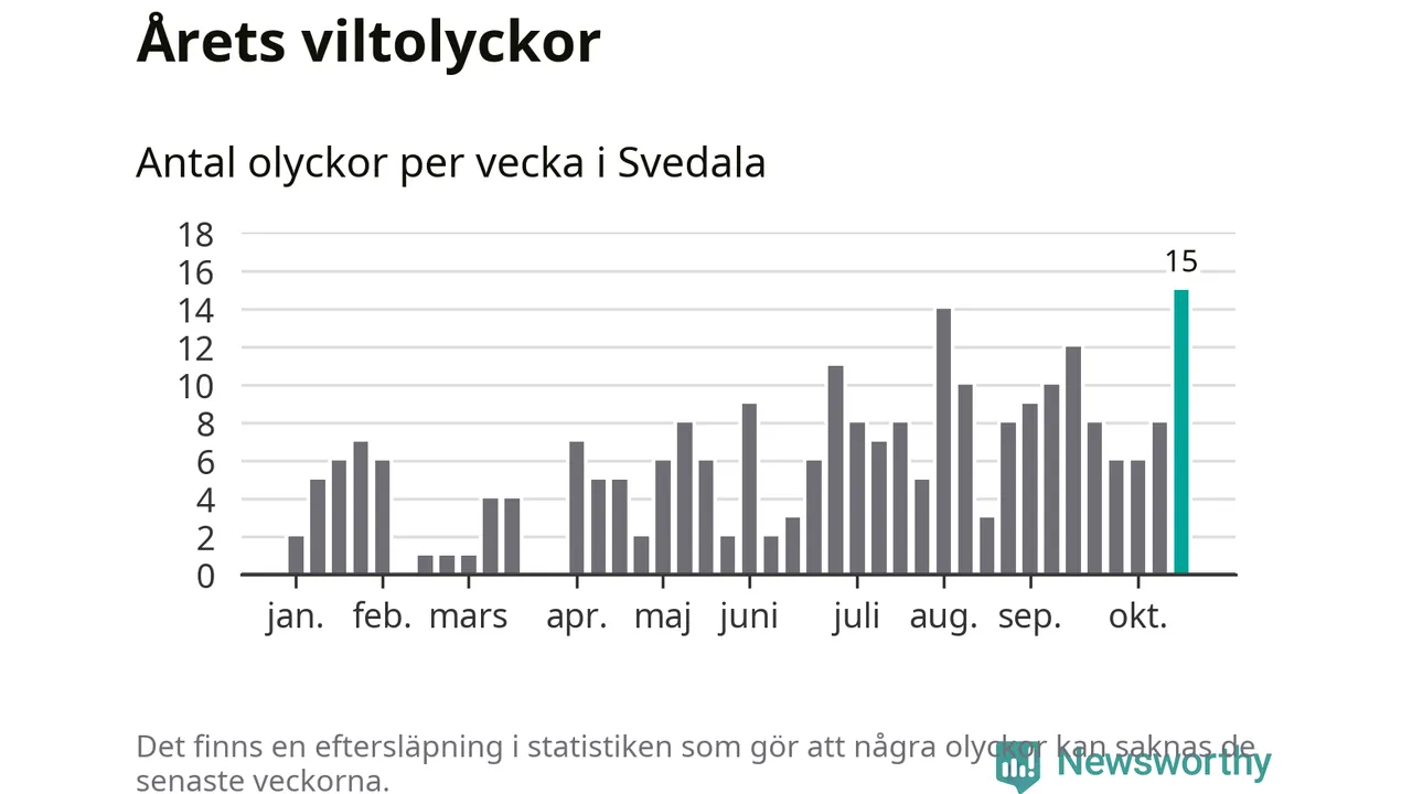 Under vecka 43 rapporterades 15 viltolyckor in i Svedala kommun. Det är det största antalet på en enskild vecka hittills i år.