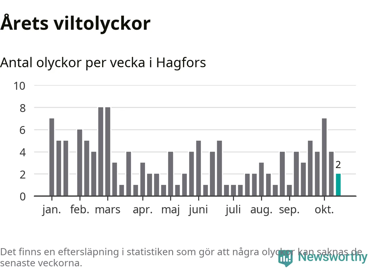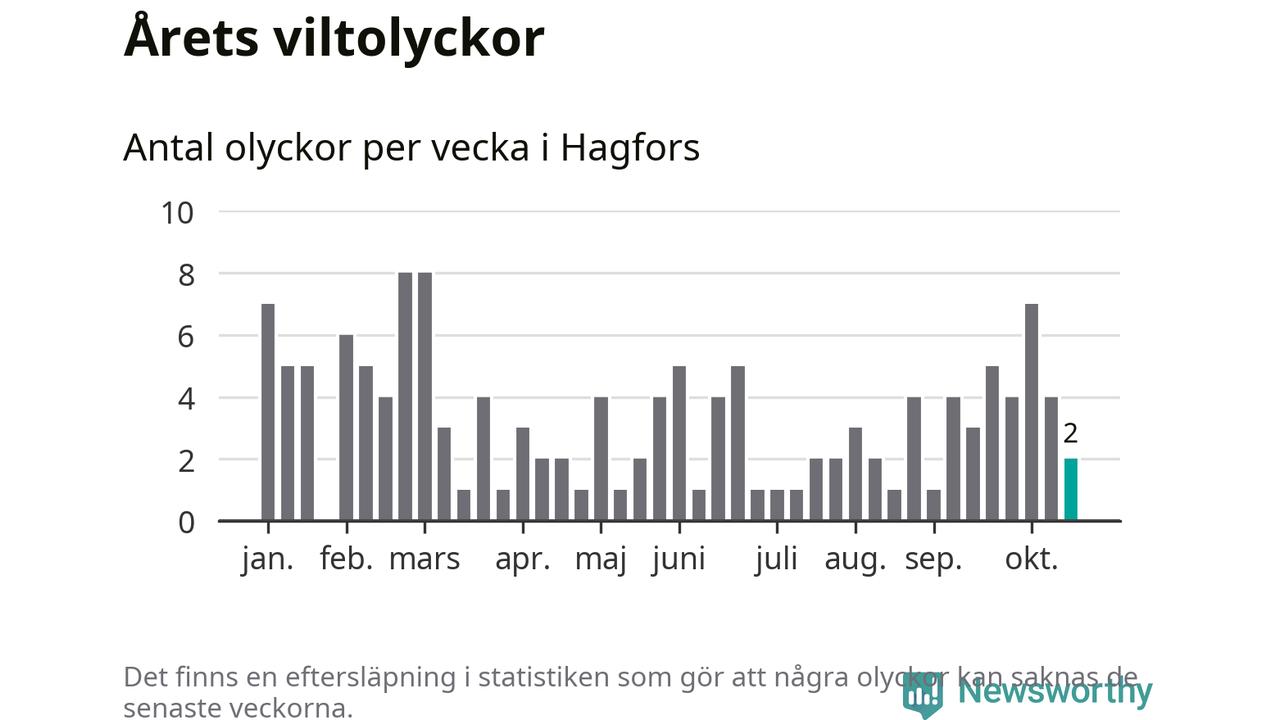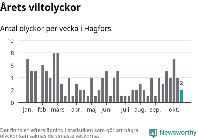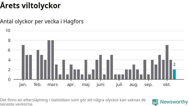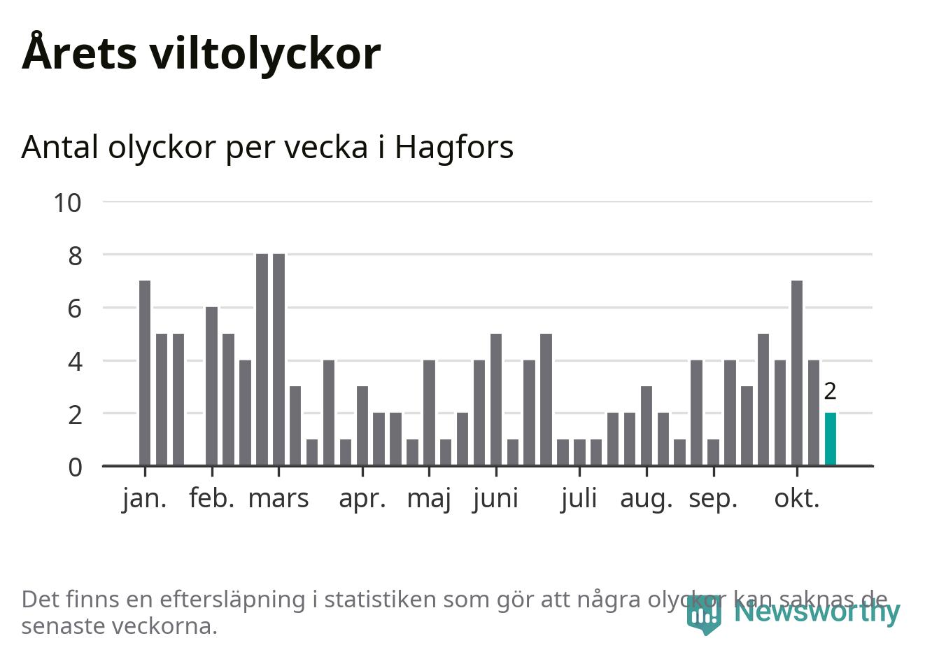 Hittills har två viltolyckor rapporterats in i Hagfors kommun från vecka 43. Se listan här.